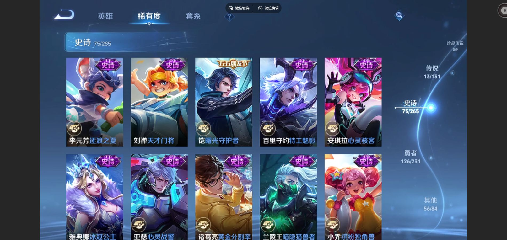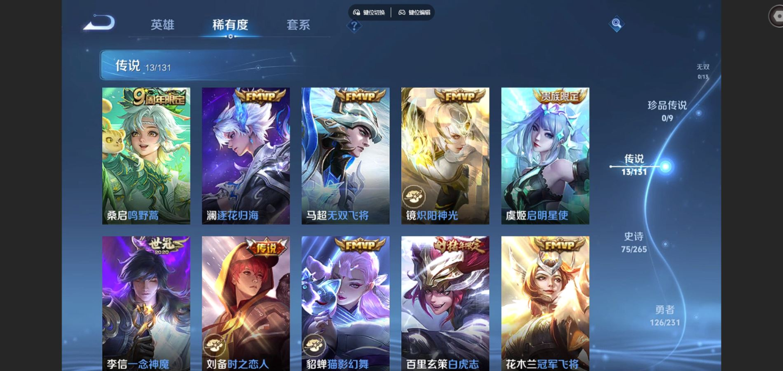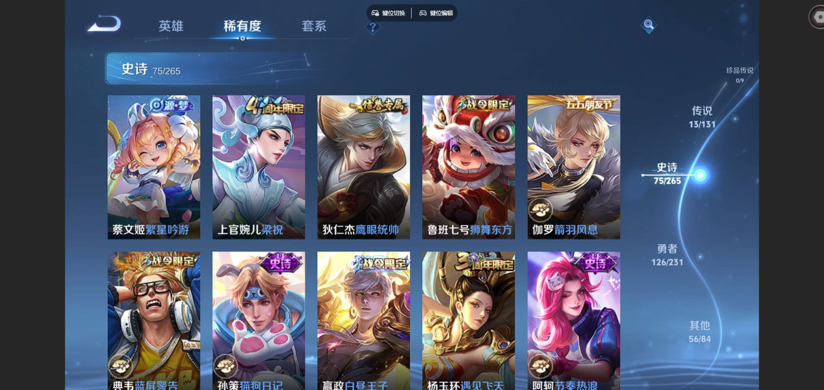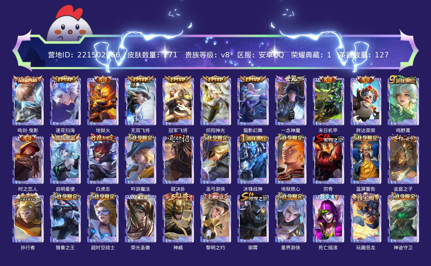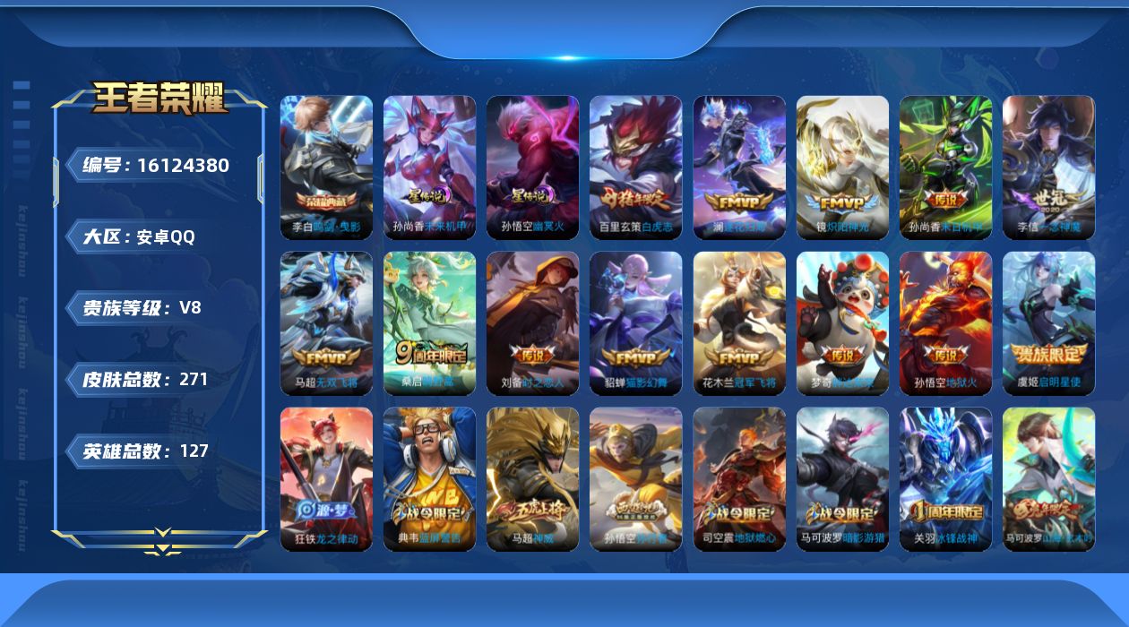 贵族等级:v8皮肤数:271传说品质13 情人节限定1 生肖限定2 荣耀典藏1 英雄数:127