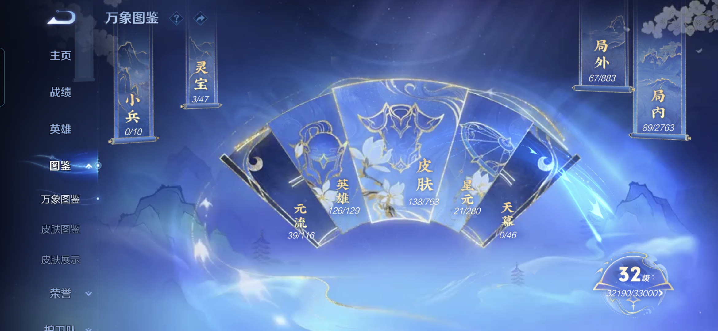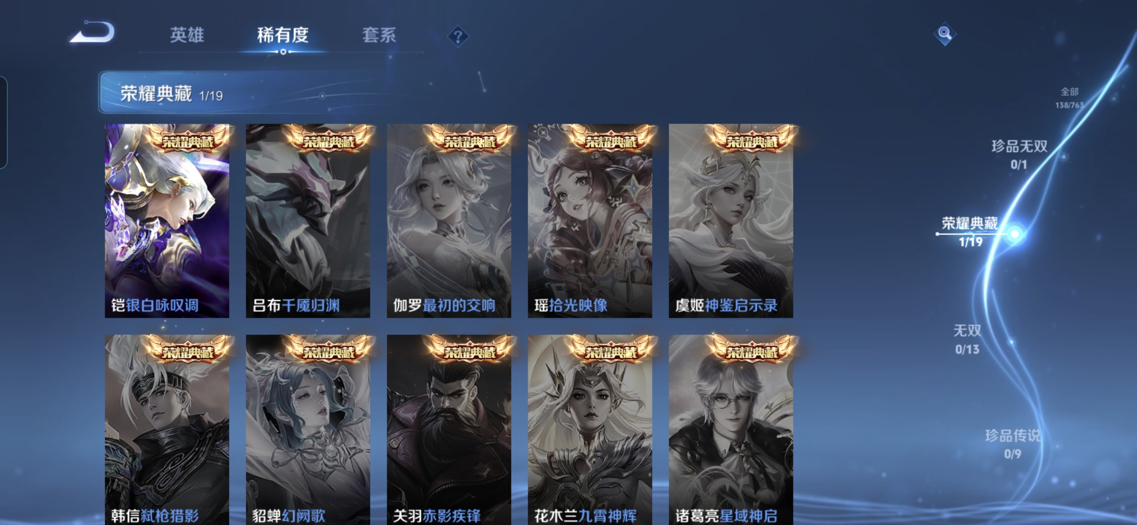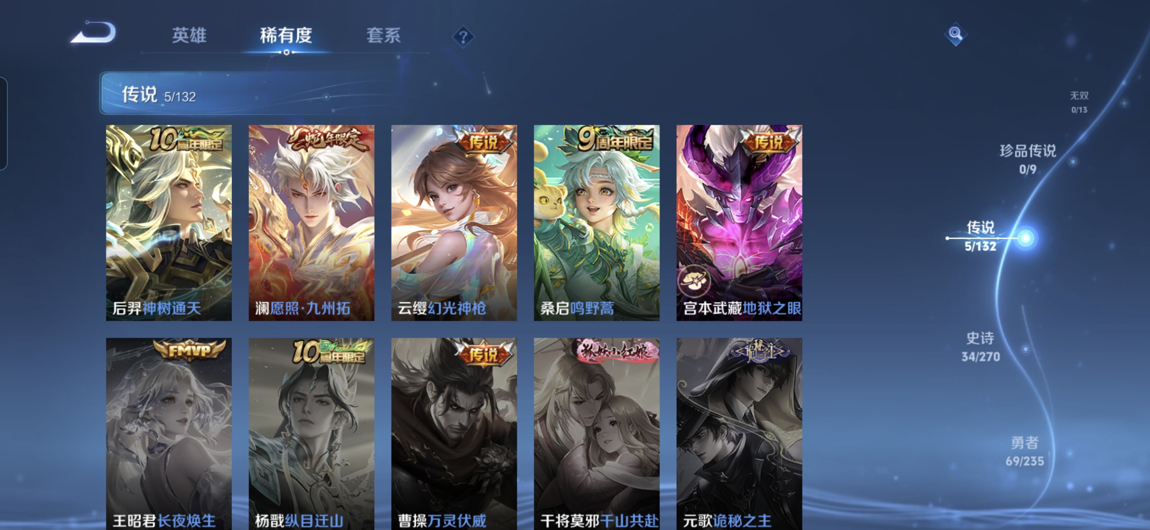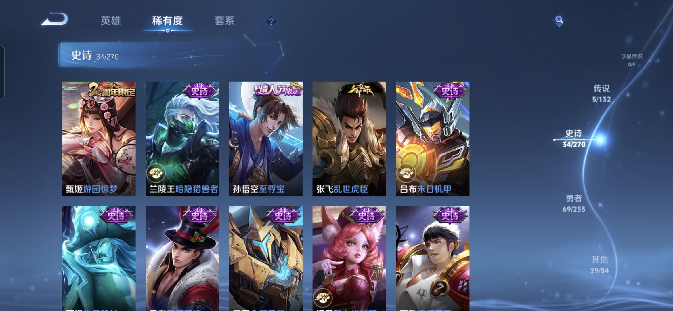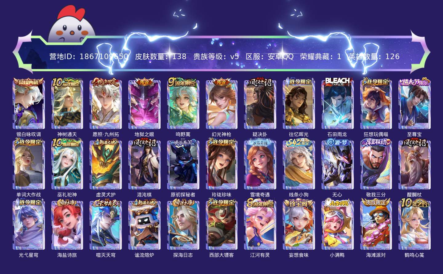 贵族等级:v5皮肤数:138传说品质5 生肖限定1 情人节限定1 荣耀典藏1 英雄数:126