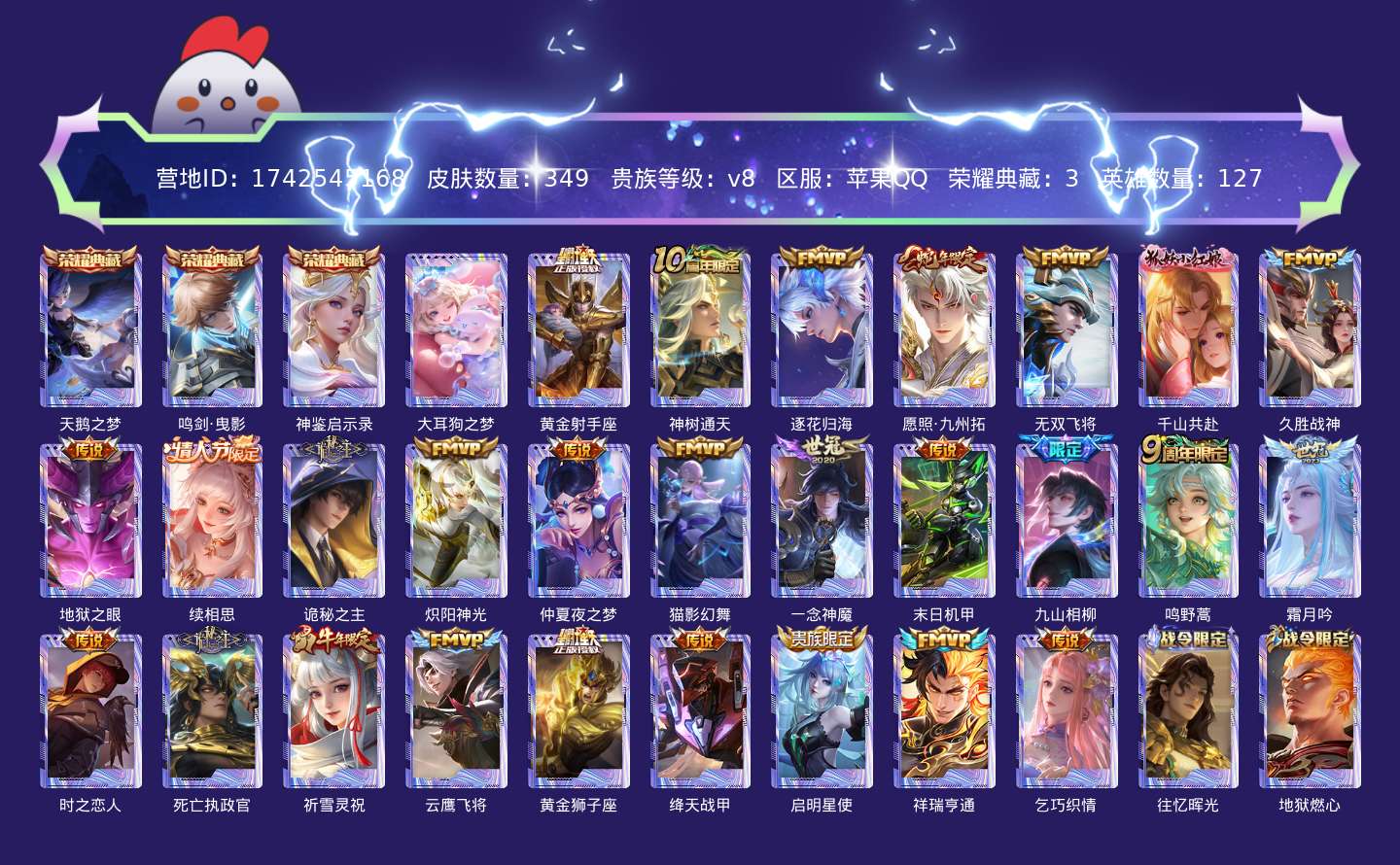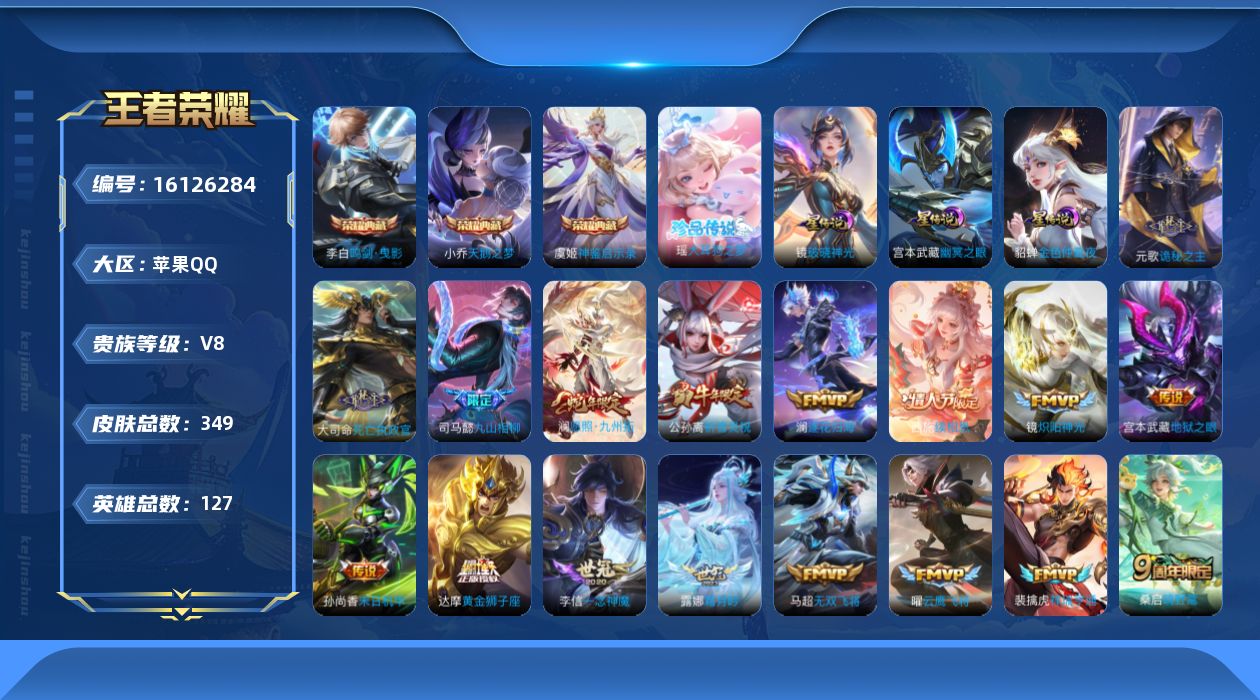 贵族等级:v8皮肤数:349传说品质27 生肖限定4 情人节限定2 荣耀典藏3 珍品传说1 英雄数:127