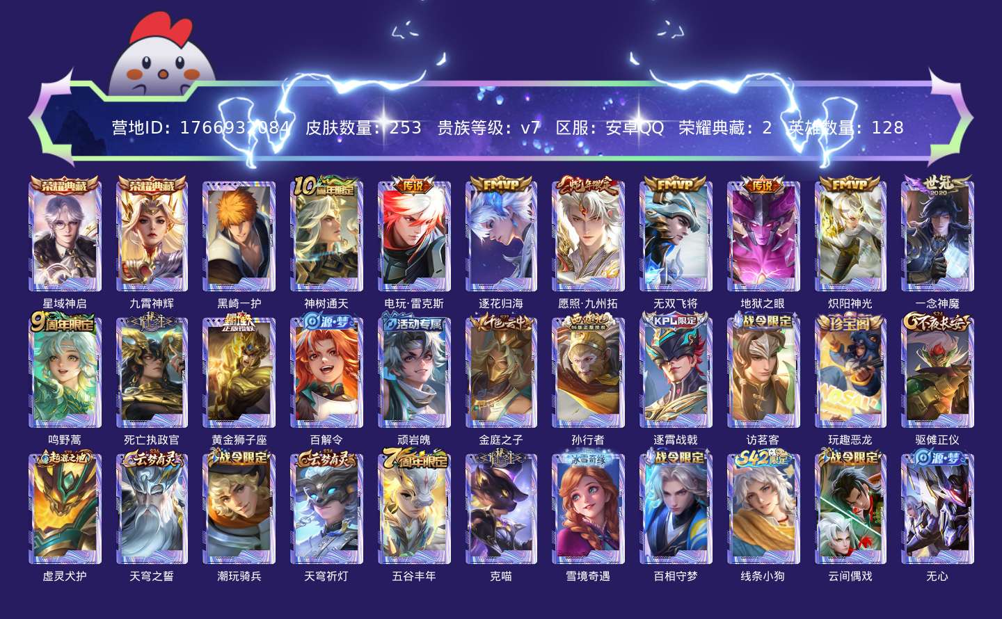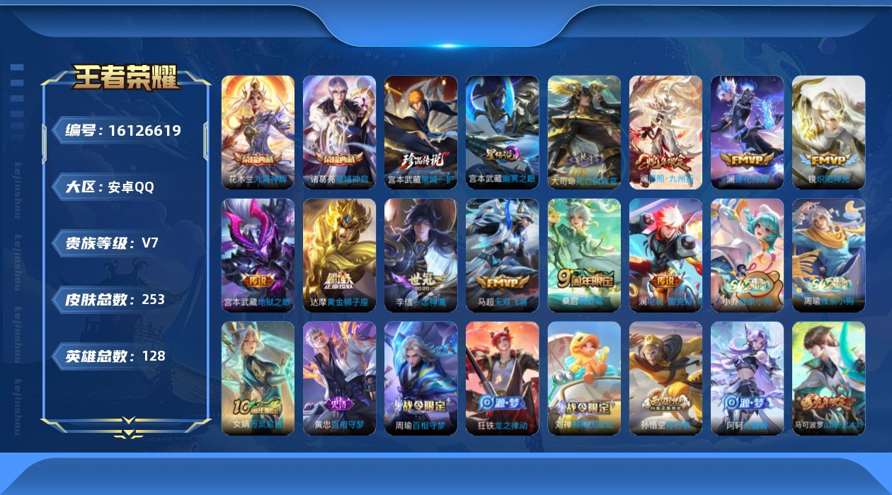 贵族等级:v7皮肤数:263传说品质11 生肖限定2 荣耀典藏2 珍品传说1 英雄数:128