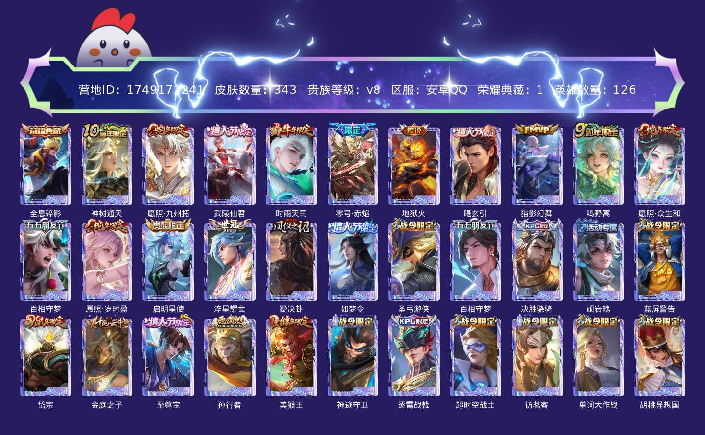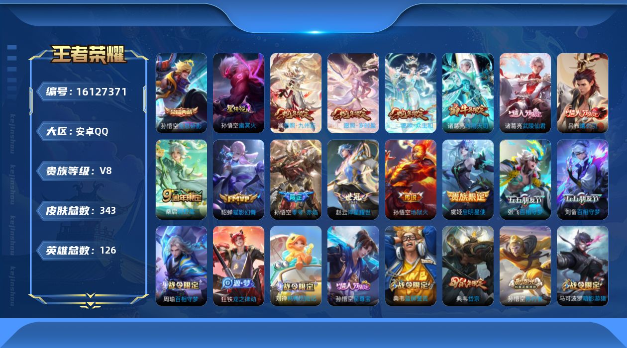 贵族等级:v8皮肤数:343情人节限定5 传说品质14 生肖限定7 荣耀典藏1 英雄数:126