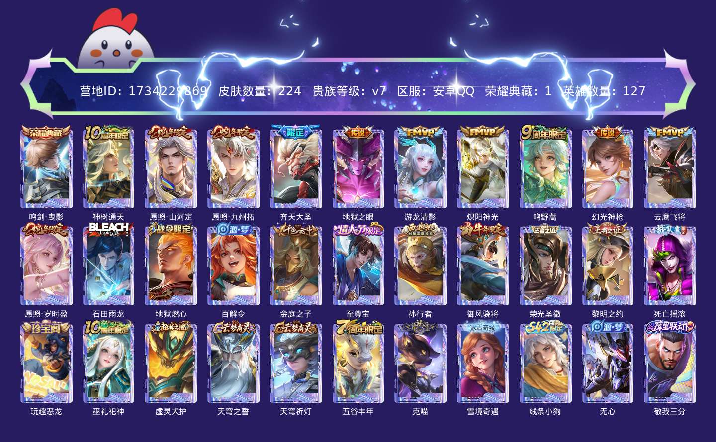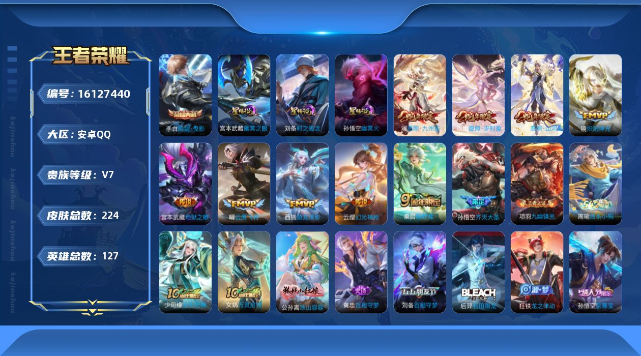 贵族等级:v7皮肤数:224传说品质11 生肖限定5 情人节限定1 荣耀典藏1 英雄数:127