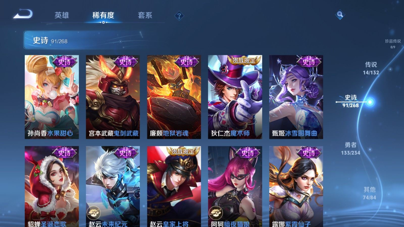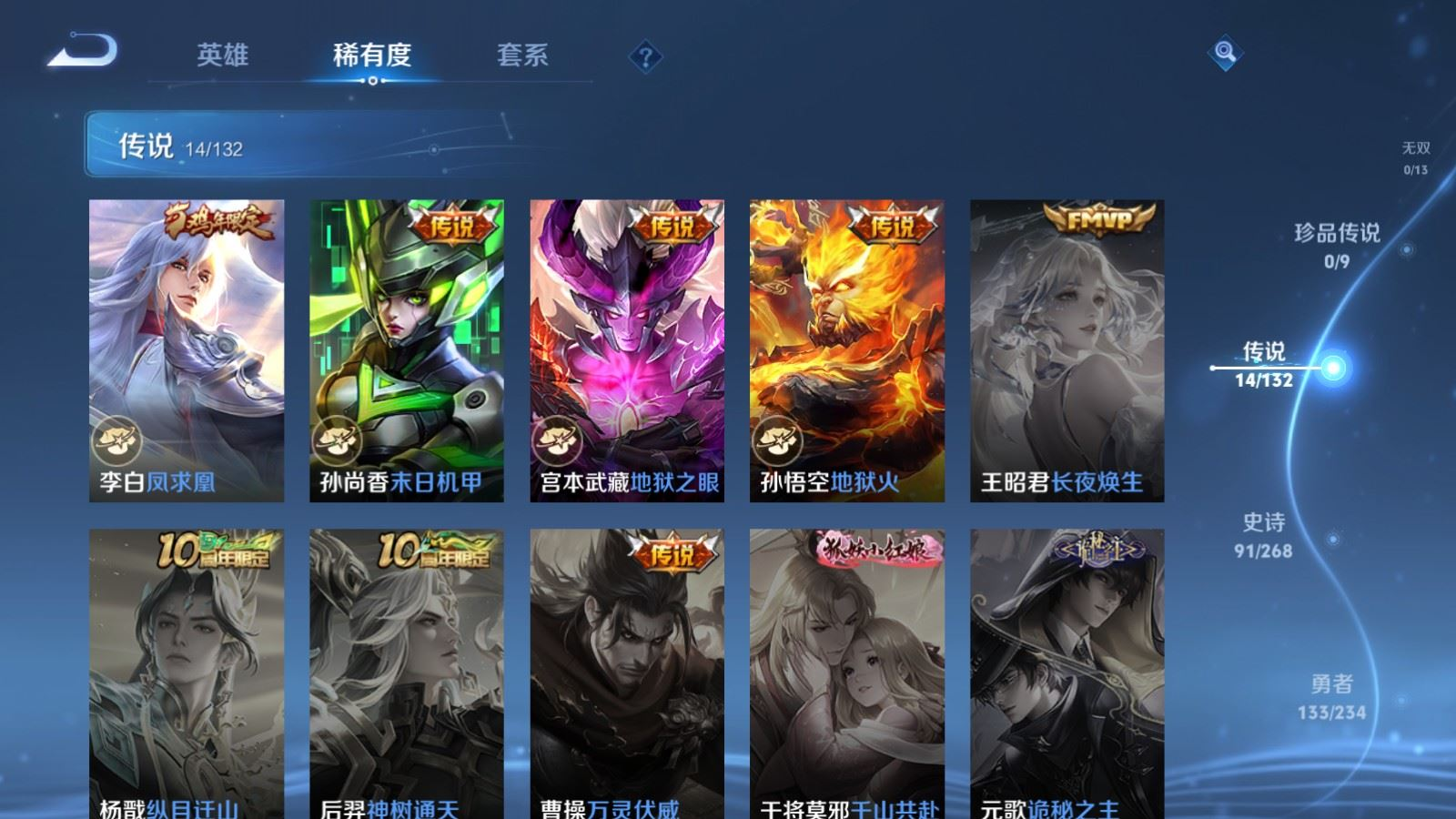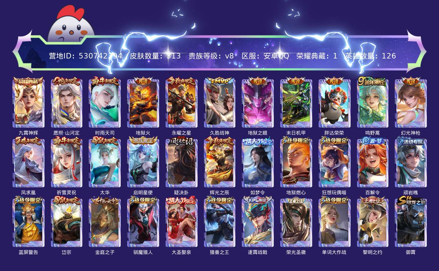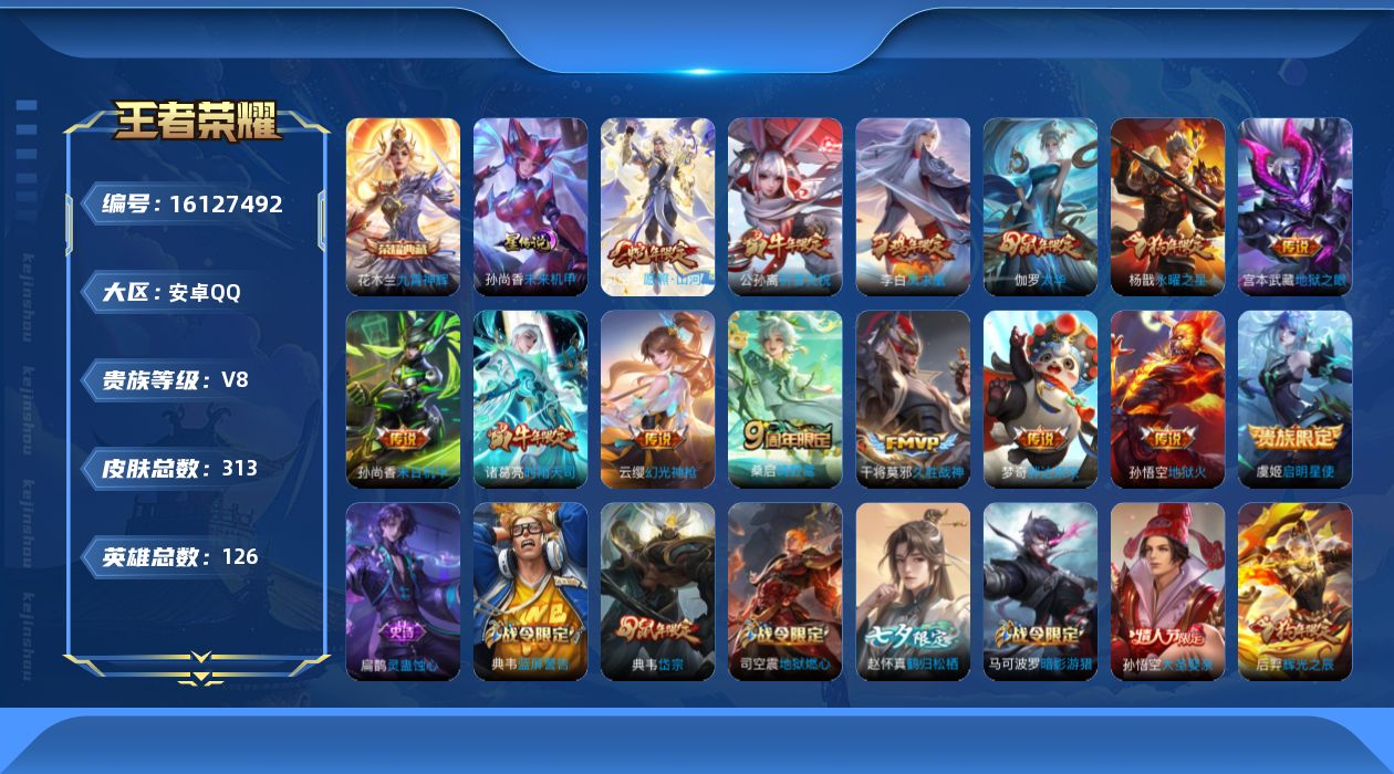 贵族等级:v8皮肤数:313生肖限定10 情人节限定2 传说品质14 荣耀典藏1 英雄数:126