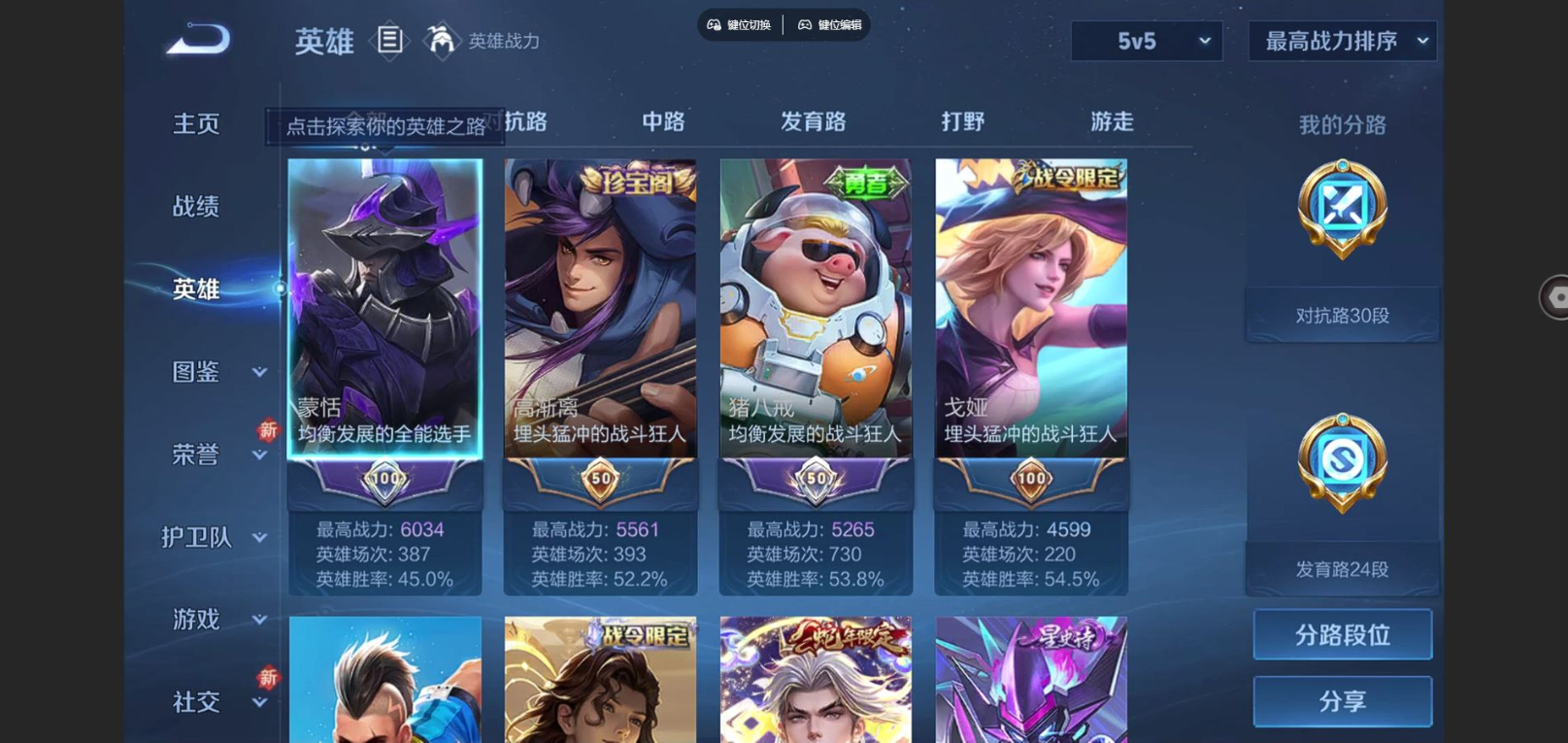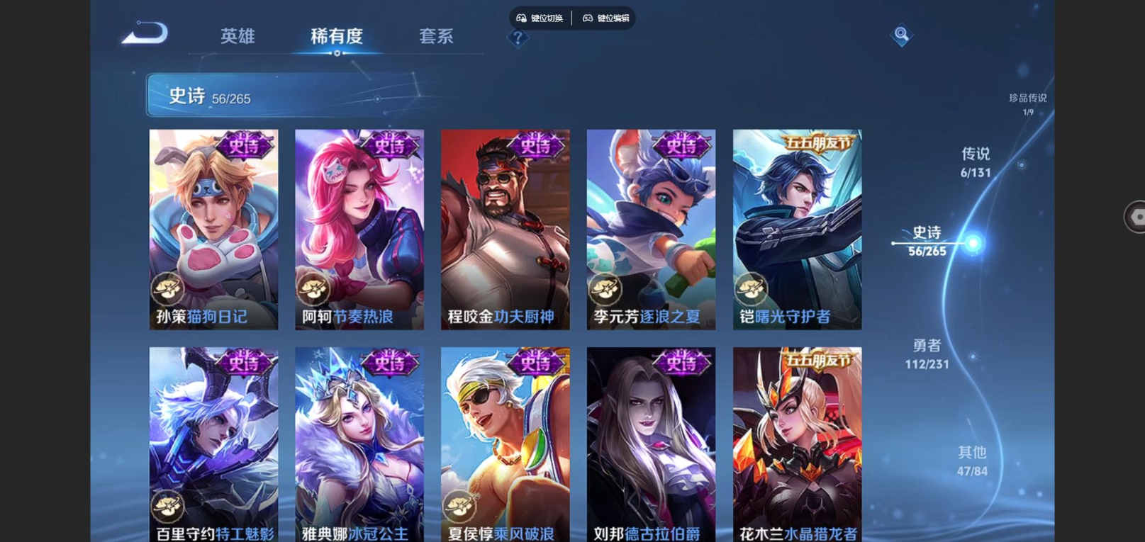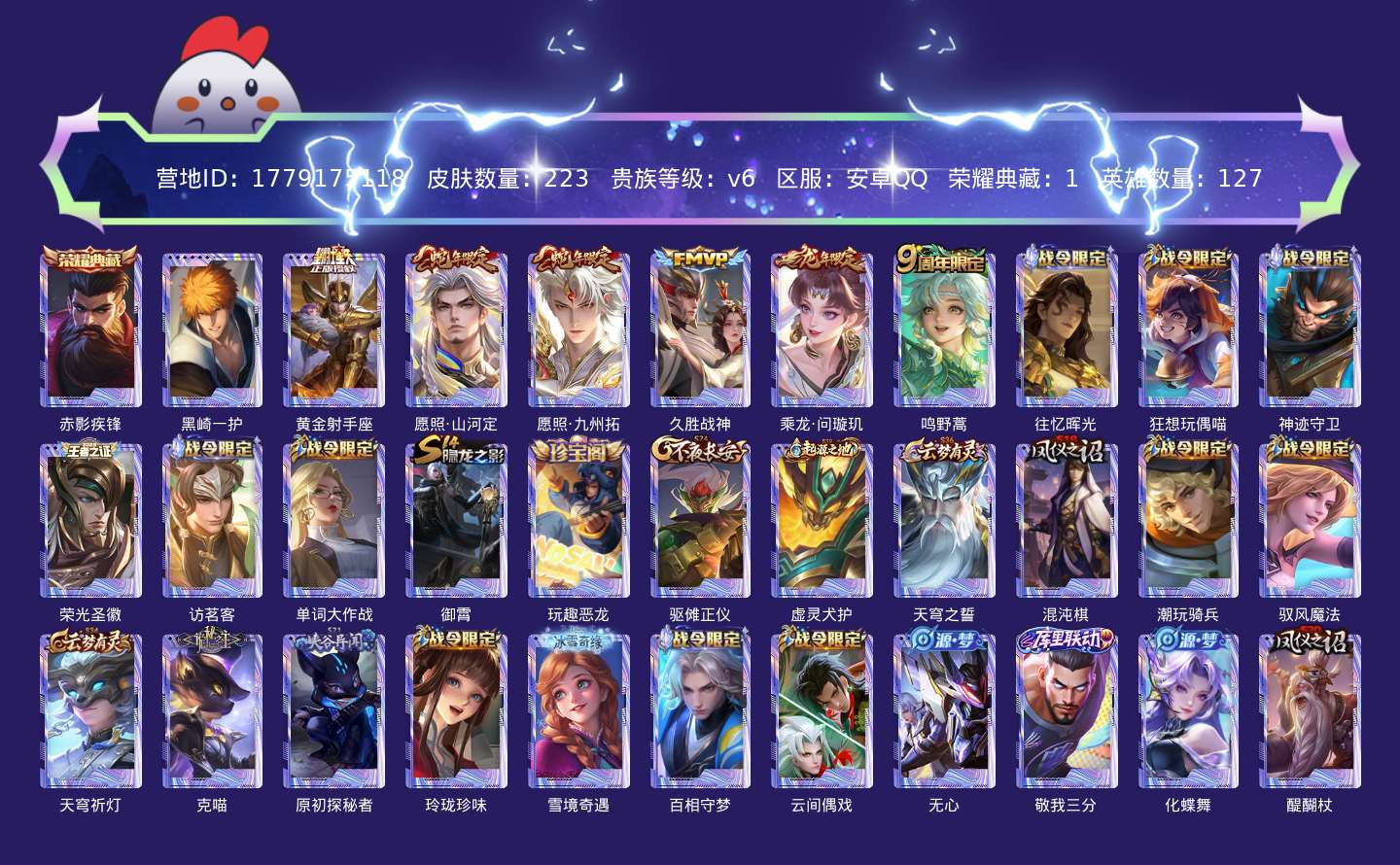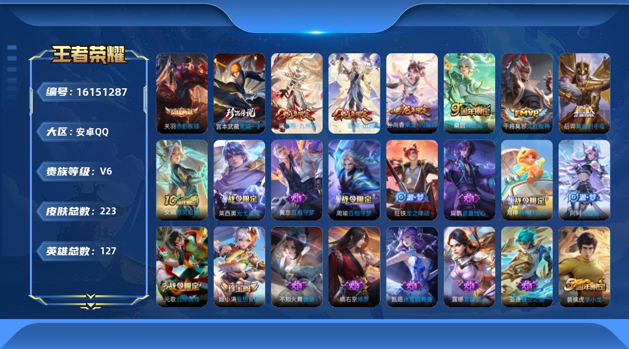 贵族等级:v6皮肤数:223传说品质6 荣耀典藏1 生肖限定3 珍品传说1 英雄数:127