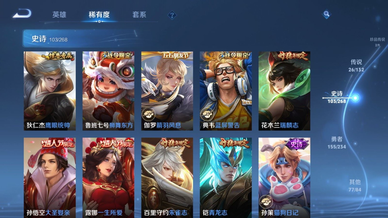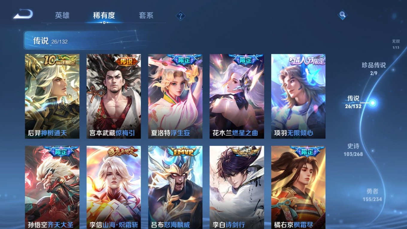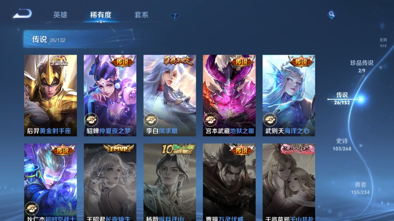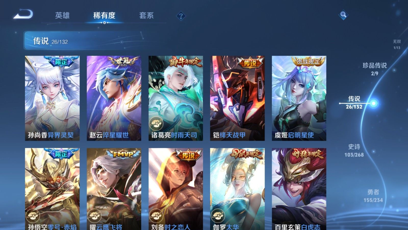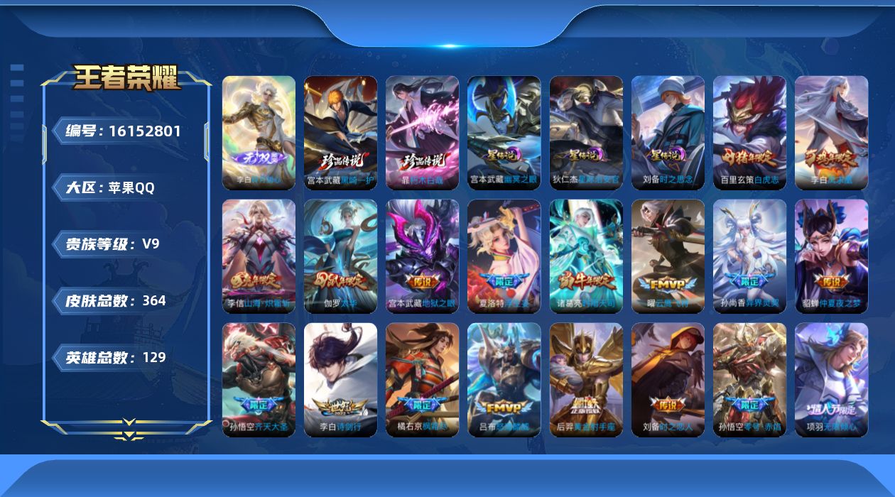 贵族等级:v9皮肤数:364传说品质26 生肖限定11 情人节限定4 珍品传说2 无双1 英雄数:129