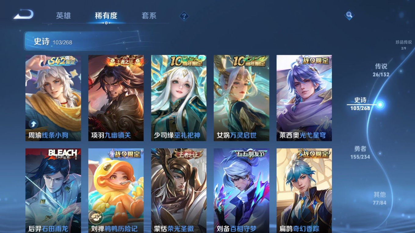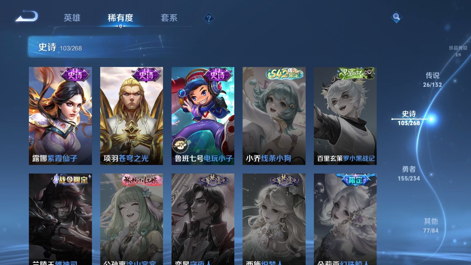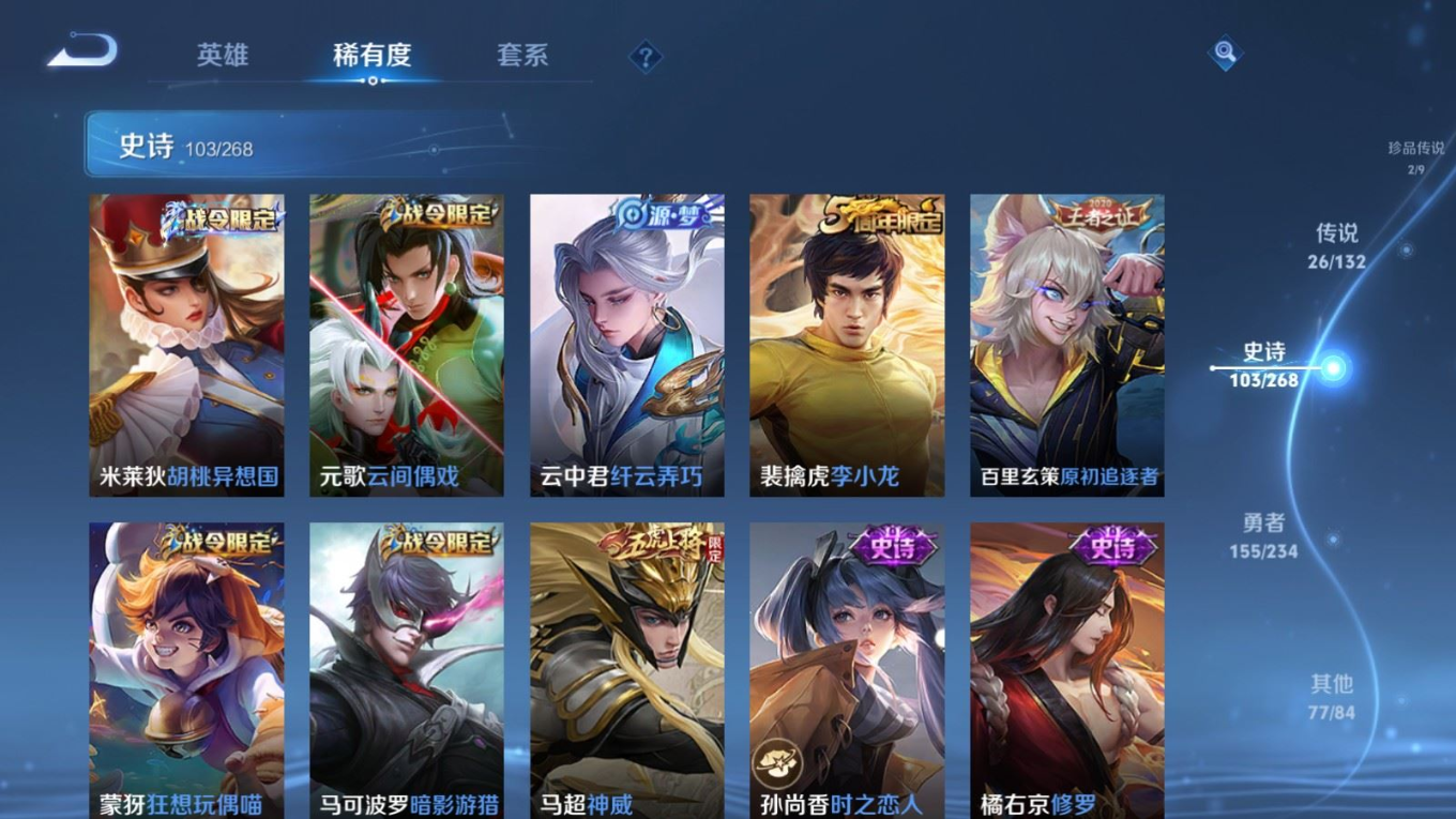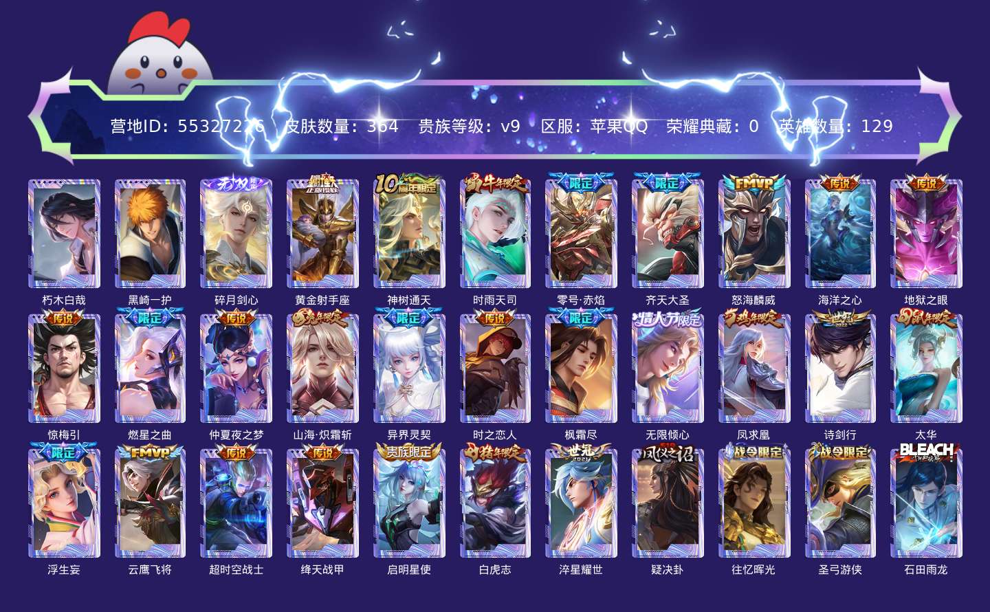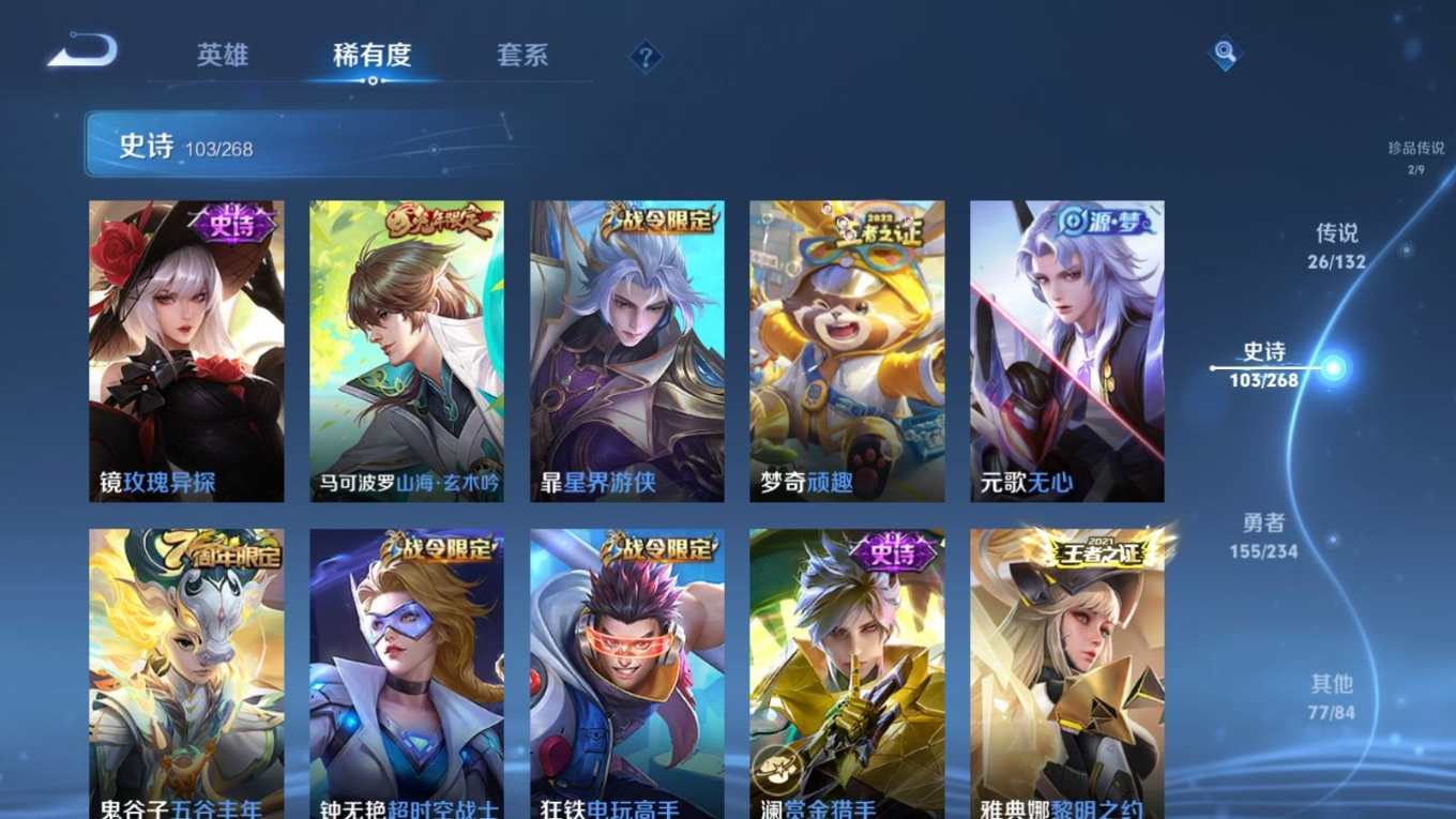 贵族等级:v9皮肤数:364传说品质26 生肖限定11 情人节限定4 珍品传说2 无双1 英雄数:129