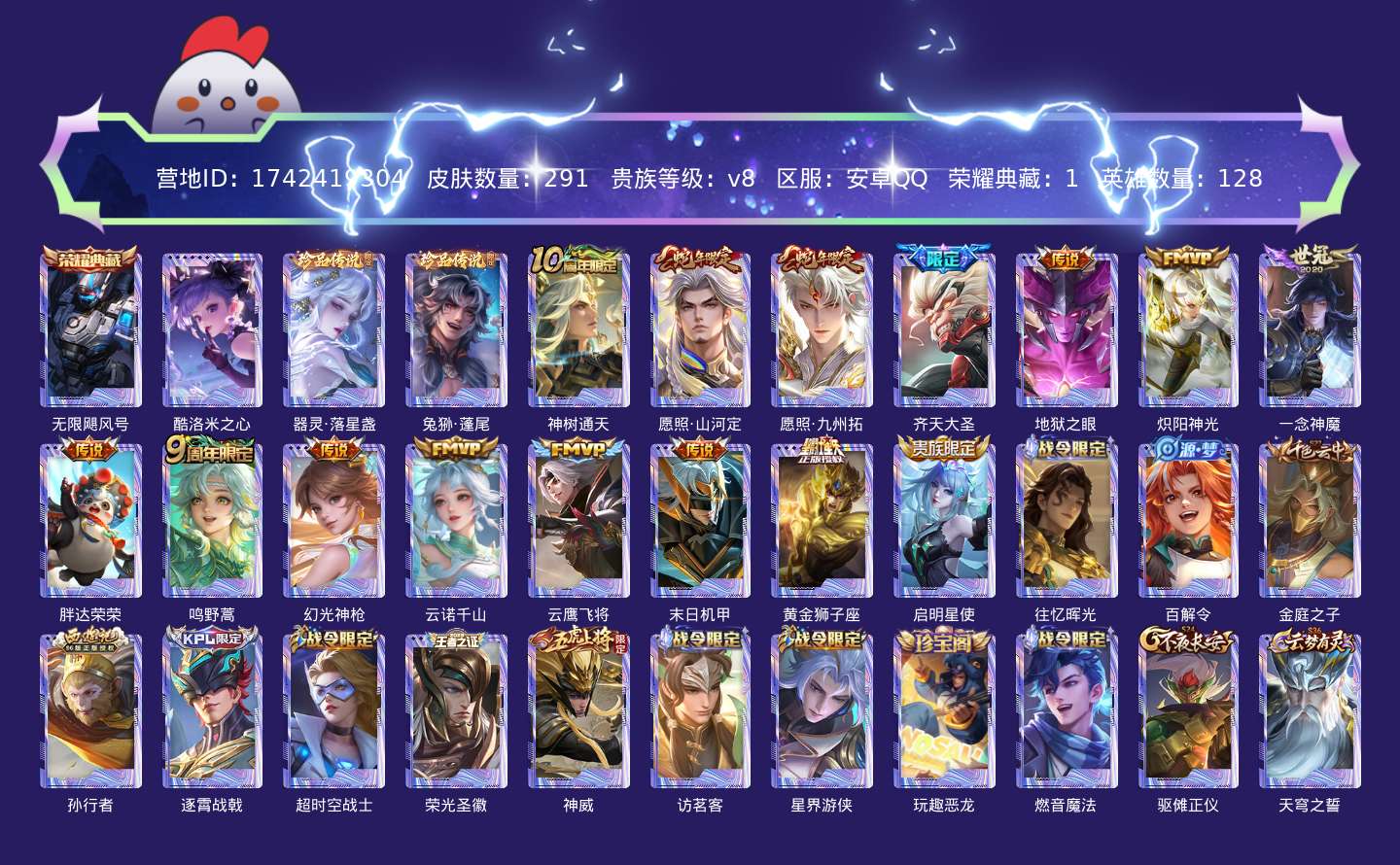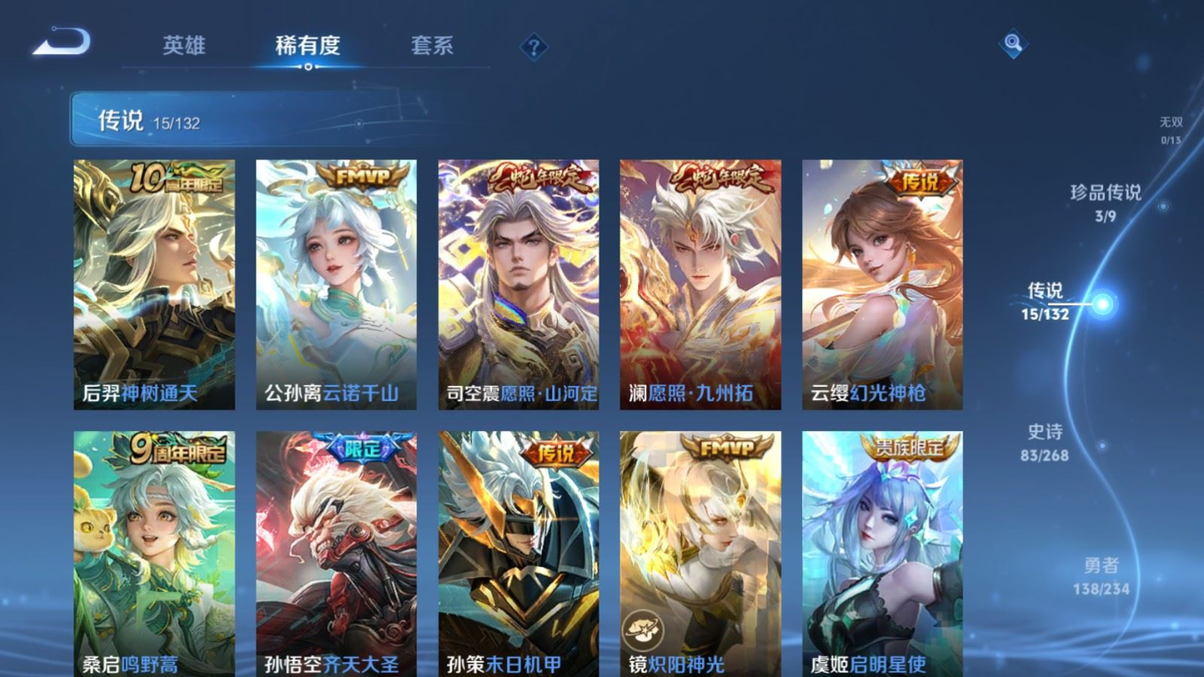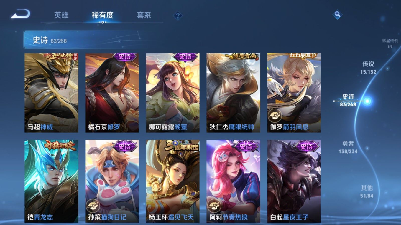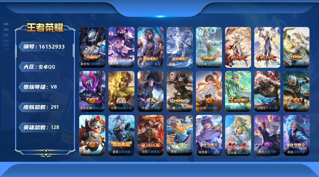 贵族等级:v8皮肤数:291传说品质15 生肖限定4 荣耀典藏1 珍品传说3 英雄数:128