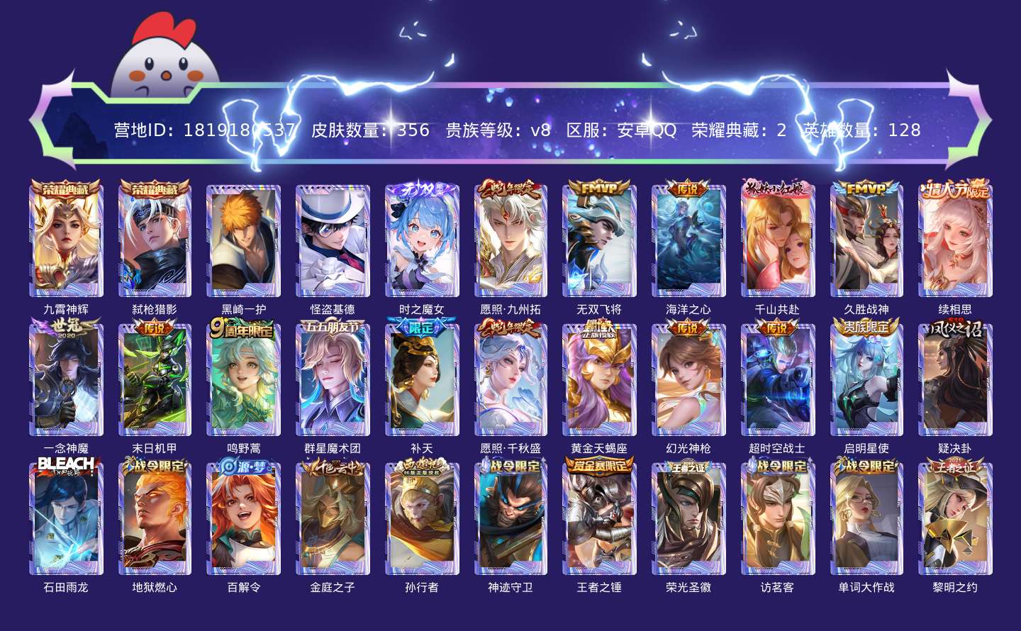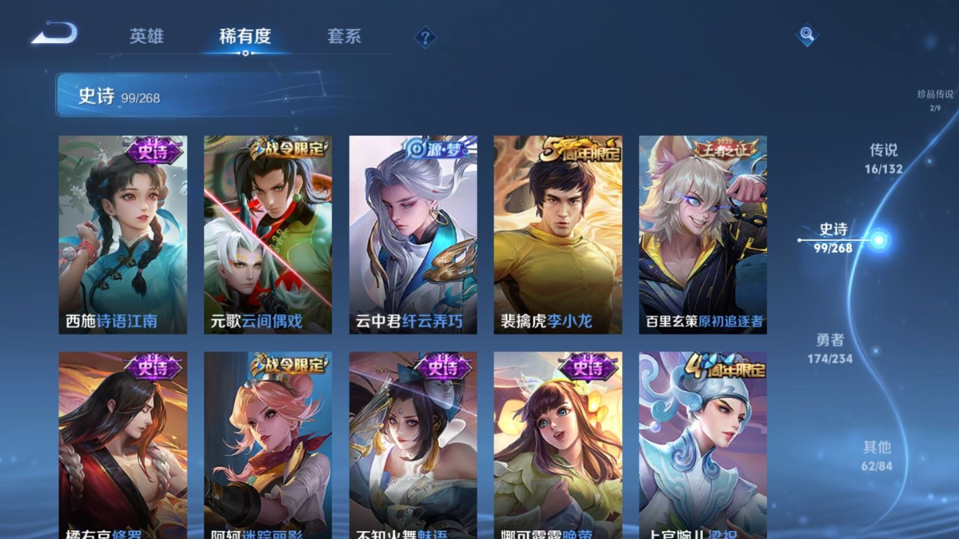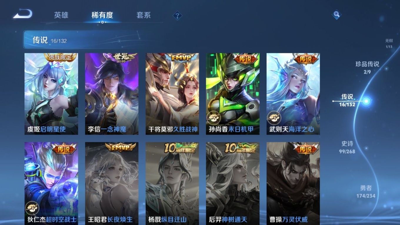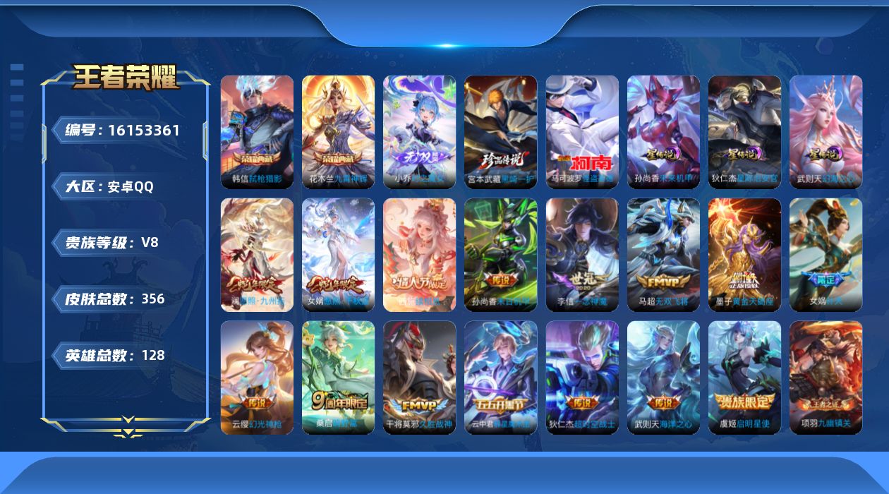 贵族等级:v8皮肤数:356传说品质16 生肖限定4 珍品传说2 情人节限定1 荣耀典藏2 无双1 英雄数:128