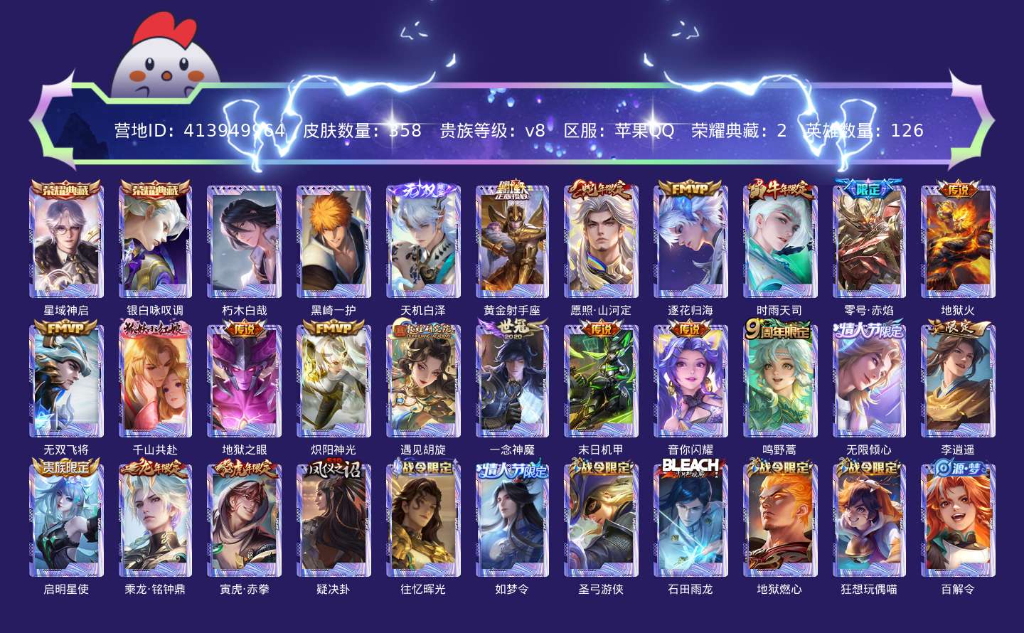 贵族等级:v8皮肤数:358传说品质20 情人节限定3 生肖限定6 荣耀典藏2 无双1 珍品传说2 英雄数:126