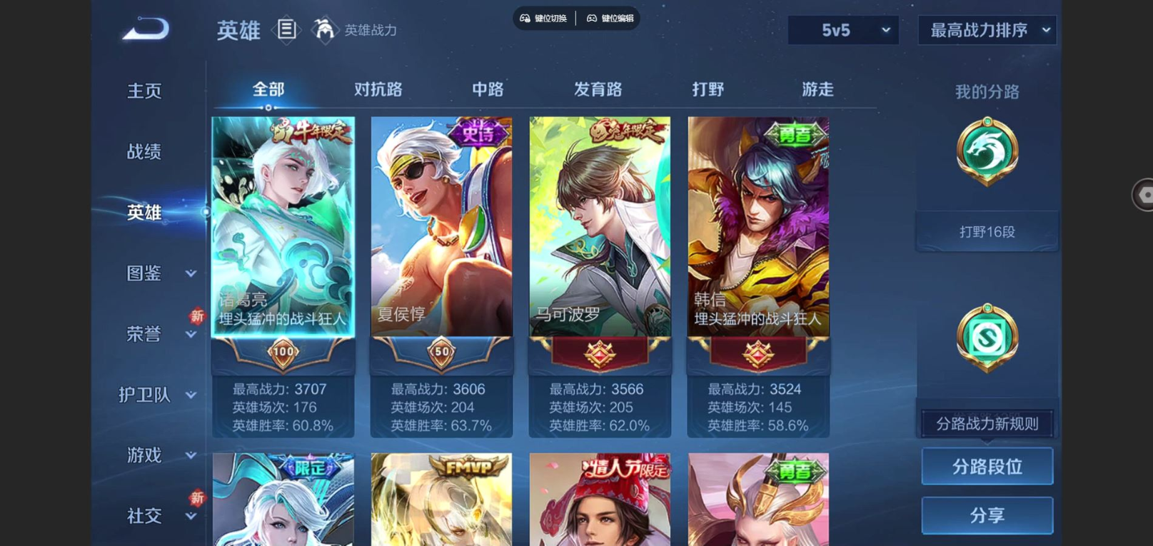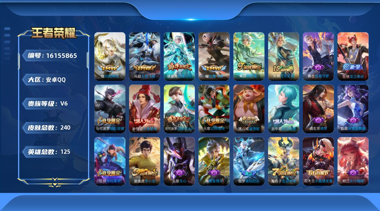 贵族等级:v6皮肤数:240传说品质6 生肖限定2 情人节限定2 英雄数:125
