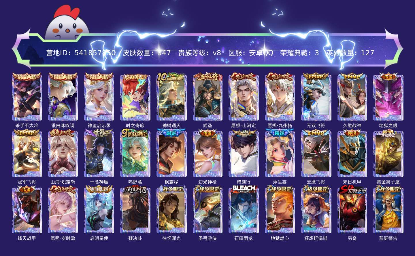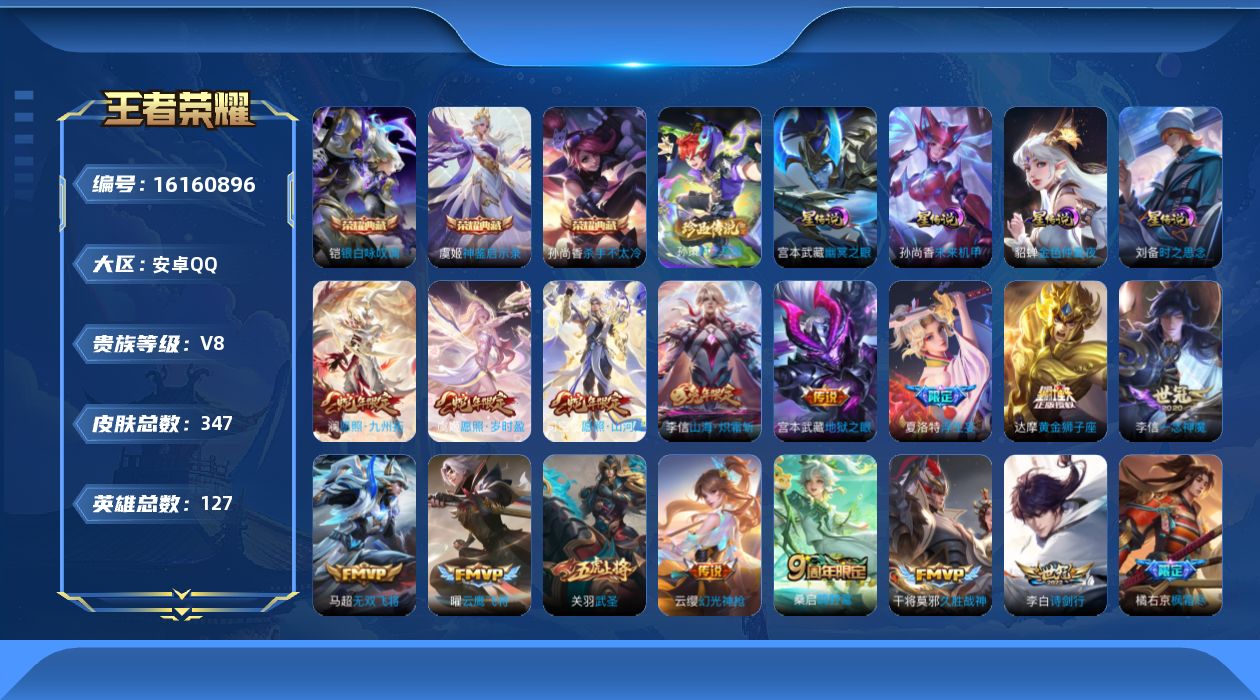 贵族等级:v8皮肤数:347传说品质21 生肖限定6 情人节限定2 荣耀典藏3 珍品传说1 英雄数:127