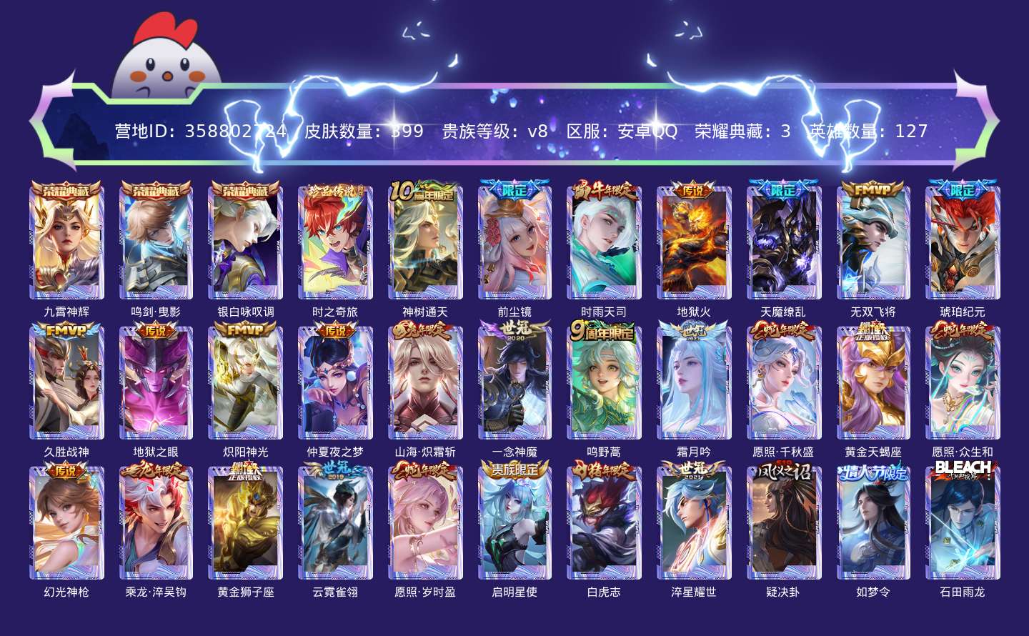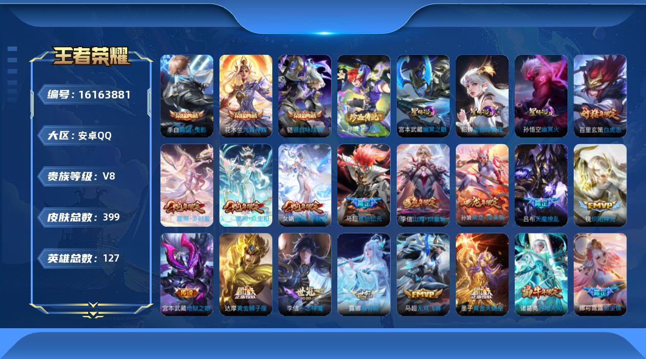 贵族等级:v8皮肤数:399情人节限定3 传说品质26 生肖限定11 荣耀典藏3 珍品传说1 英雄数:127