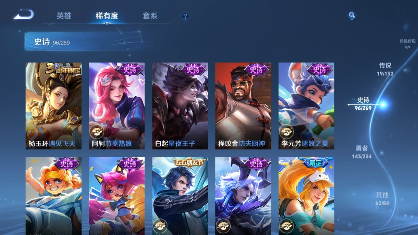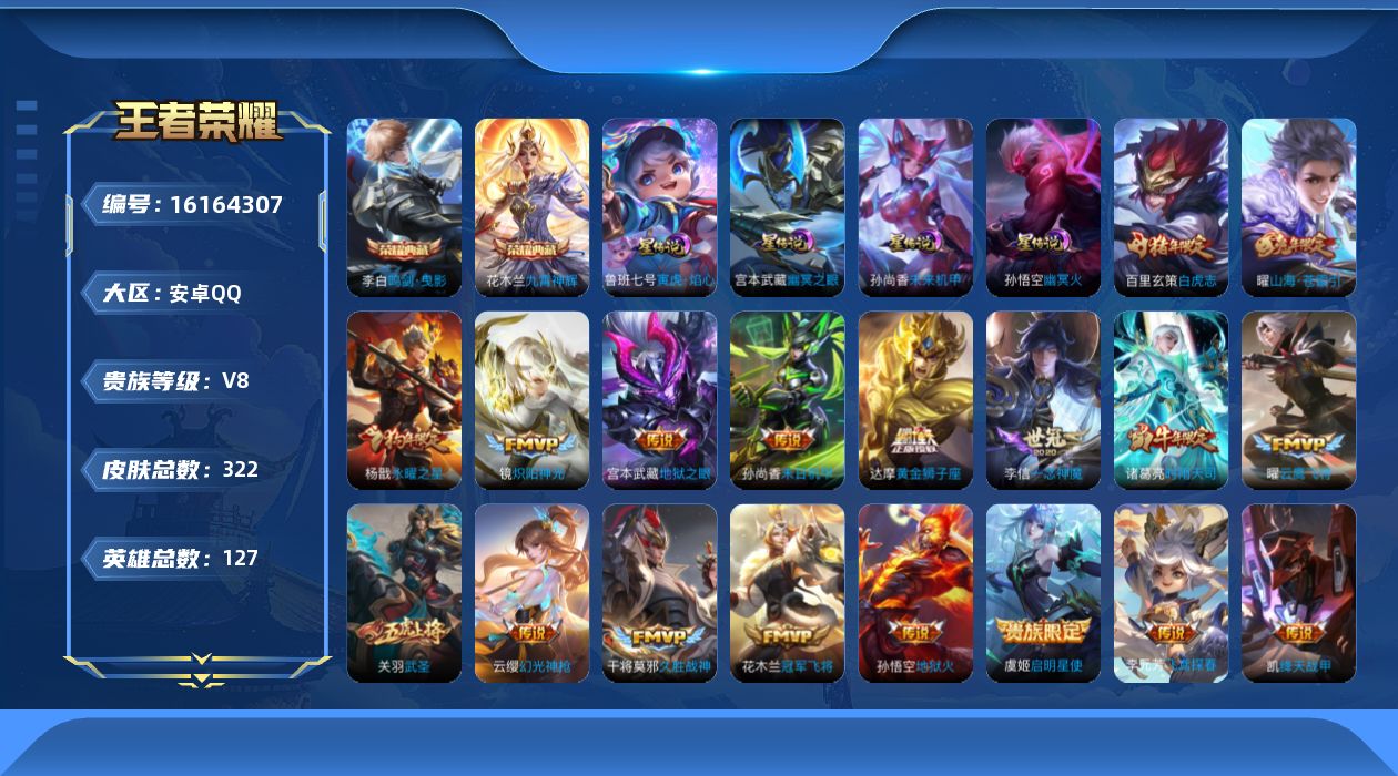 贵族等级:v8皮肤数:322生肖限定7 传说品质19 情人节限定4 荣耀典藏2 英雄数:127