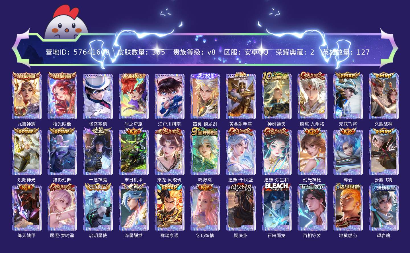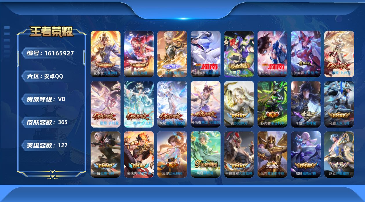 贵族等级:v8皮肤数:365传说品质22 生肖限定7 荣耀典藏2 珍品传说3 无双1 英雄数:127