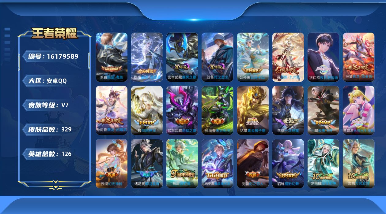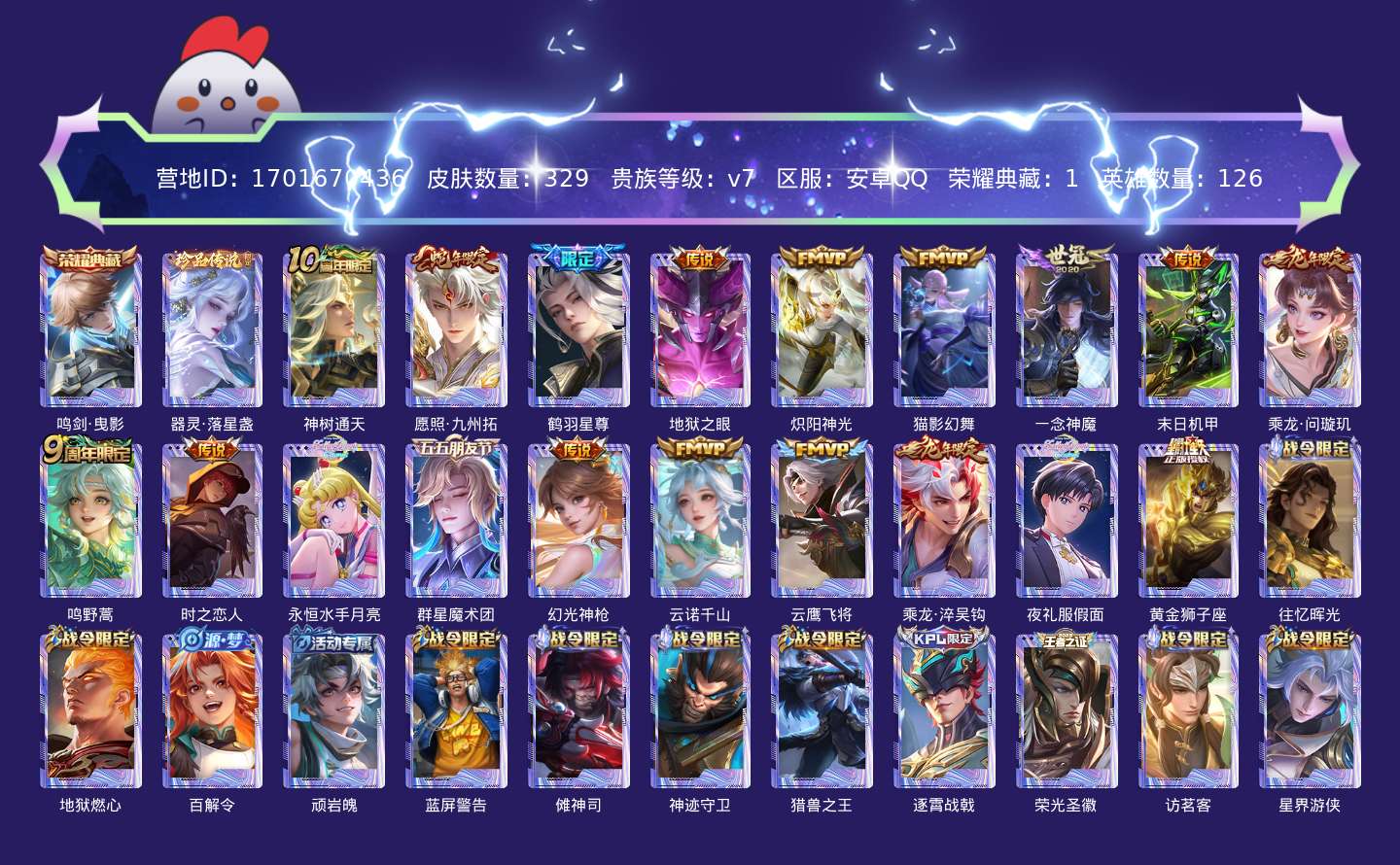 贵族等级:v7皮肤数:329传说品质19 生肖限定4 珍品传说1 荣耀典藏1 英雄数:126