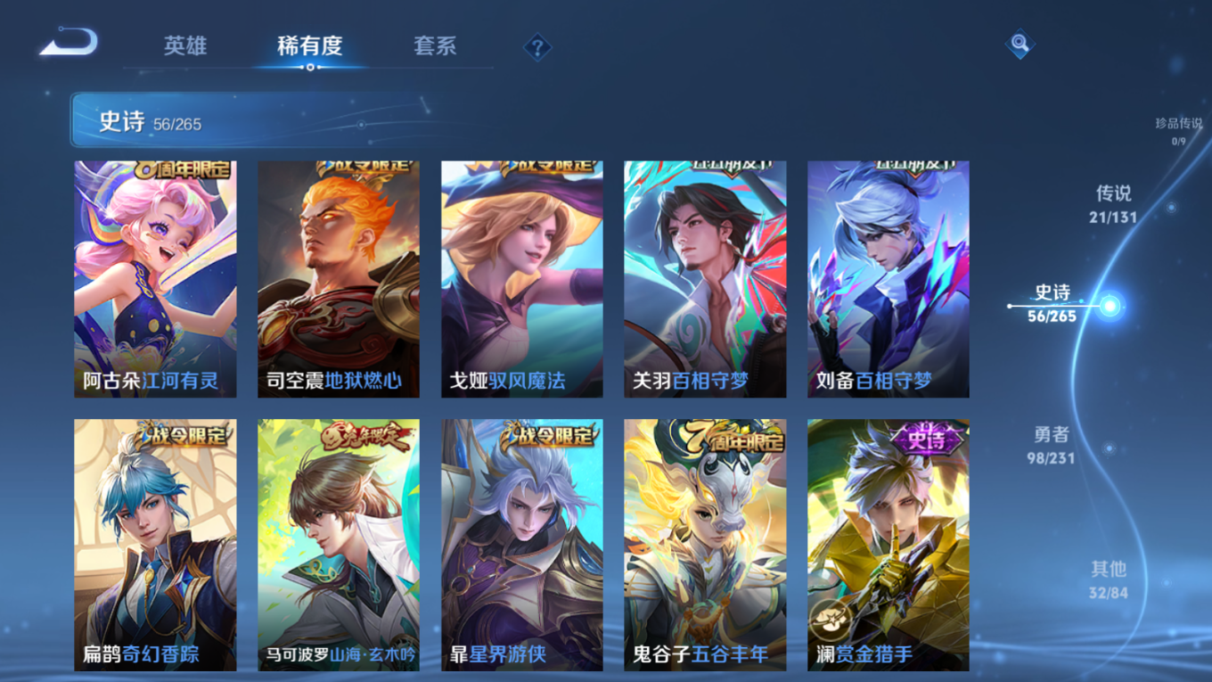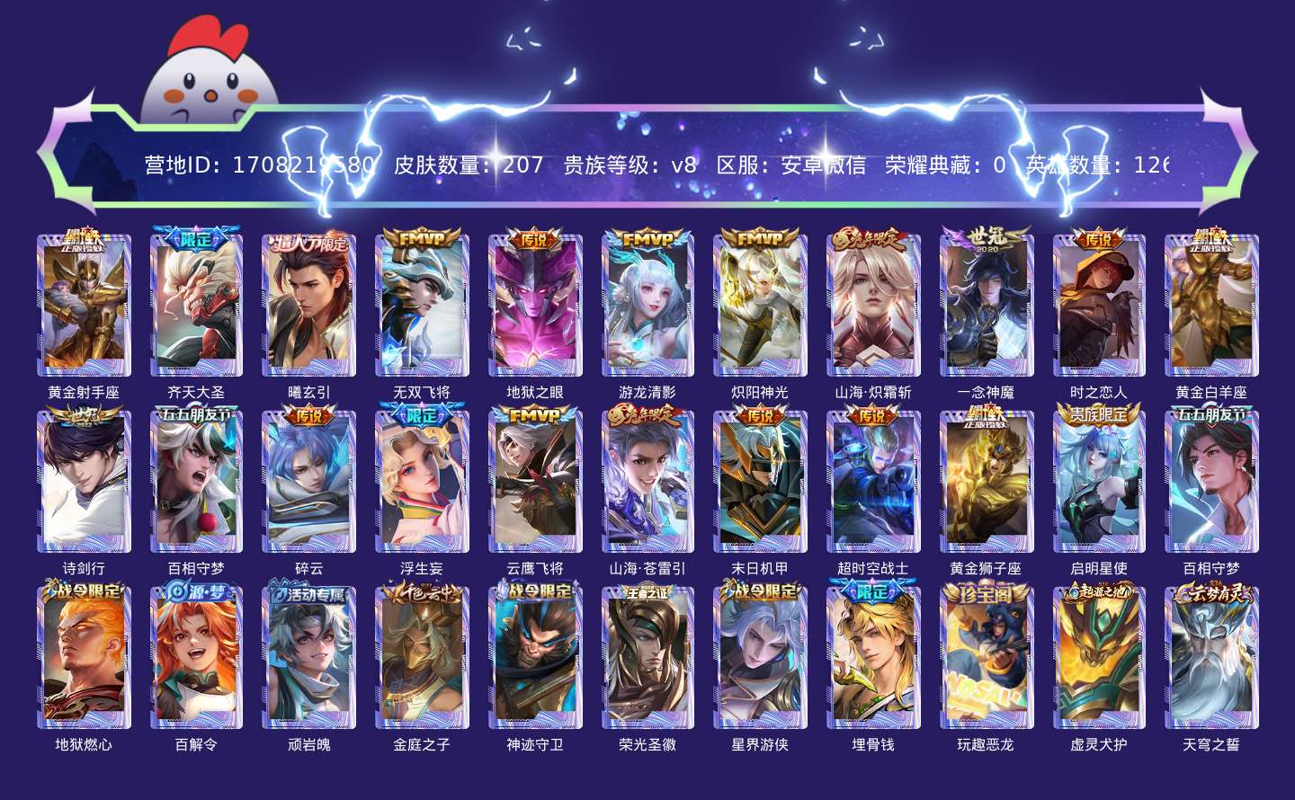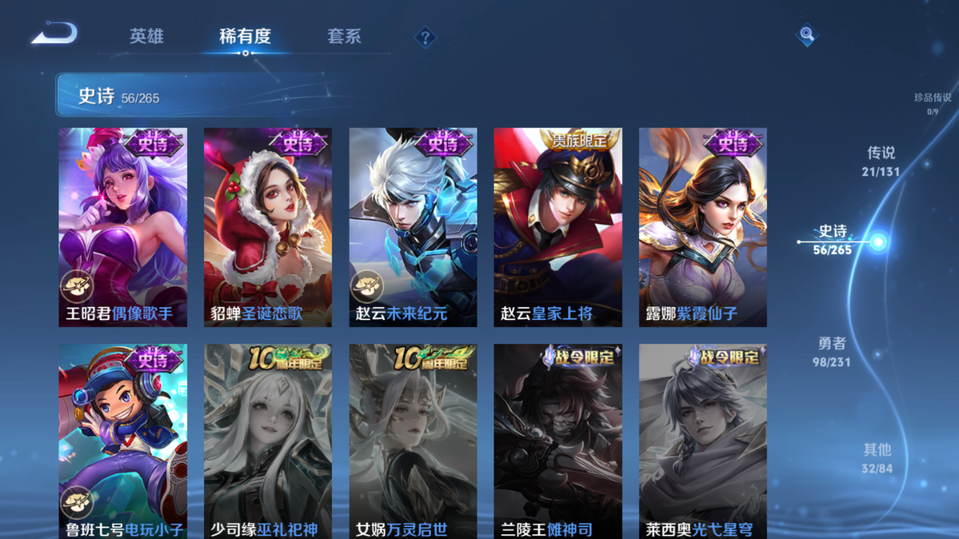 贵族等级:v8皮肤数:207传说品质21 情人节限定1 生肖限定4 英雄数:126