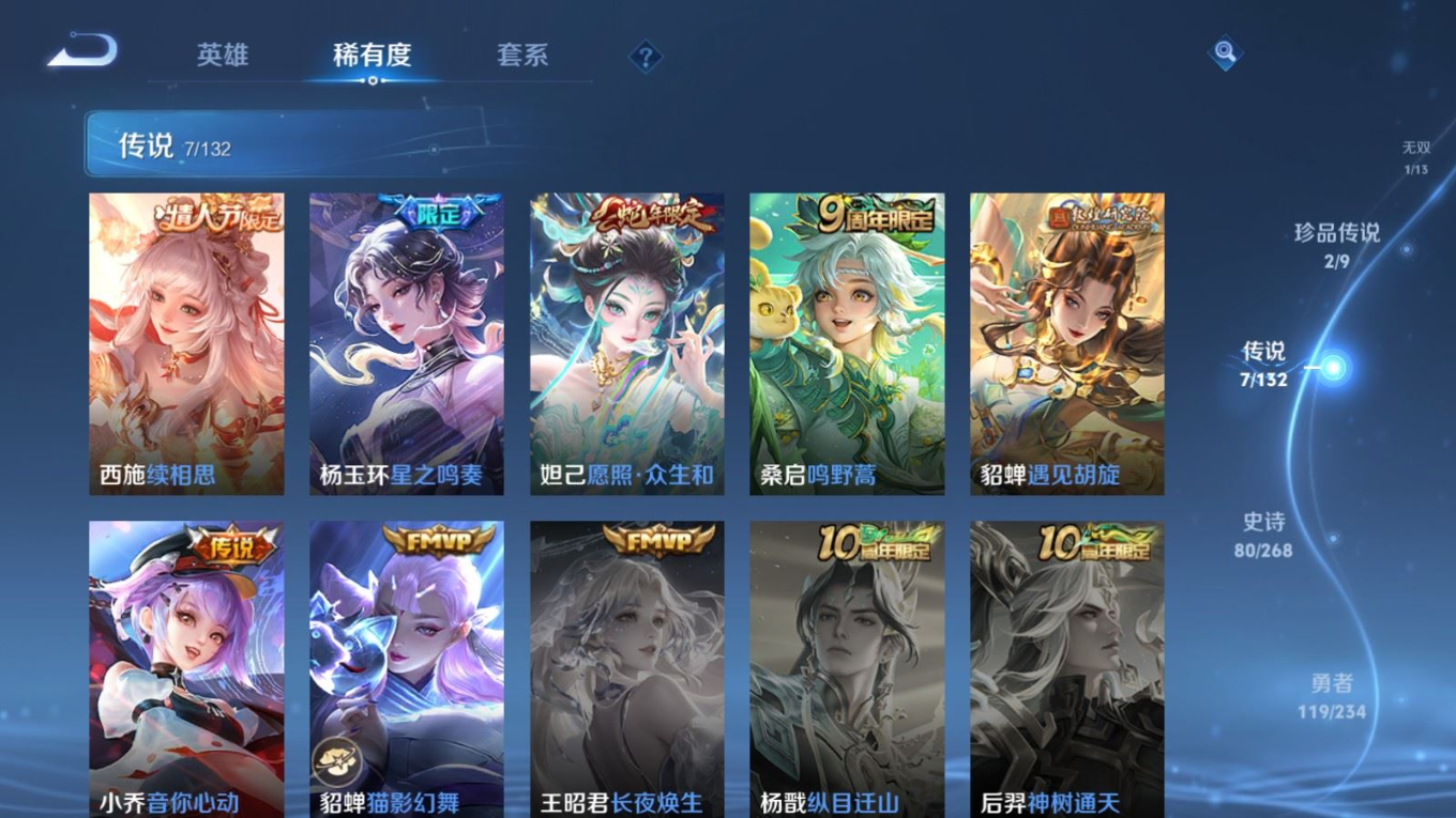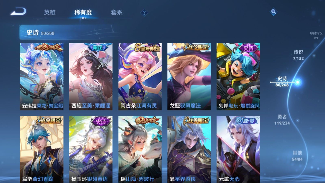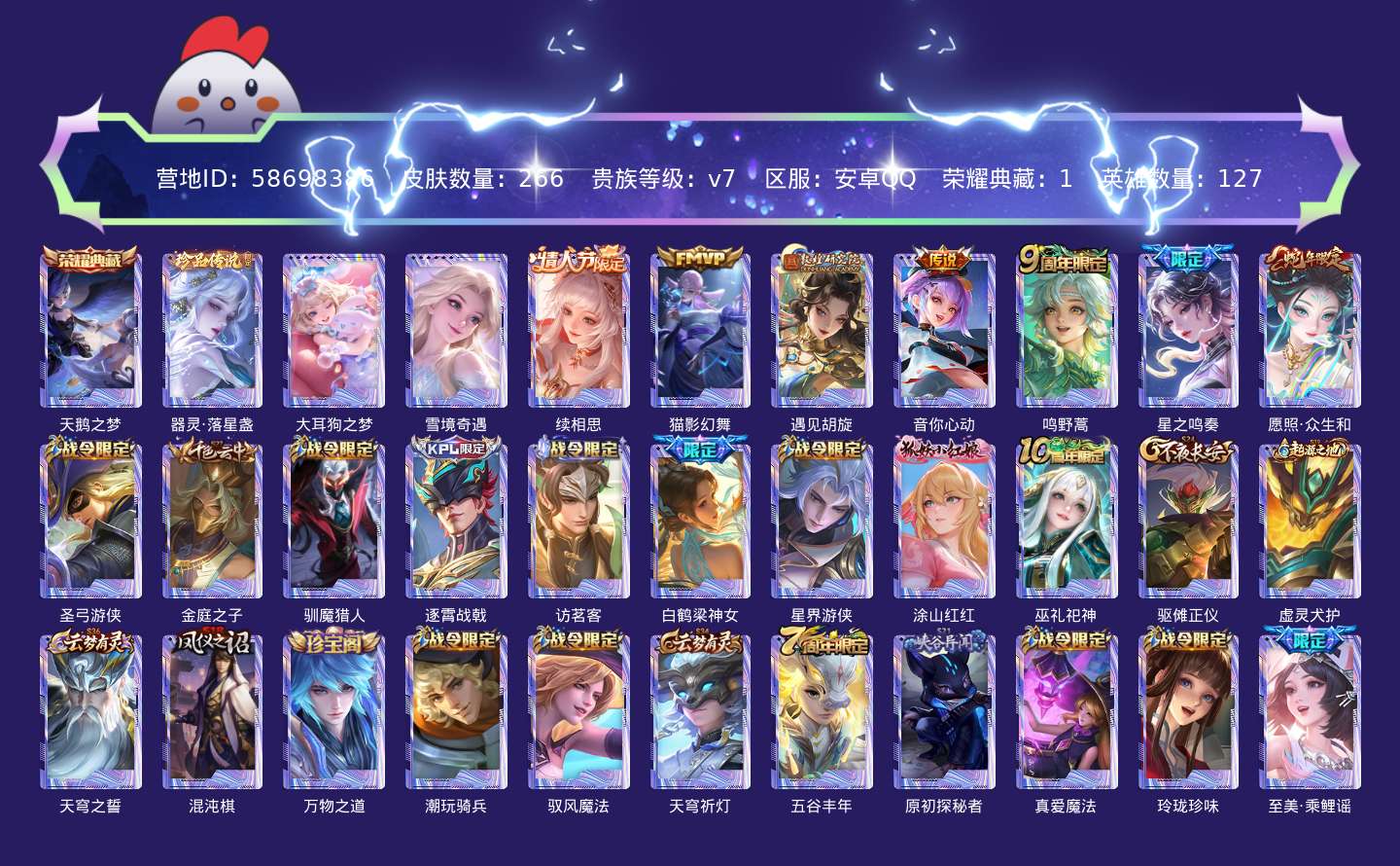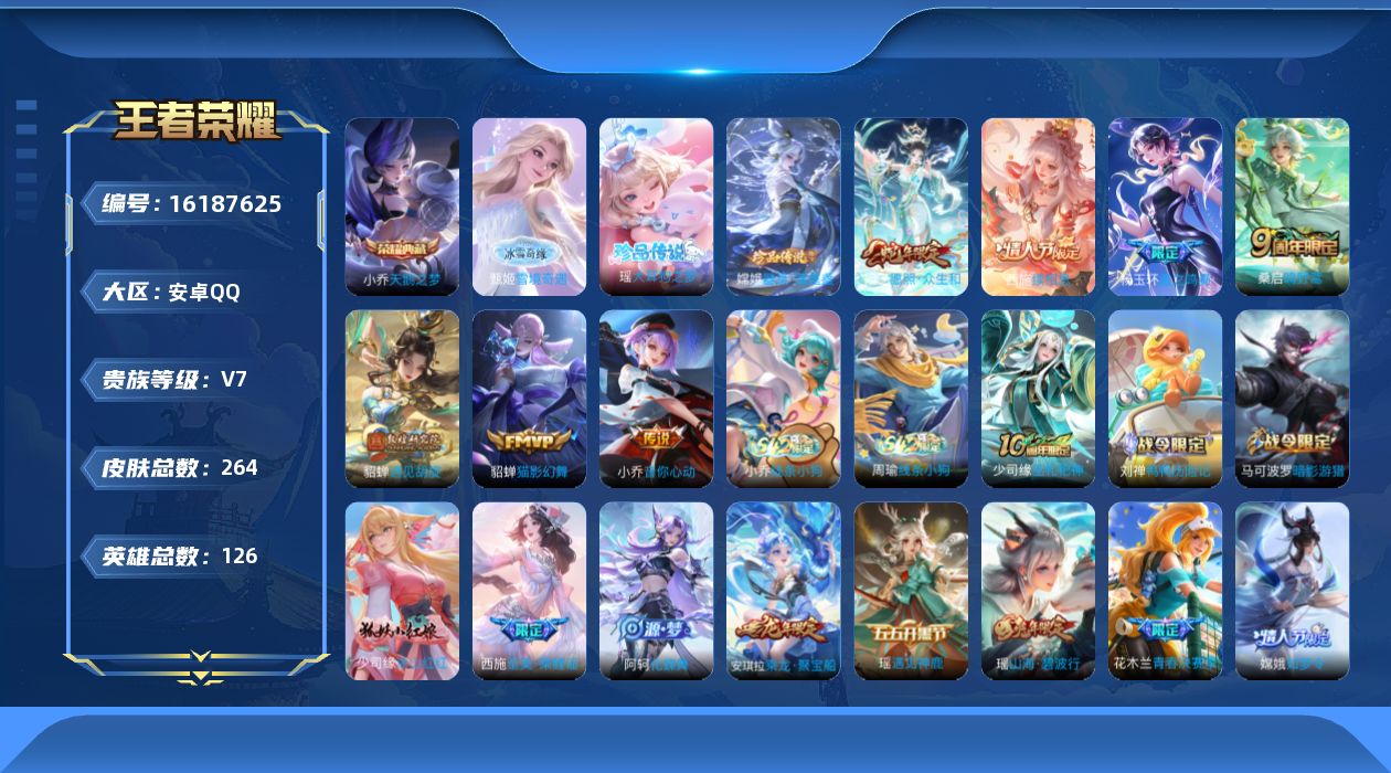 贵族等级:v7皮肤数:266传说品质7 情人节限定2 荣耀典藏1 生肖限定4 珍品传说2 无双1 英雄数:127