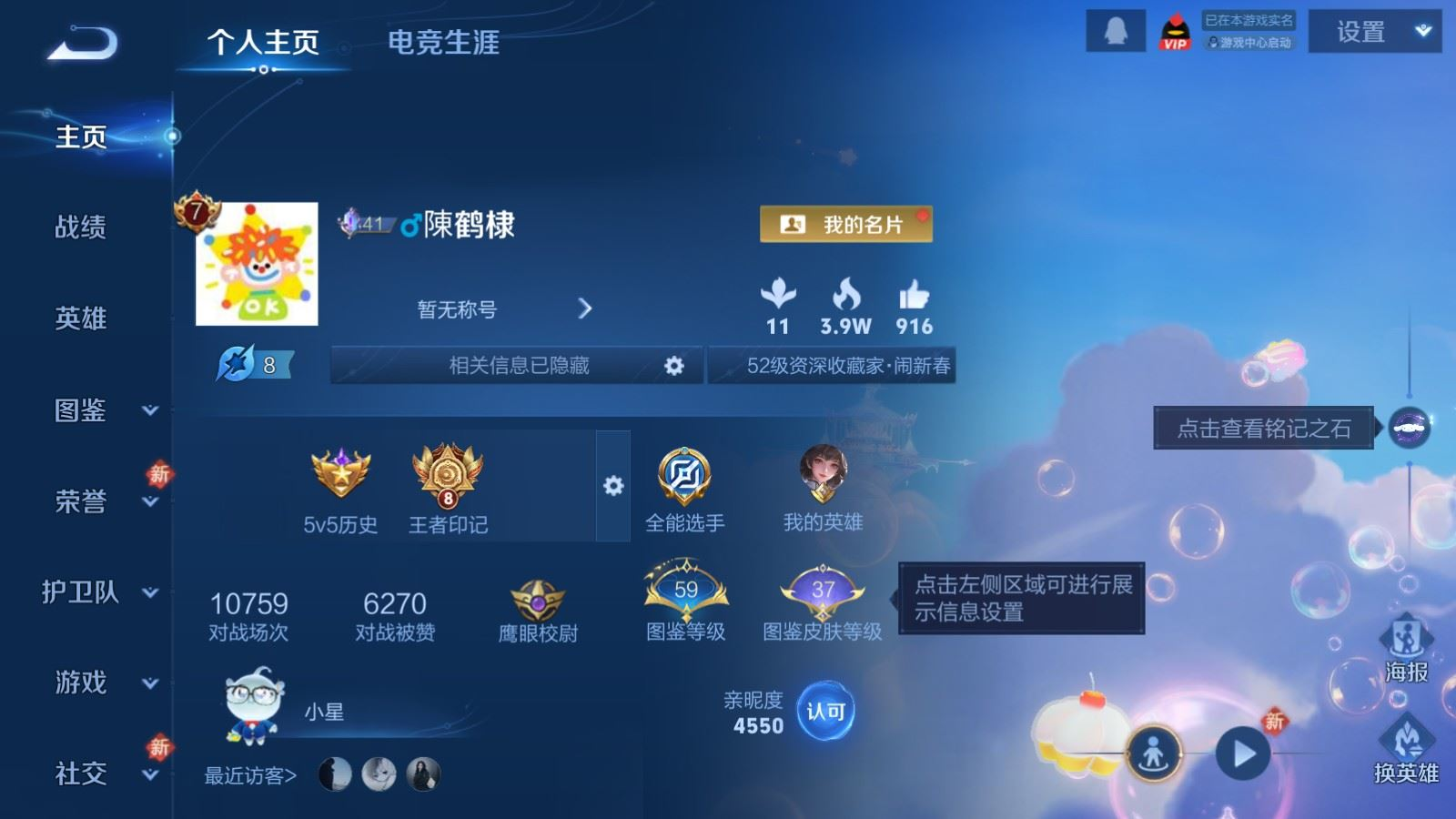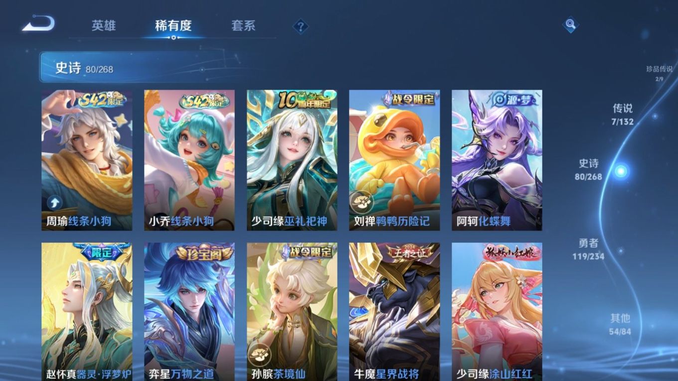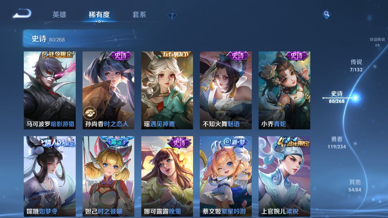 贵族等级:v7皮肤数:266传说品质7 情人节限定2 荣耀典藏1 生肖限定4 珍品传说2 无双1 英雄数:127