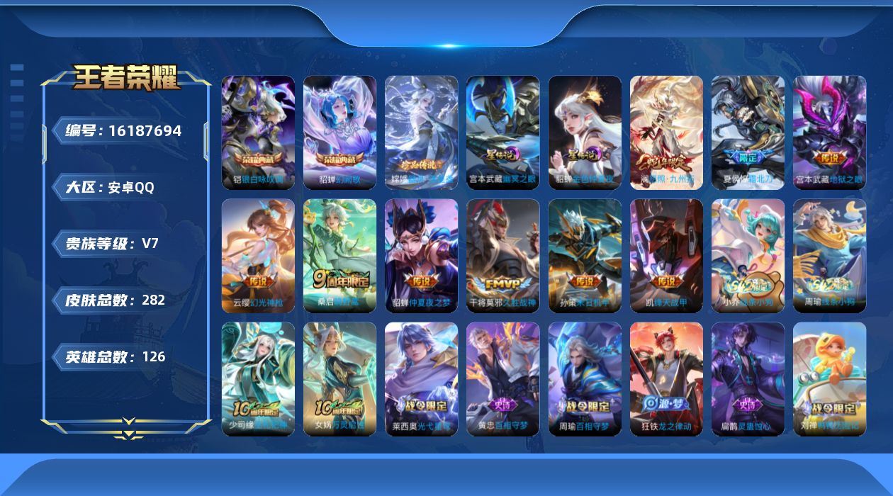 贵族等级:v7皮肤数:282传说品质9 生肖限定5 情人节限定1 荣耀典藏2 珍品传说1 英雄数:126