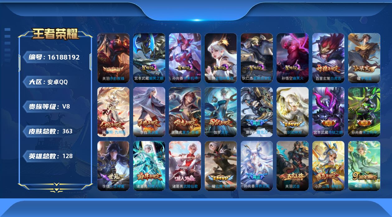 传说品质_后羿_神树通天传说品质_关羽_武圣传说品质_澜_愿照·九州拓传说品质_诸葛亮_武陵仙君传说品质_诸葛亮_时雨天司传说品质_孙悟空_齐天大圣传说品质_孙悟空_地狱火传说品质_宫本武藏_地狱之眼传说品质_花木兰_冠军飞将传说品质_镜_炽阳神光传说品质_貂蝉_仲夏夜之梦传说品质_李信_一念神魔传说品质_孙尚香_末日机甲传说品质_孙尚香_异界灵契传说品质_夏侯惇_霜北刀传说品质_小乔_山海·琳琅生传说品质_梦奇_胖达荣荣传说品质_桑启_鸣野蒿传说品质_李白_凤求凰传说品质_伽罗_太华传说品质_曜_云鹰飞将传说品质_曜_李逍遥 传说品质_孙策_末日机甲传说品质_狄仁杰_超时空战士传说品质_鲁班七号_寅虎·瑞焰传说品质_虞姬_启明星使传说品质_百里玄策_白虎志传说品质_裴擒虎_寅虎·赤拳