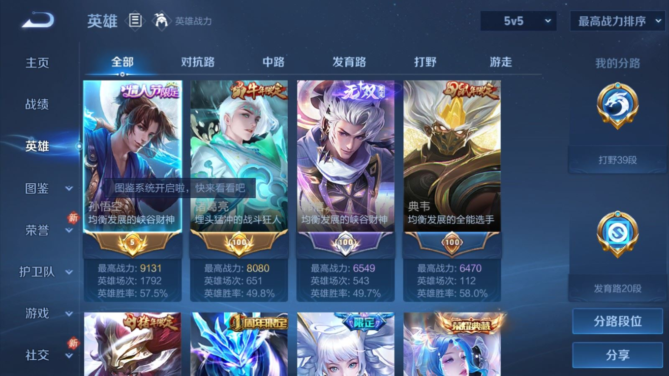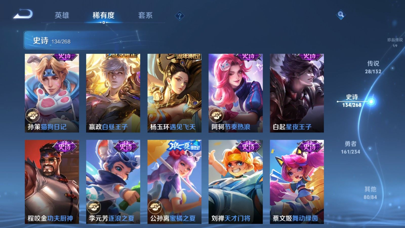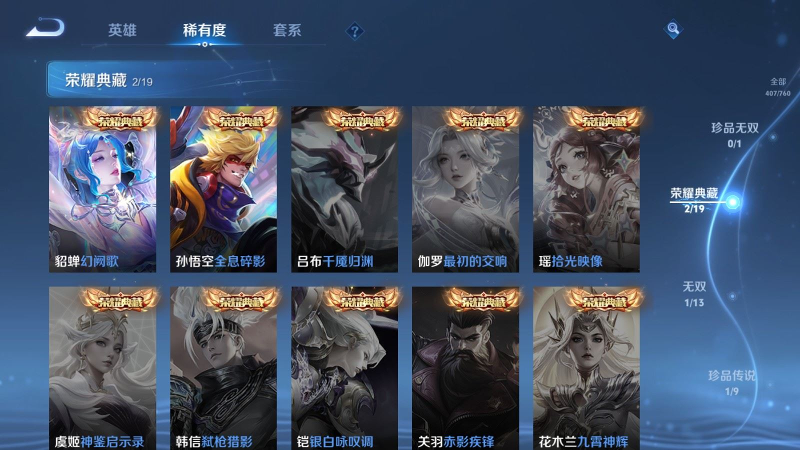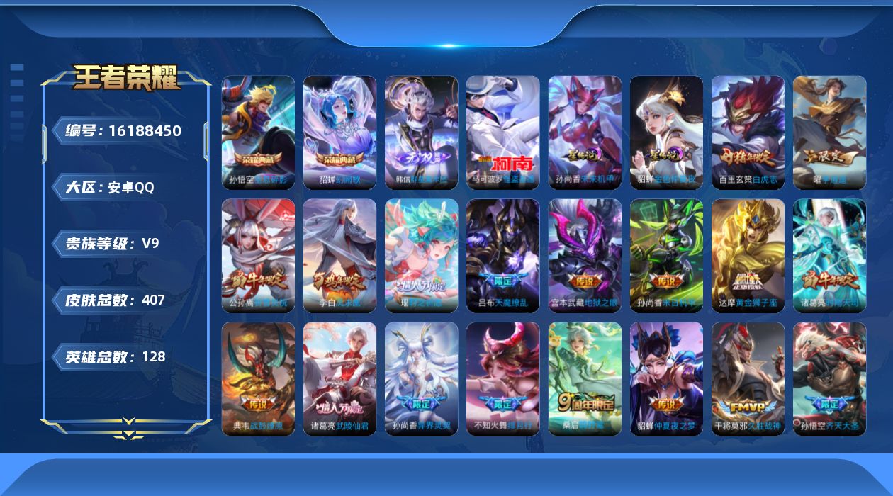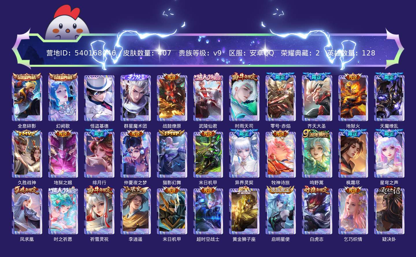 贵族等级:v9皮肤数:407情人节限定7 生肖限定11 传说品质28 荣耀典藏2 珍品传说1 无双1 英雄数:128