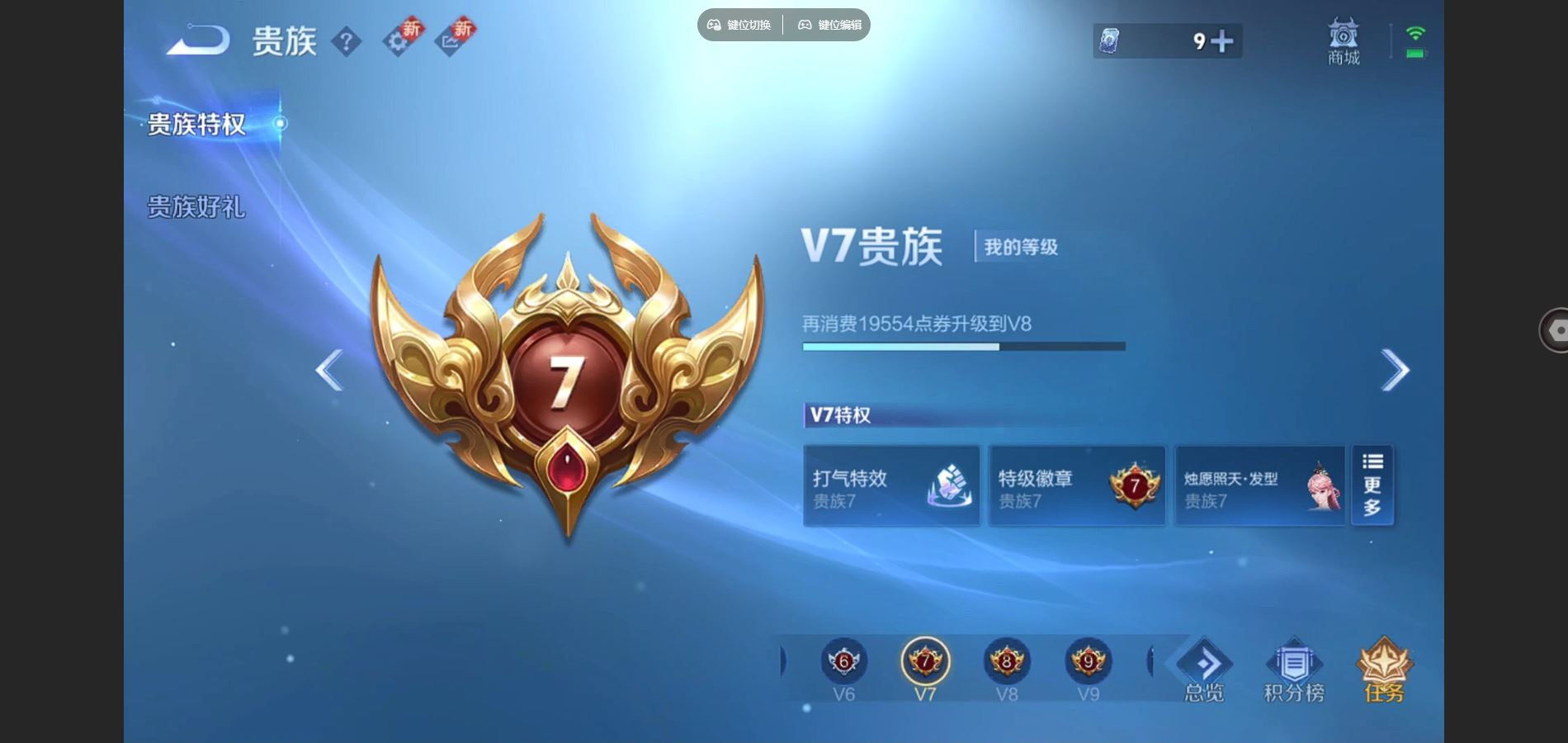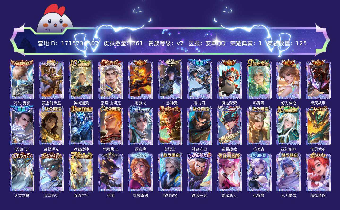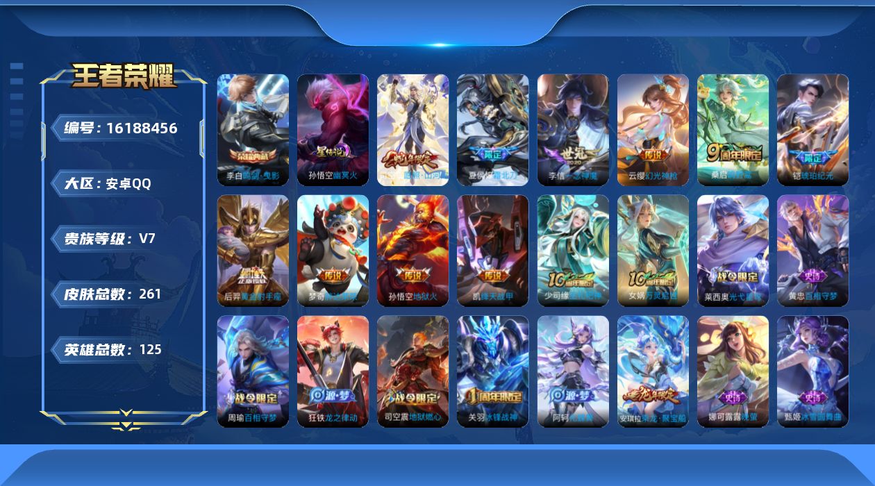 贵族等级:v7皮肤数:264传说品质11 生肖限定3 荣耀典藏1 英雄数:125