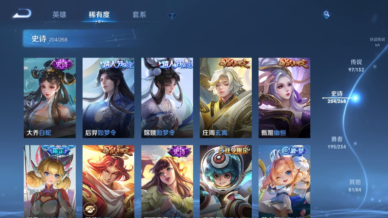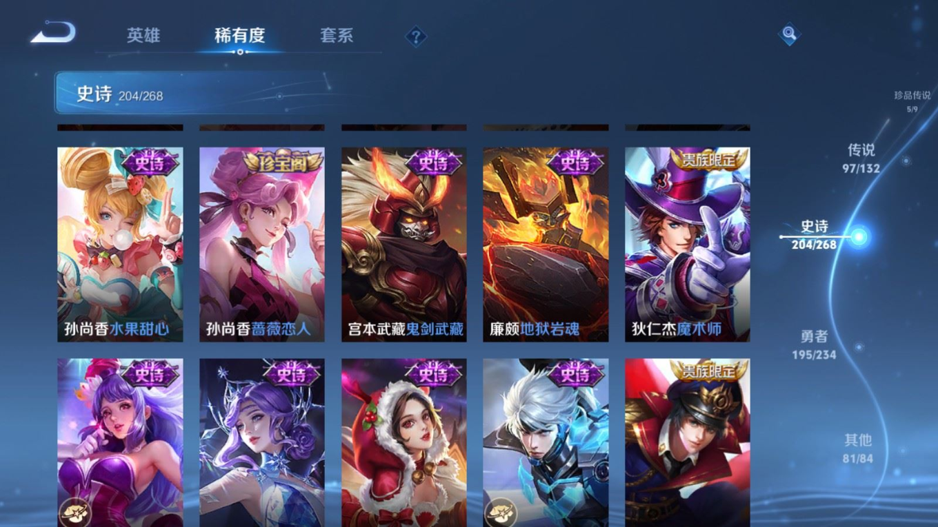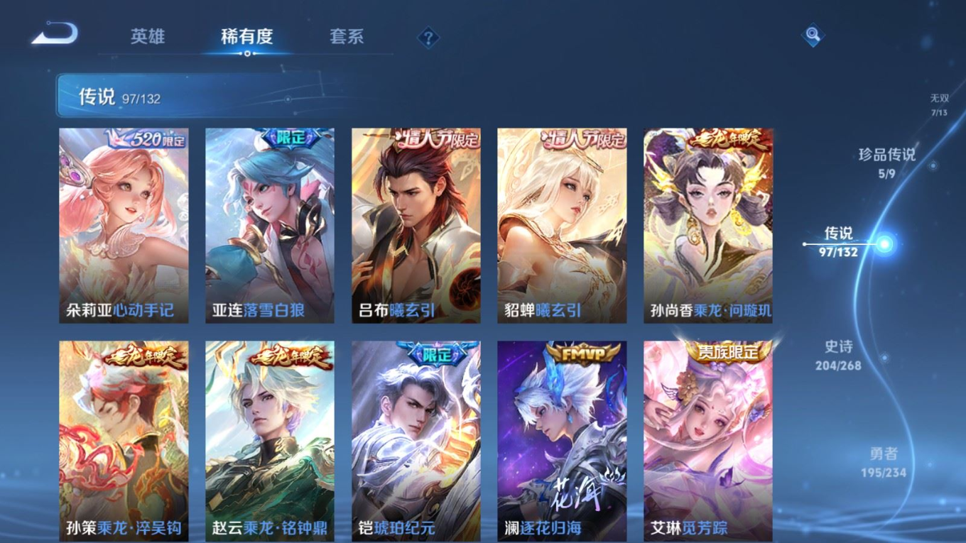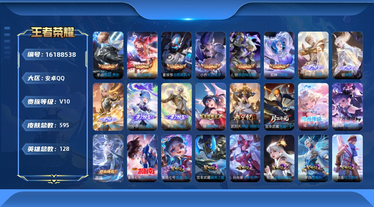贵族等级:v10皮肤数:595传说品质97 情人节限定14 生肖限定32 无双7 珍品传说5 荣耀典藏6 英雄数:128