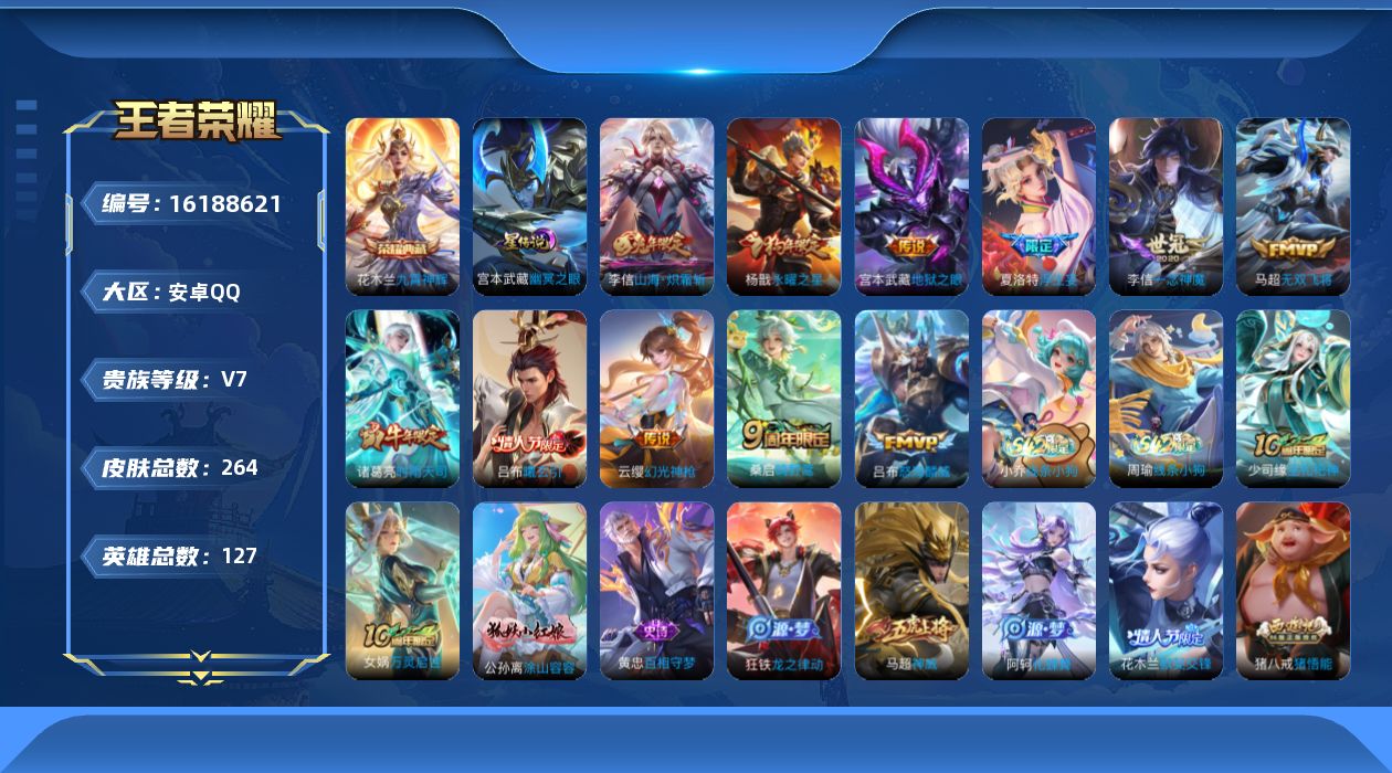 贵族等级:v7皮肤数:264传说品质12 生肖限定3 情人节限定2 荣耀典藏1 英雄数:127