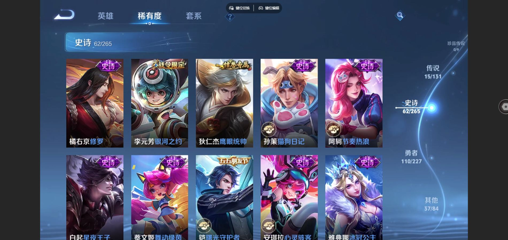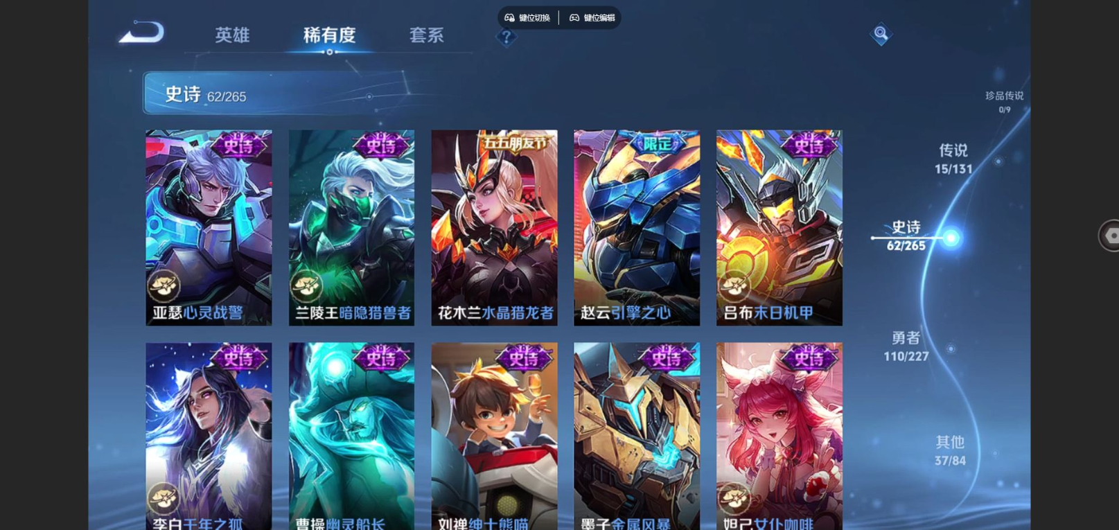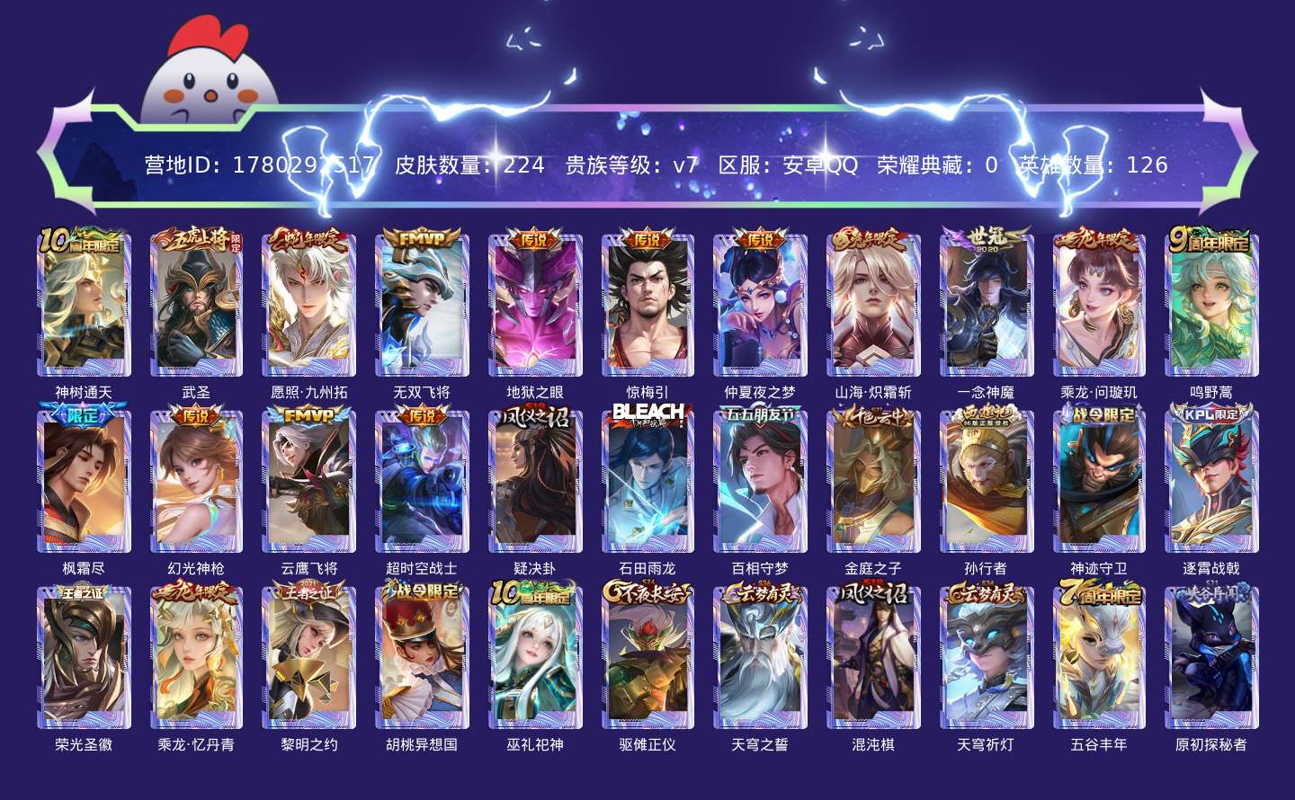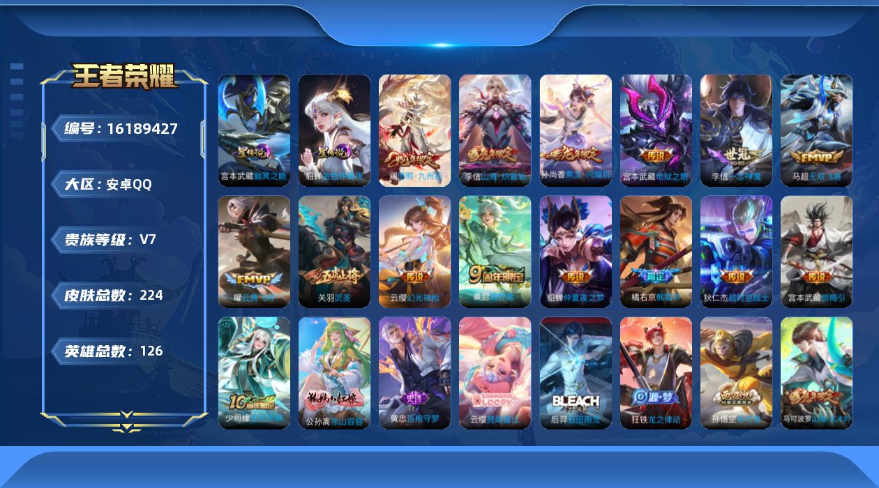 贵族等级:v7皮肤数:224传说品质15 生肖限定5 英雄数:126