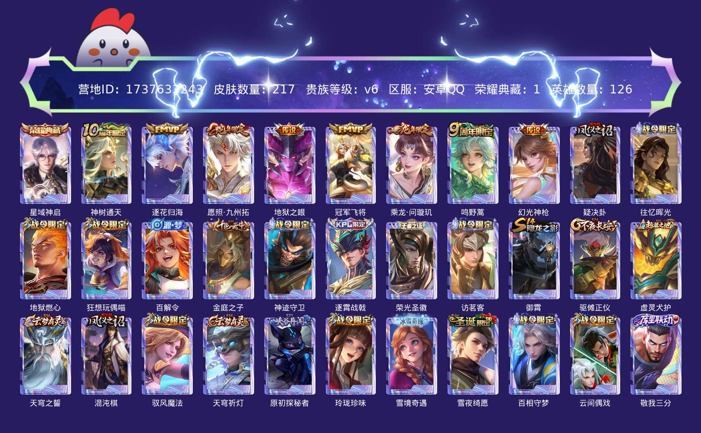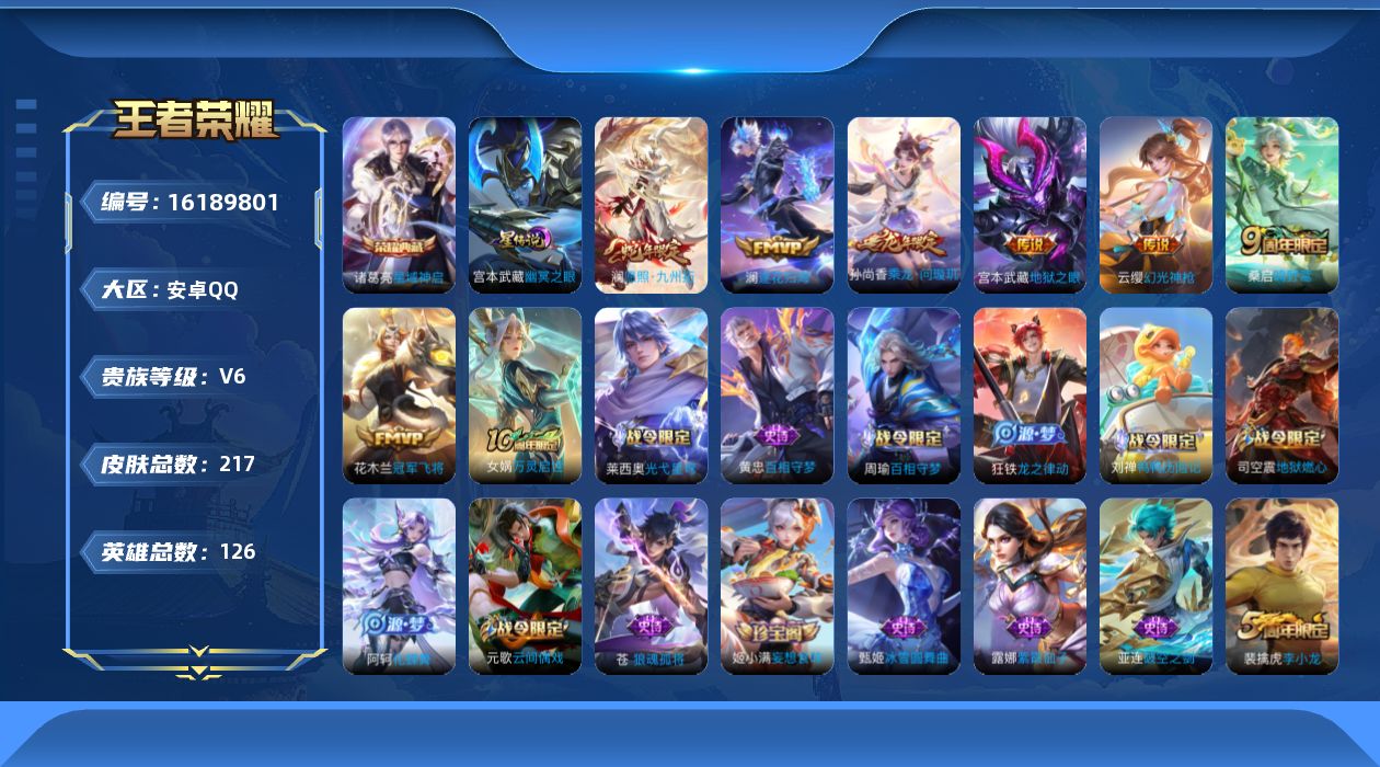 贵族等级:v6皮肤数:217传说品质8 生肖限定2 荣耀典藏1 英雄数:126