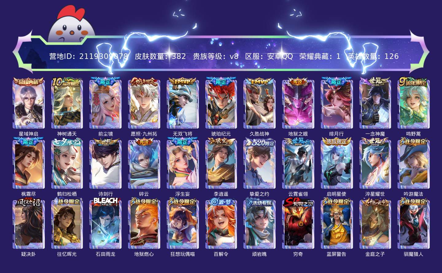 贵族等级:v8皮肤数:382传说品质20 生肖限定4 荣耀典藏1 情人节限定1 英雄数:126