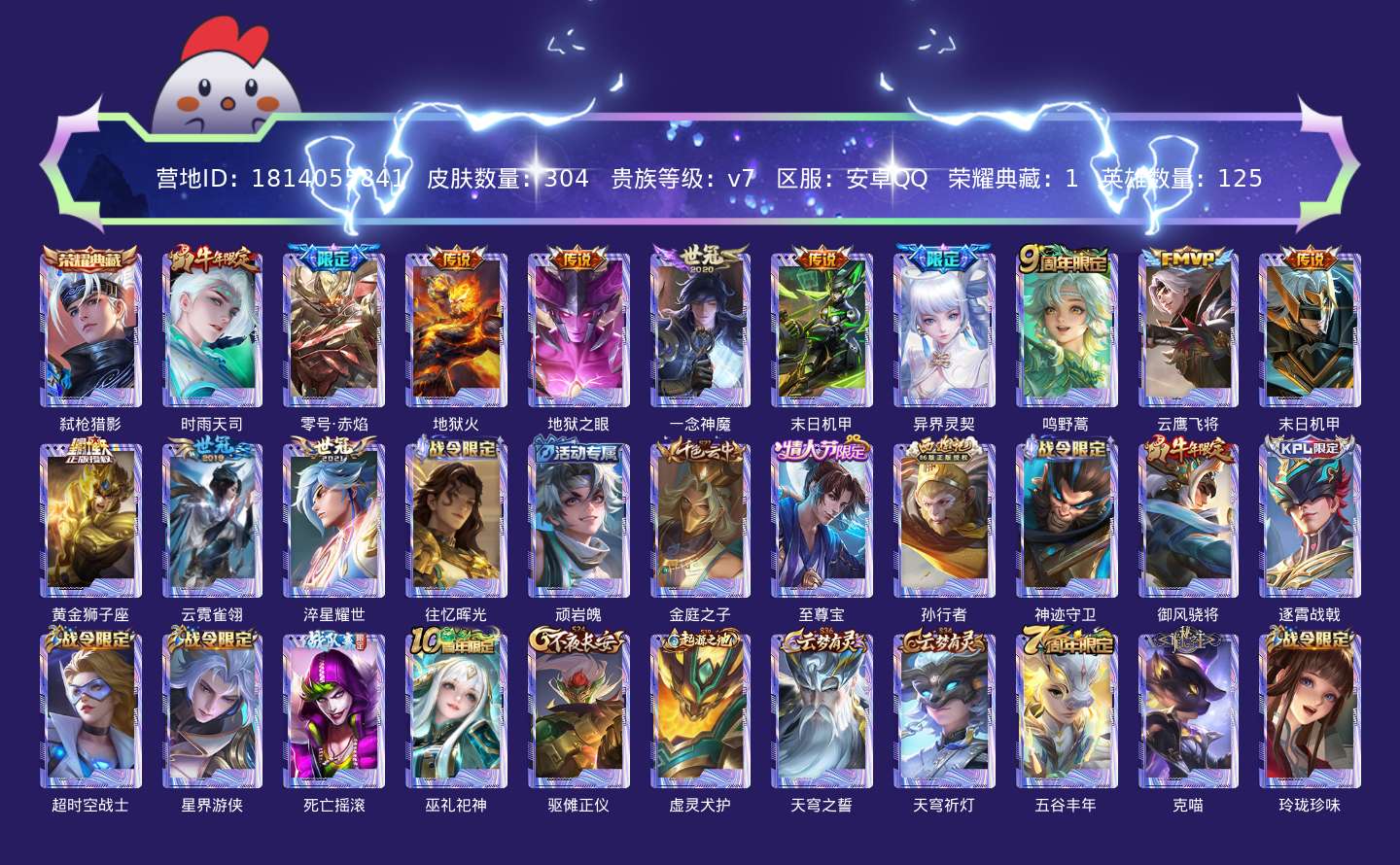 贵族等级:v7皮肤数:304传说品质13 生肖限定3 情人节限定1 荣耀典藏1 英雄数:125