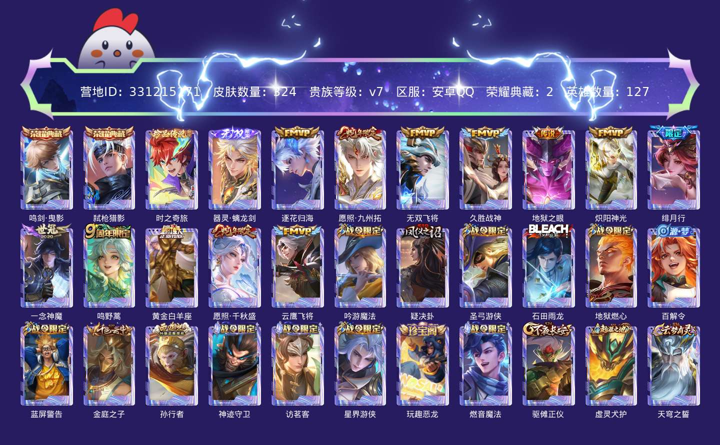 贵族等级:v7皮肤数:324传说品质12 生肖限定4 荣耀典藏2 无双1 珍品传说1 英雄数:127