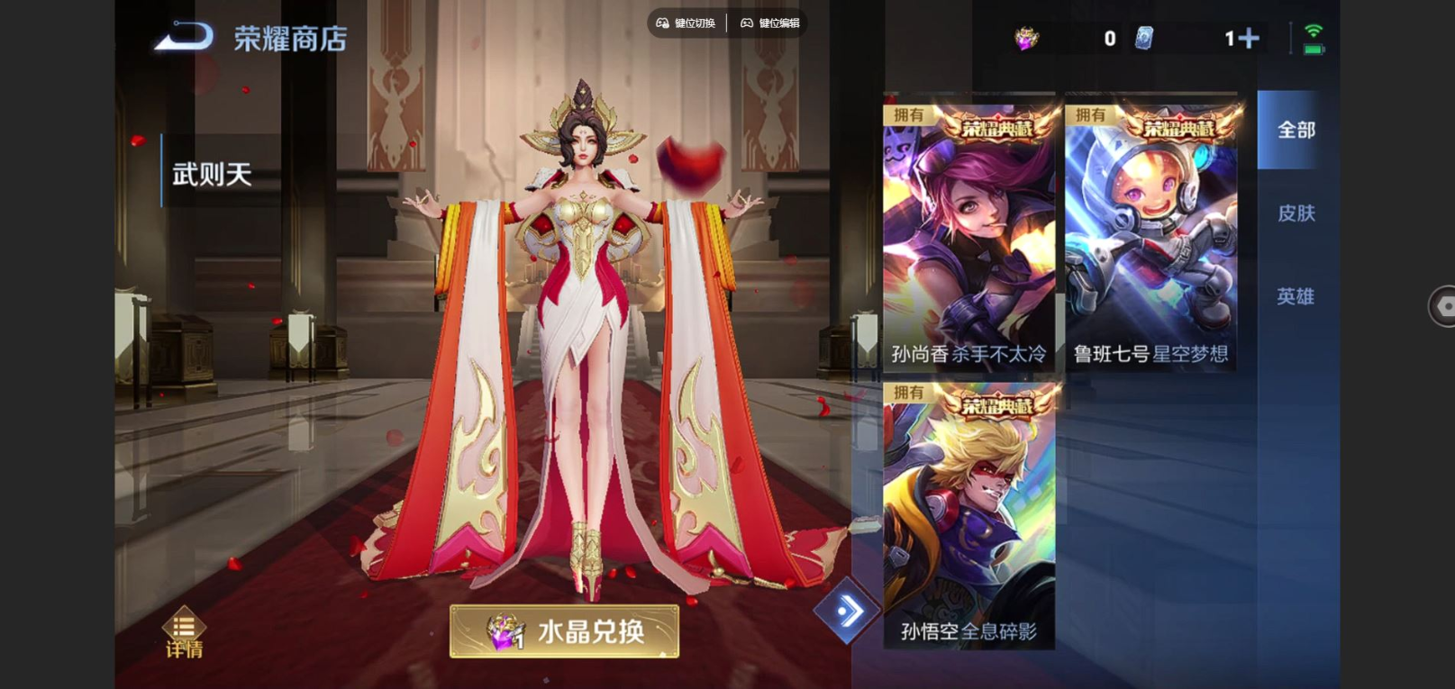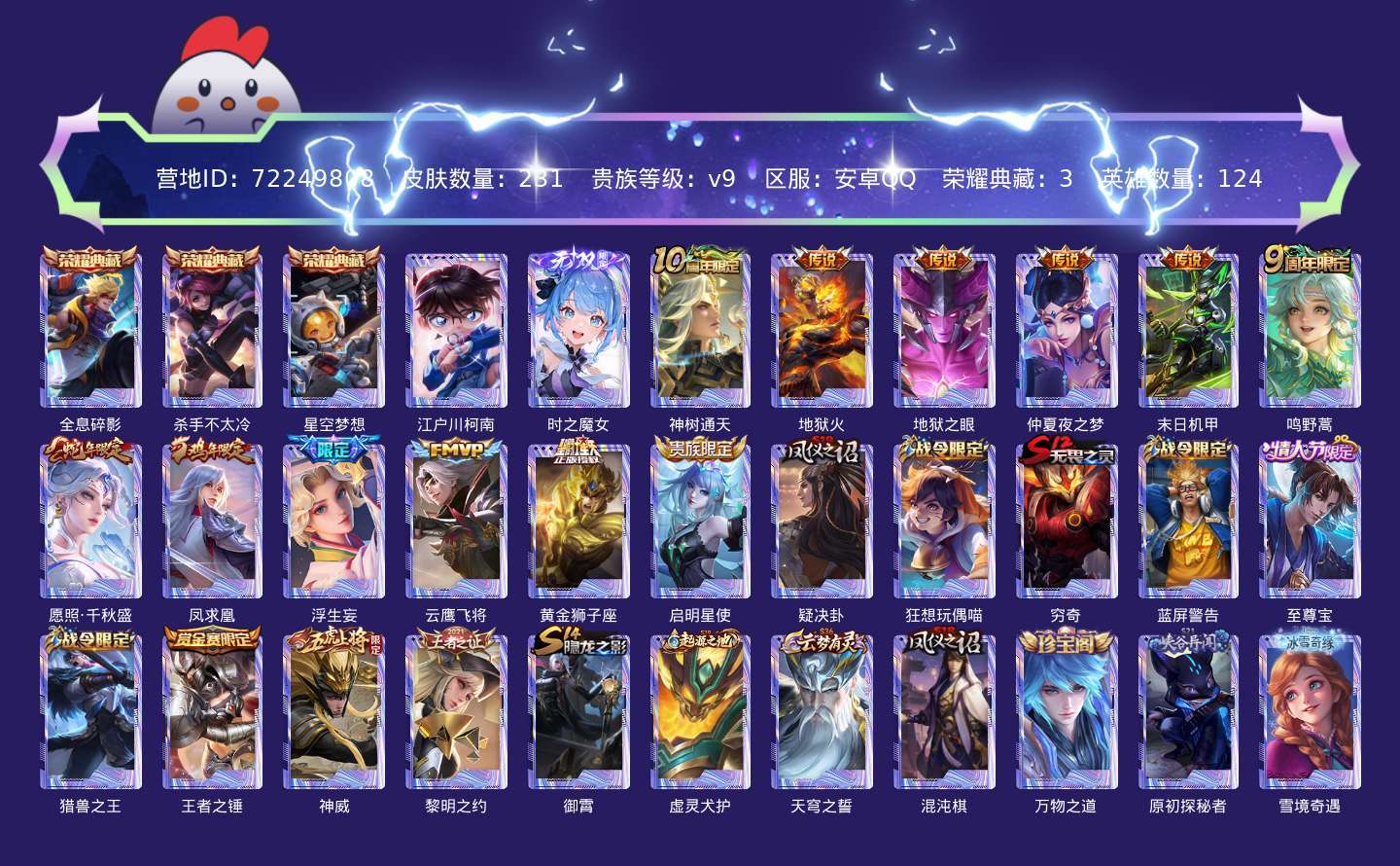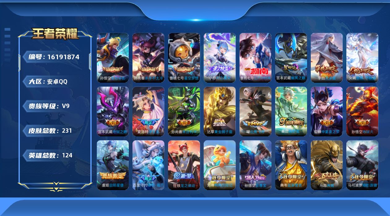 贵族等级:v9皮肤数:231传说品质12 情人节限定1 荣耀典藏3 无双1 生肖限定4 珍品传说1 英雄数:124