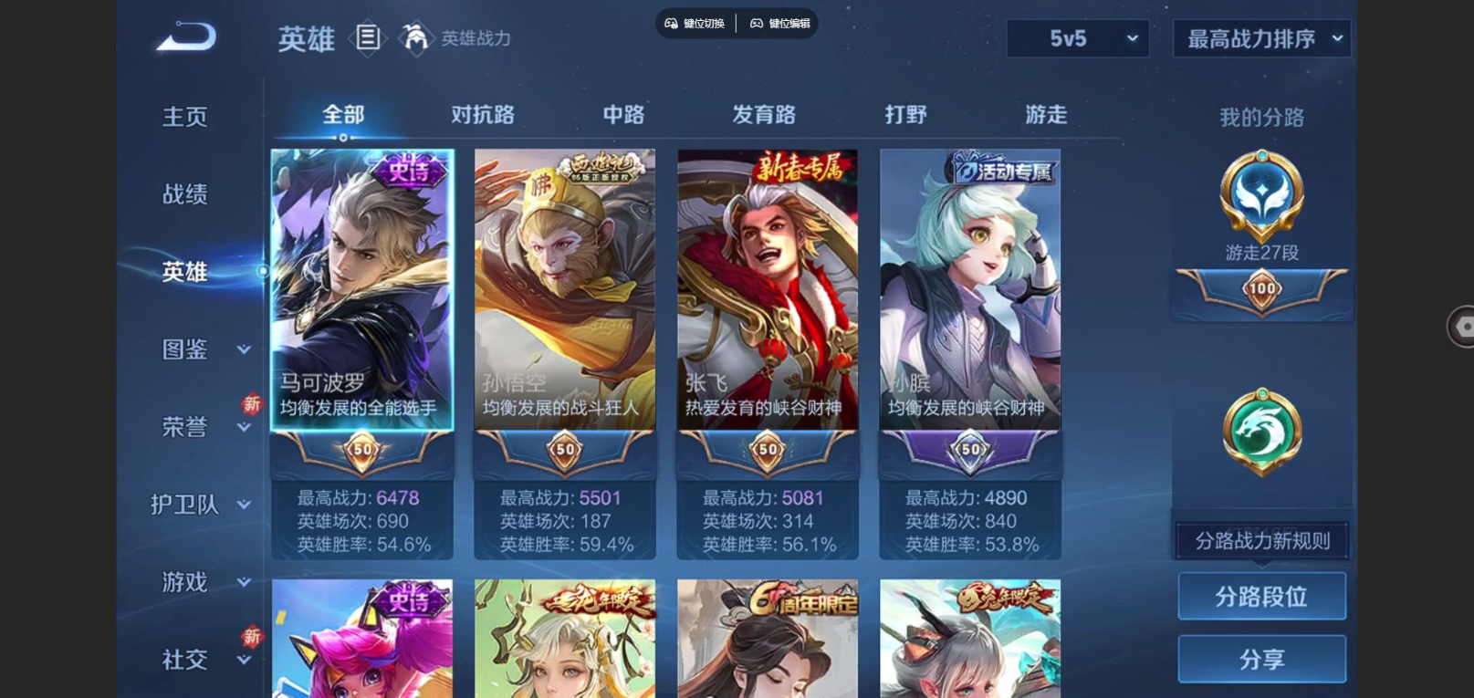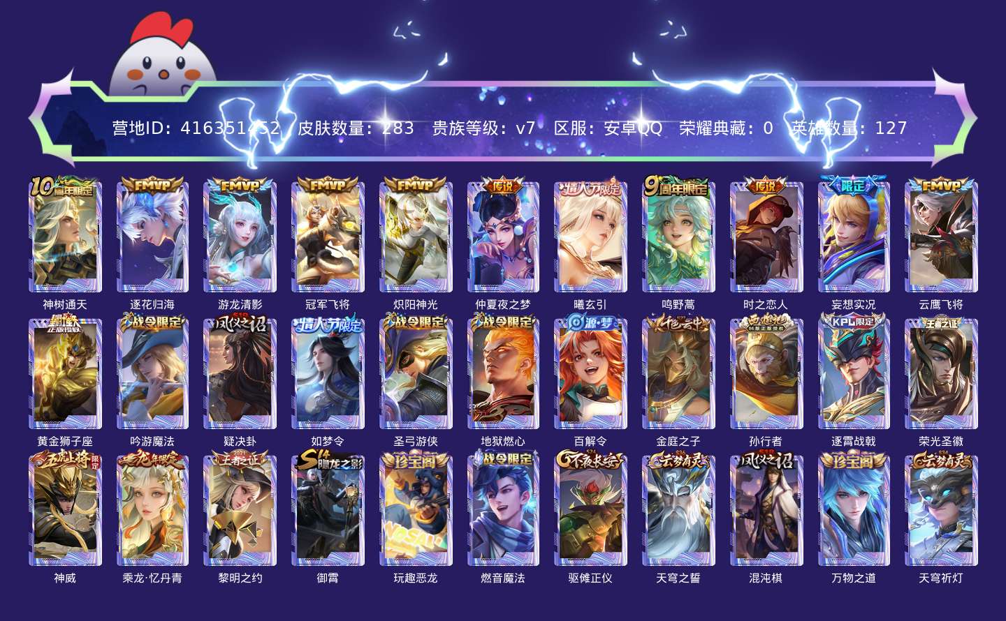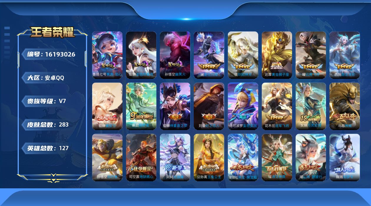 贵族等级:v7皮肤数:283情人节限定3 传说品质12 生肖限定3 英雄数:127