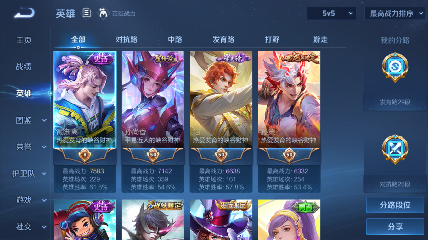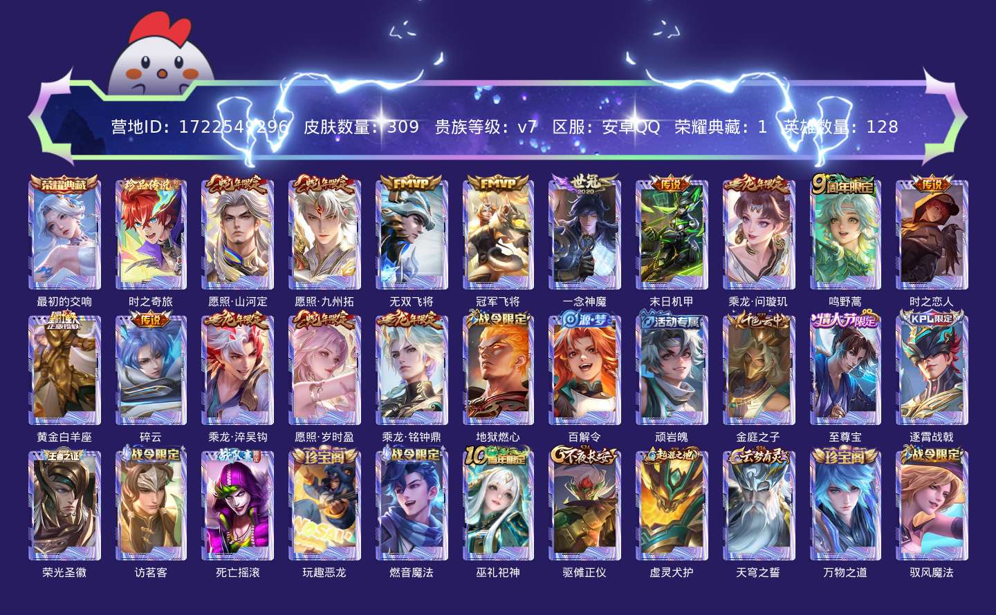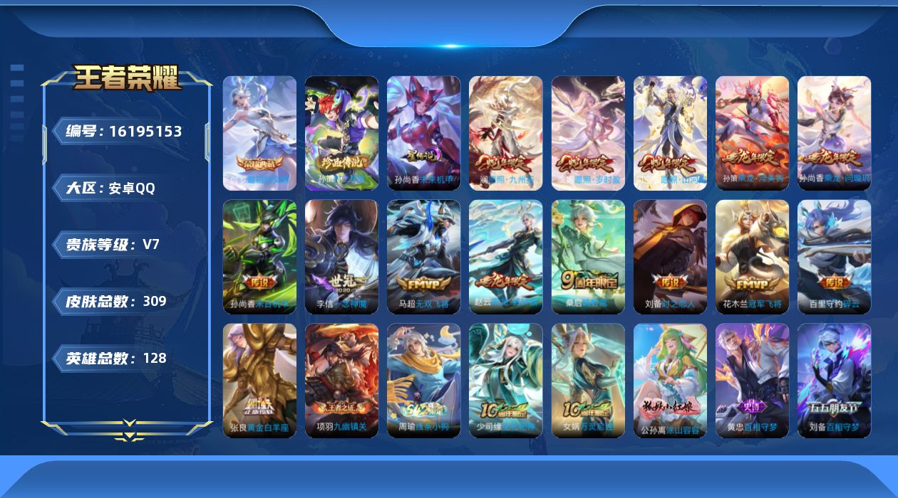 贵族等级:v7皮肤数:309传说品质14 生肖限定6 情人节限定1 荣耀典藏1 珍品传说1 英雄数:128