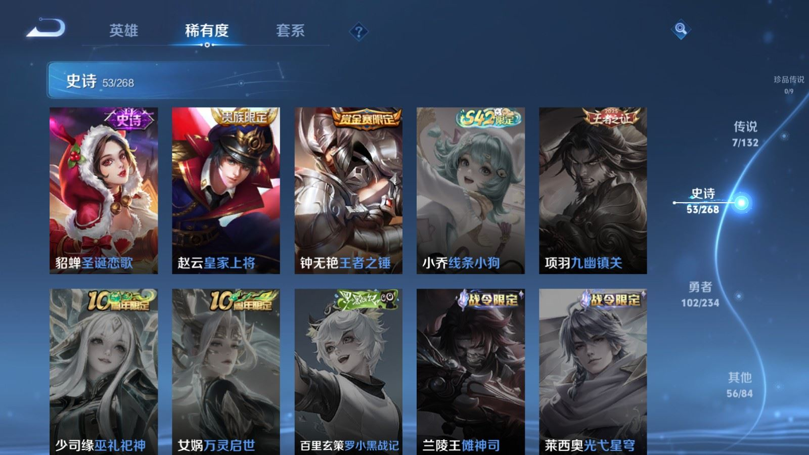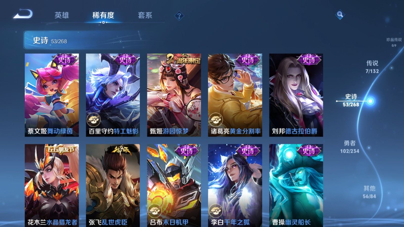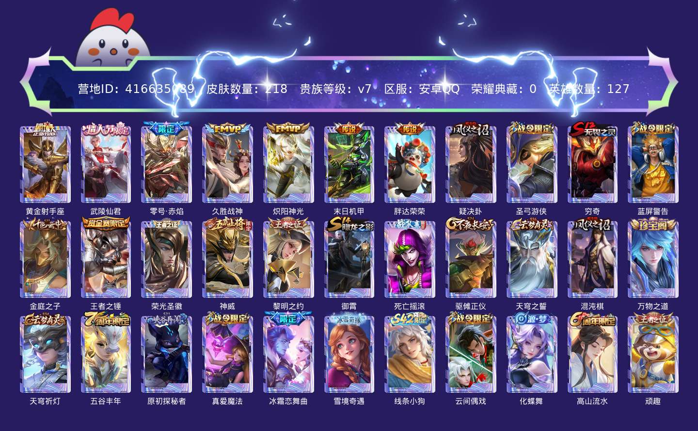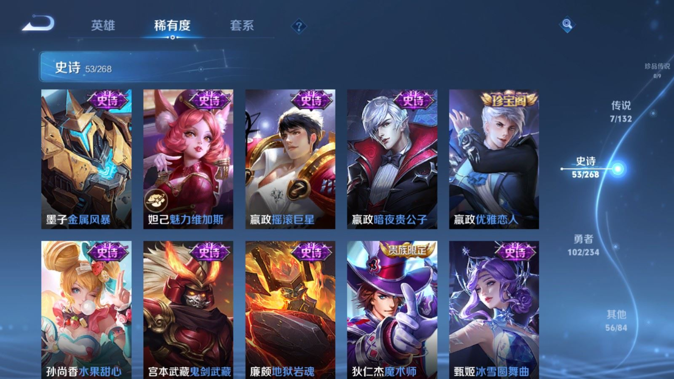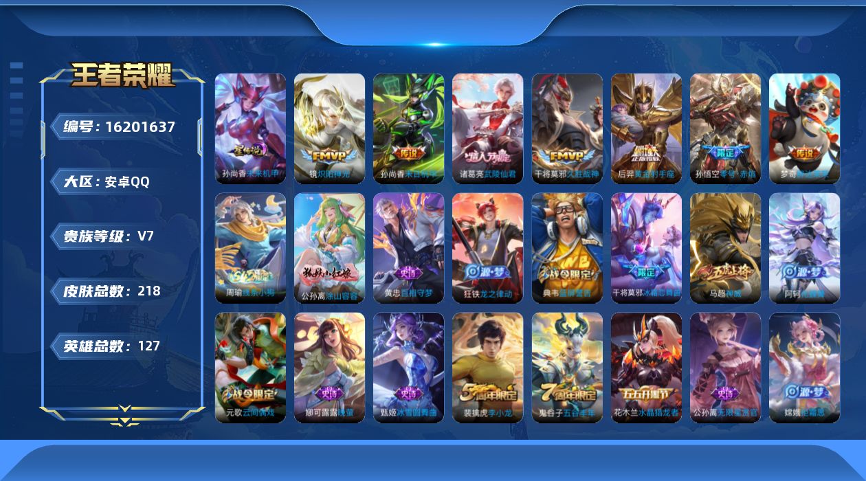 贵族等级:v7皮肤数:218传说品质7 情人节限定1 英雄数:127