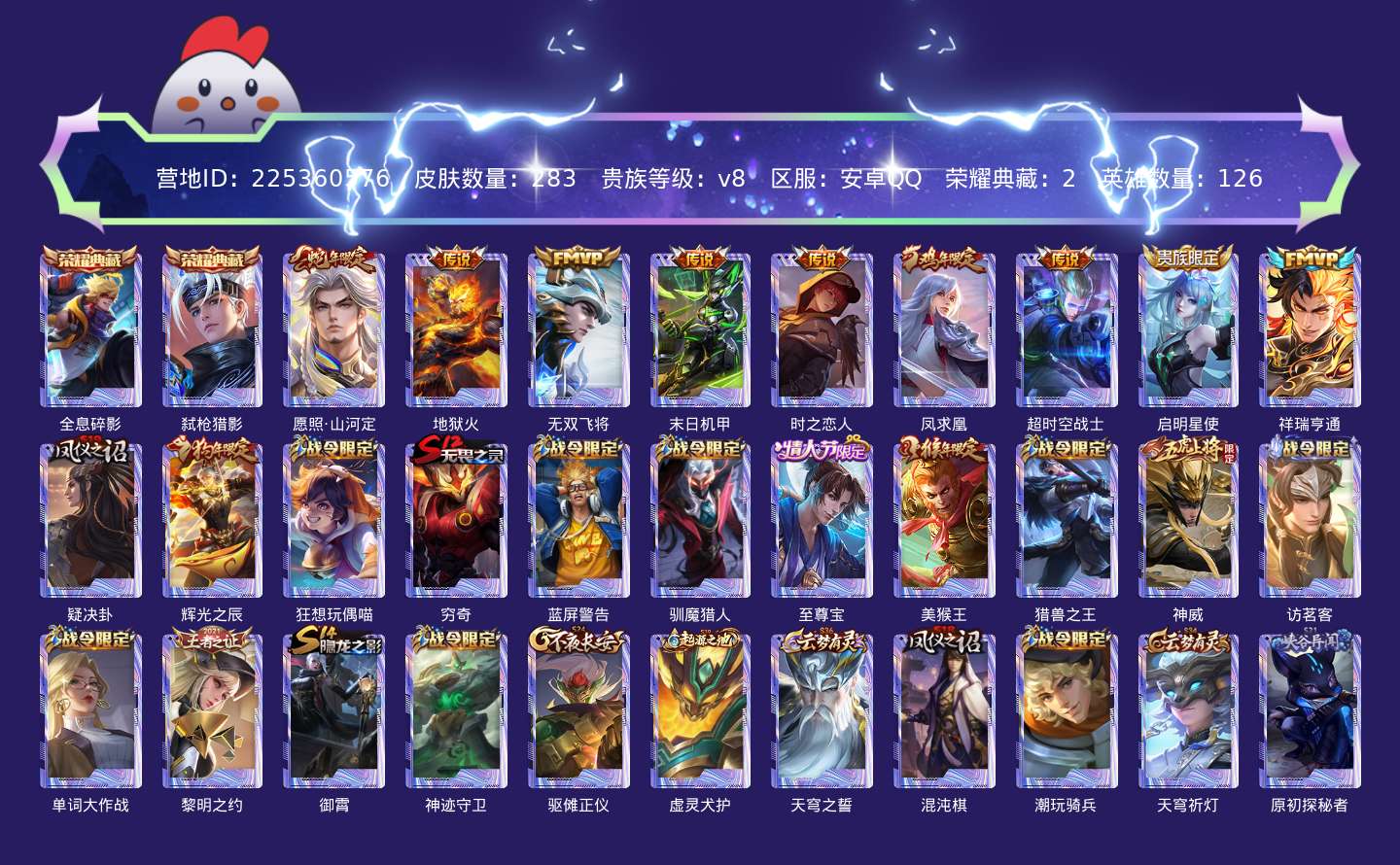 贵族等级:v8皮肤数:283生肖限定5 传说品质9 情人节限定1 荣耀典藏2 英雄数:126