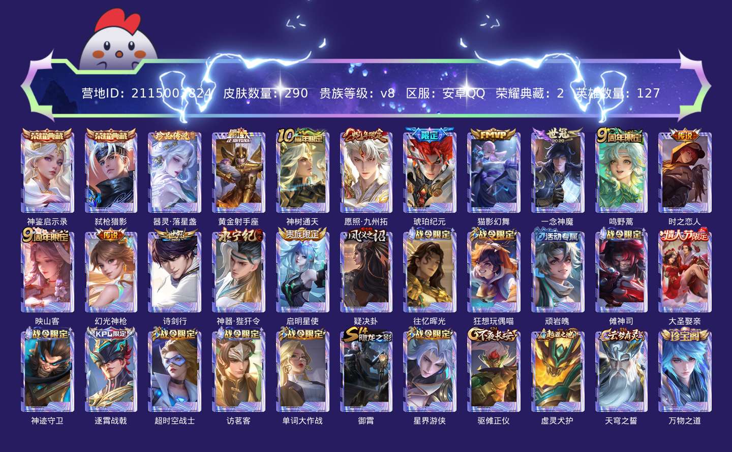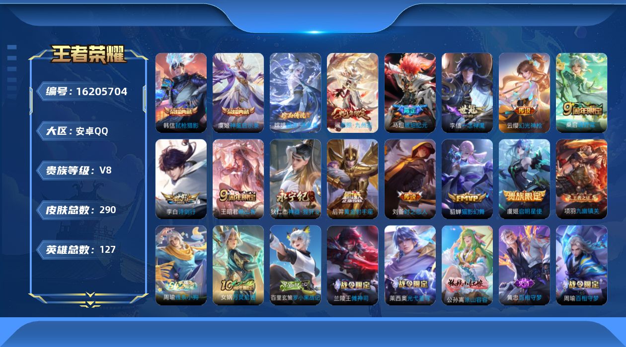 贵族等级:v8皮肤数:290传说品质13 生肖限定4 情人节限定1 珍品传说1 荣耀典藏2 英雄数:127