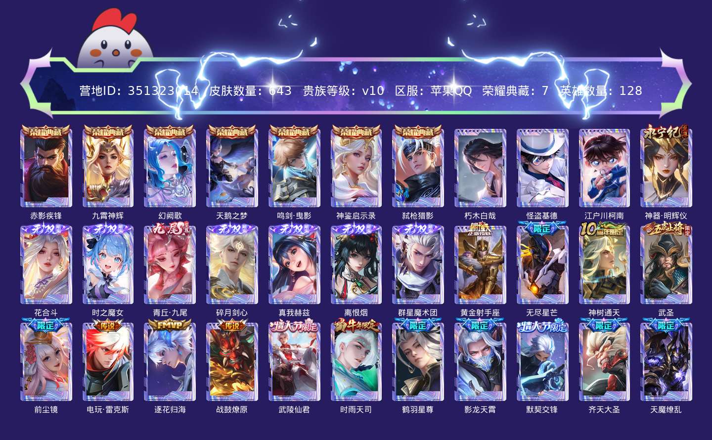 贵族等级:v10皮肤数:643生肖限定34 传说品质110 情人节限定16 荣耀典藏7 无双8 珍品传说3 英雄数:128