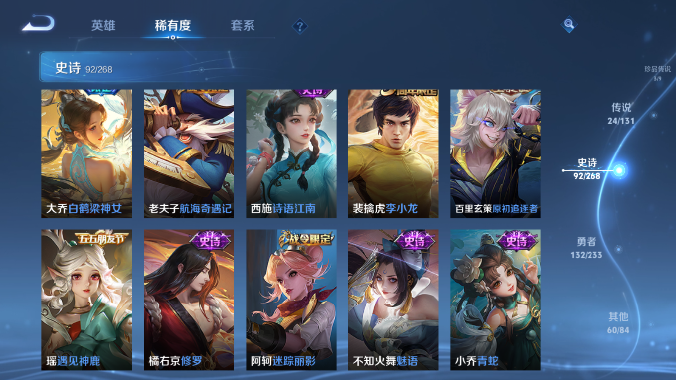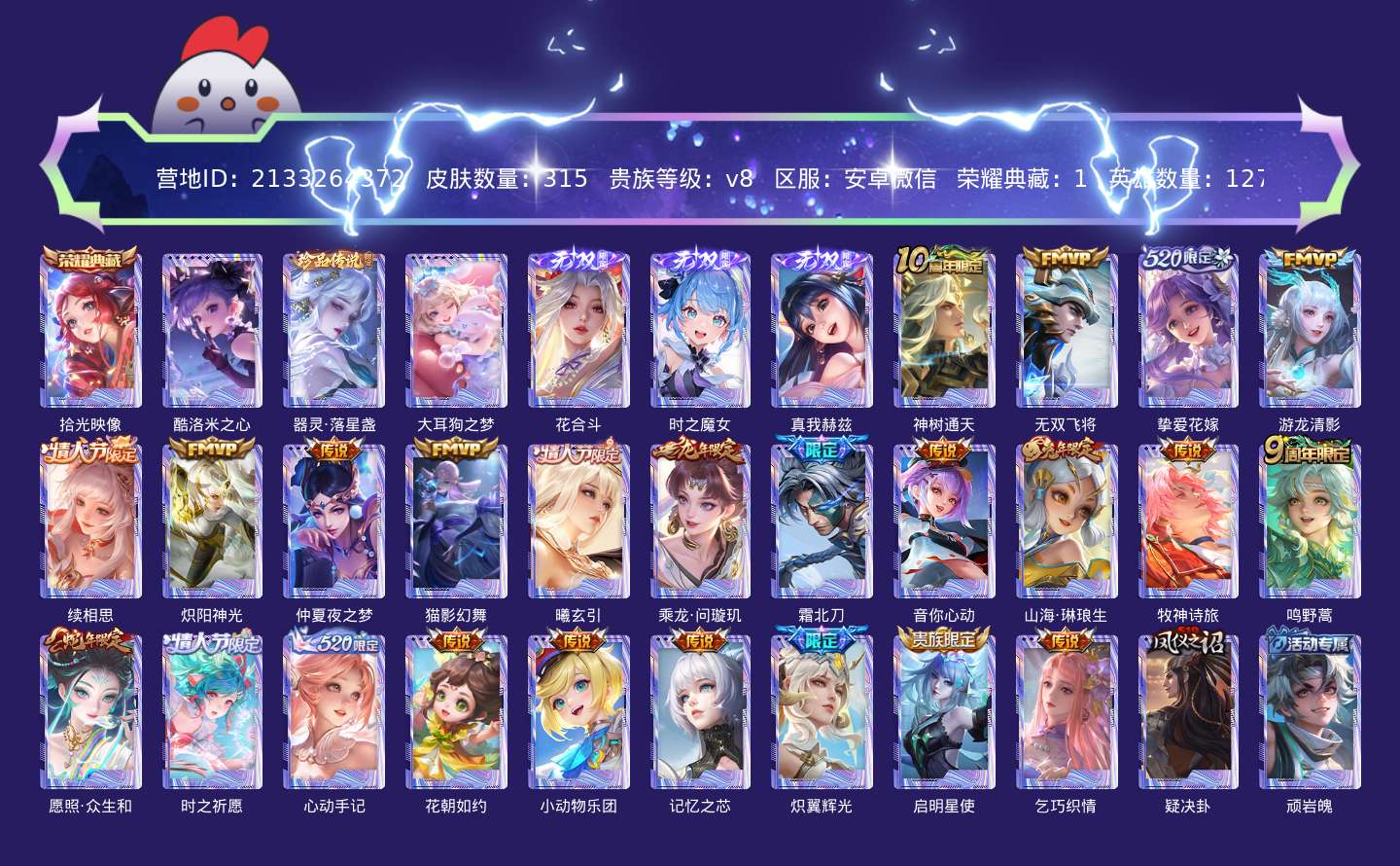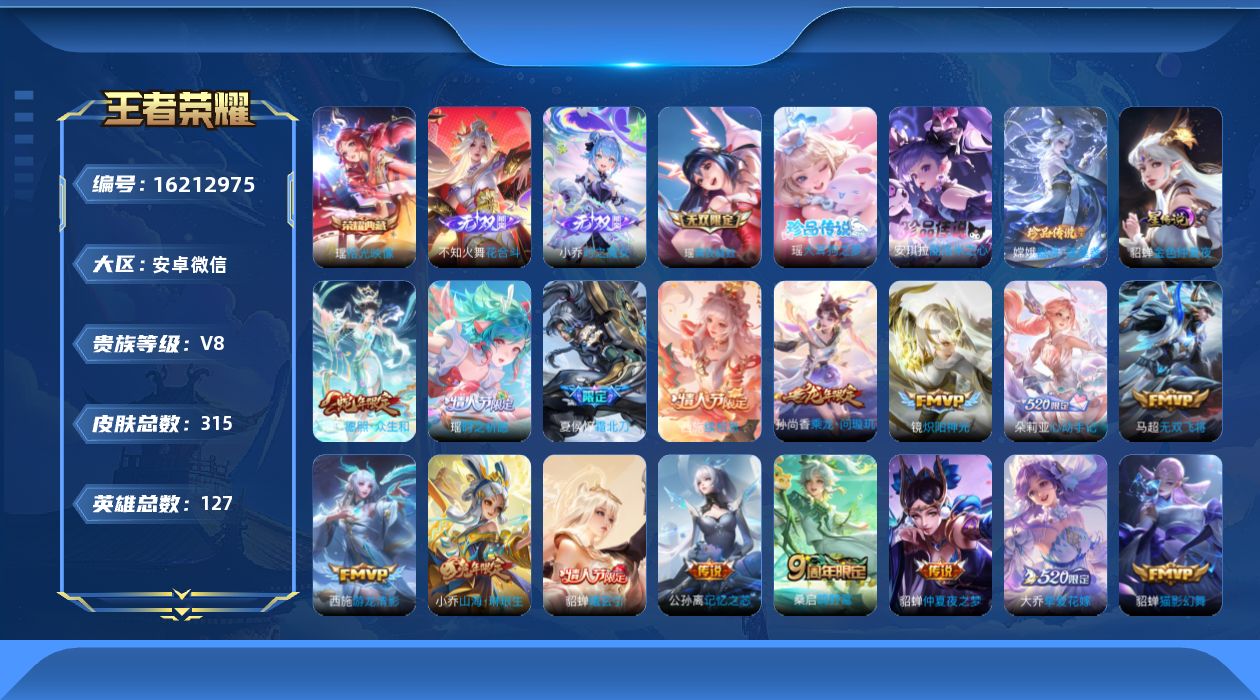 贵族等级:v8皮肤数:315传说品质24 情人节限定4 无双3 生肖限定7 珍品传说3 荣耀典藏1 英雄数:127