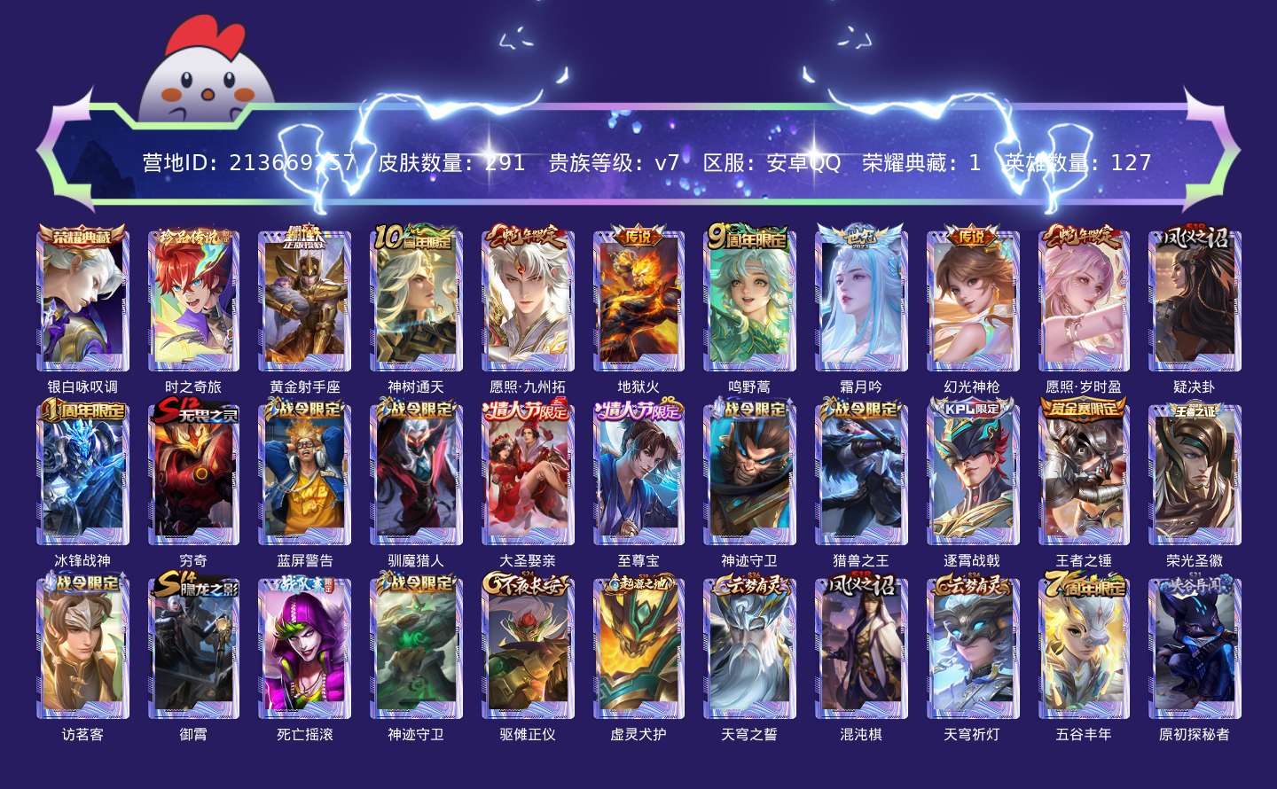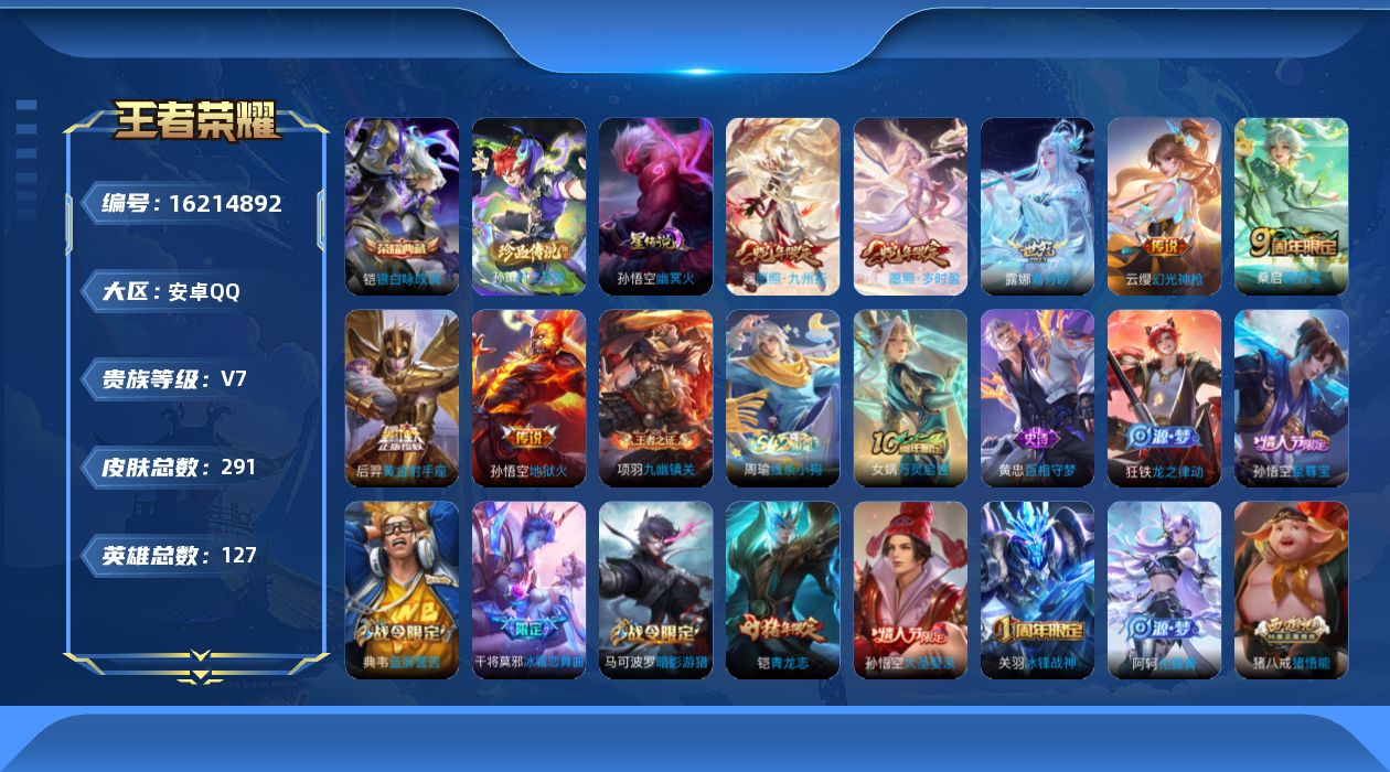 贵族等级:v7皮肤数:291传说品质8 生肖限定3 情人节限定3 珍品传说1 荣耀典藏1 英雄数:127
