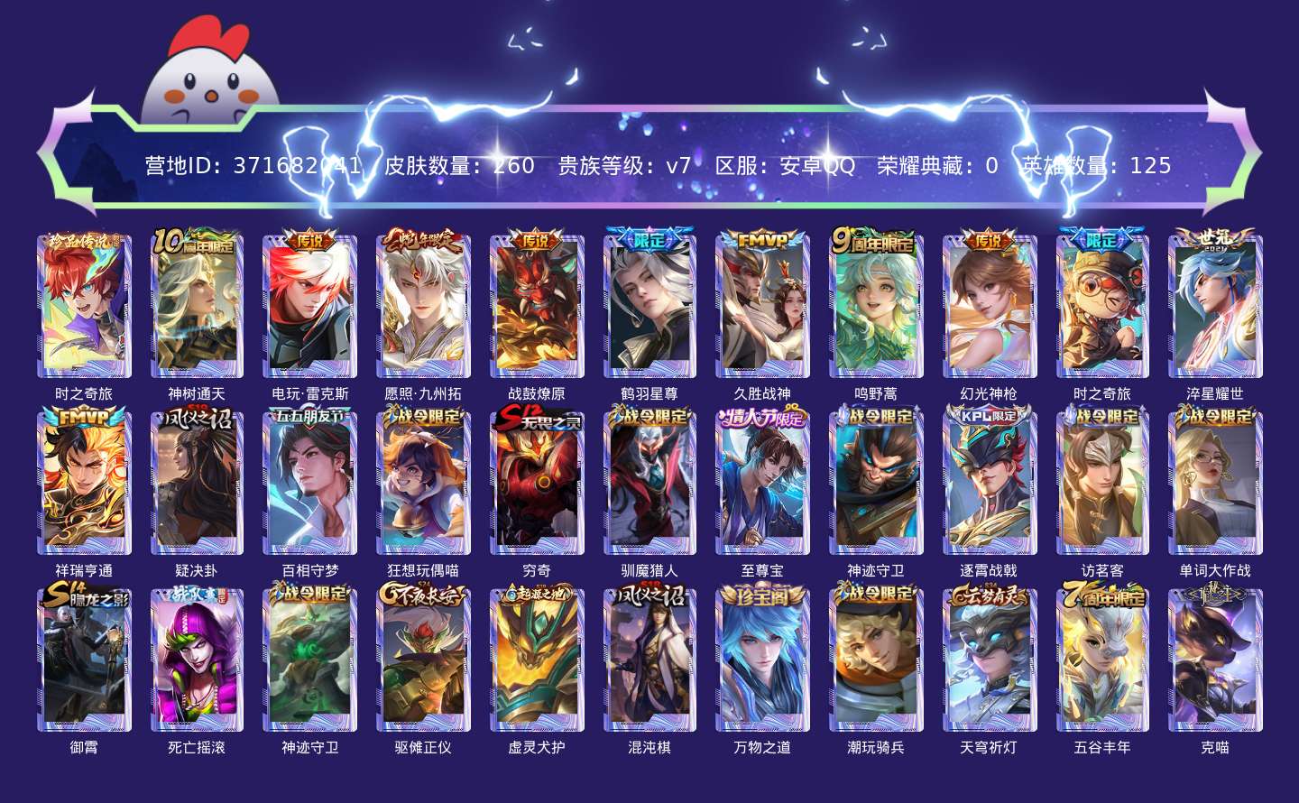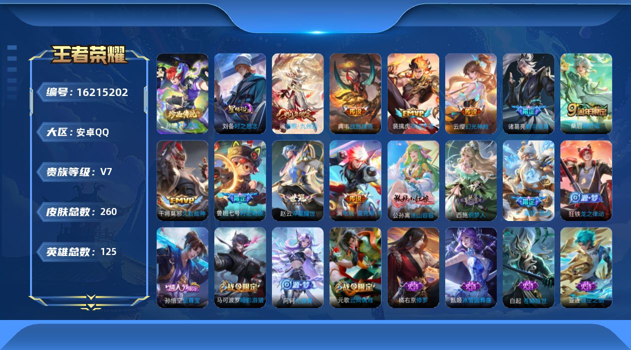 贵族等级:v7皮肤数:260传说品质11 生肖限定1 情人节限定1 珍品传说1 英雄数:125