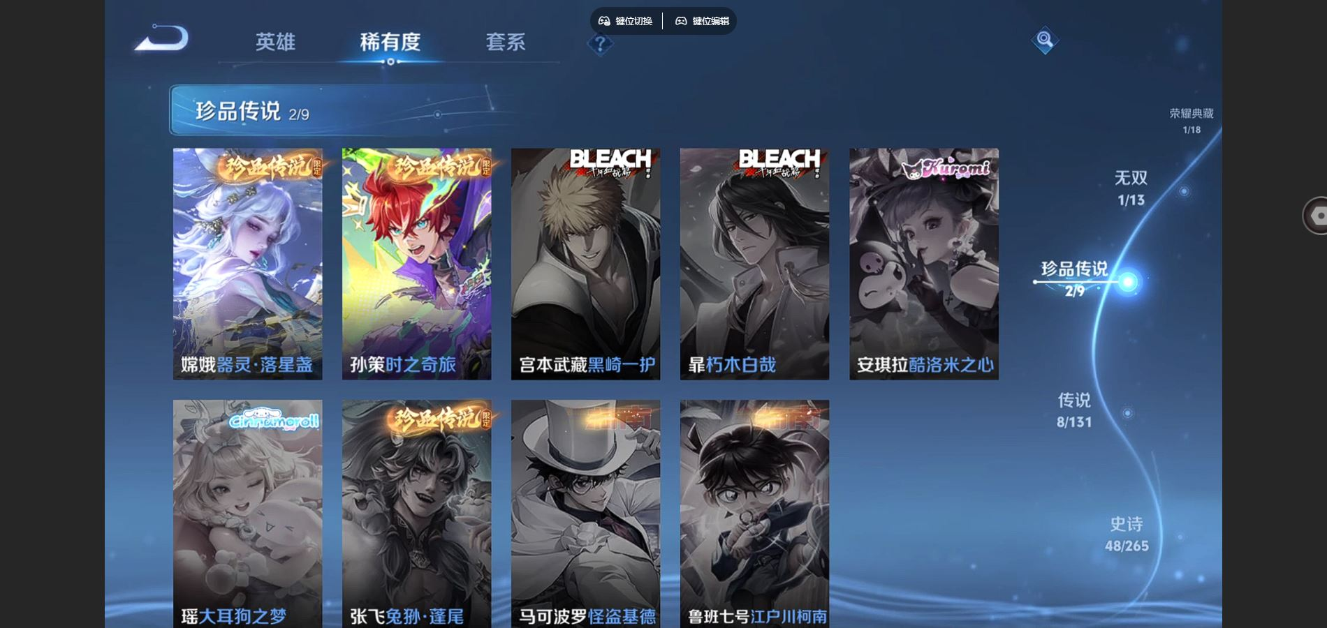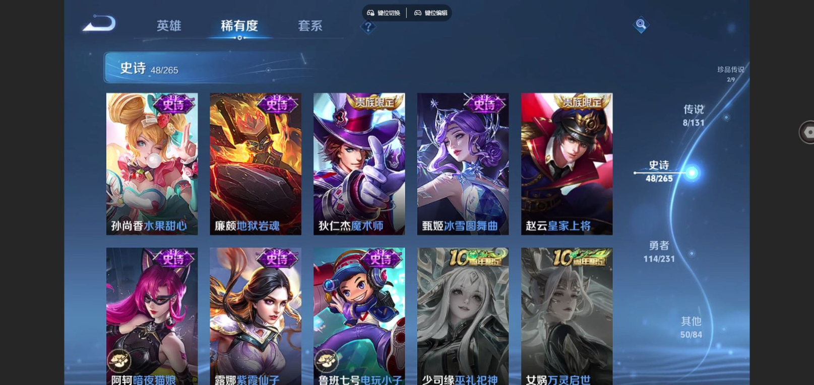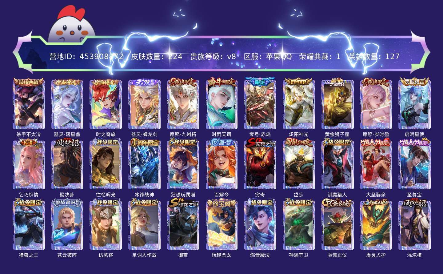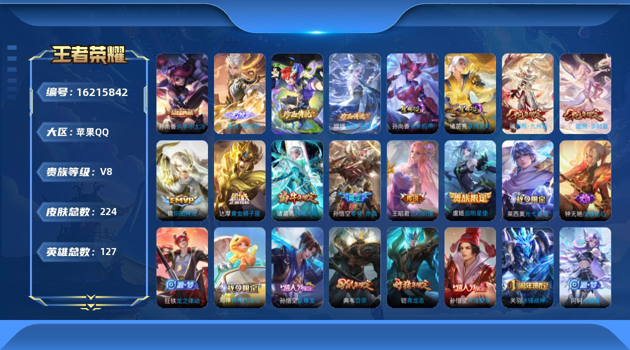 贵族等级:v8皮肤数:224传说品质8 生肖限定6 情人节限定3 荣耀典藏1 珍品传说2 无双1 英雄数:127