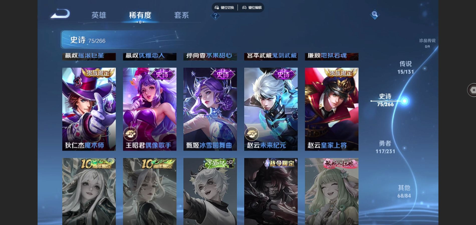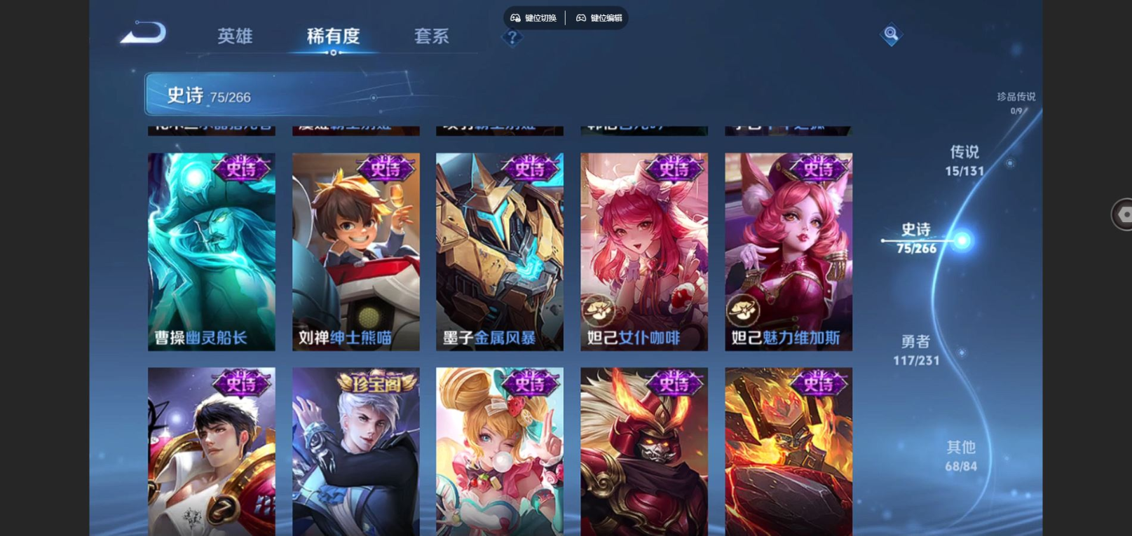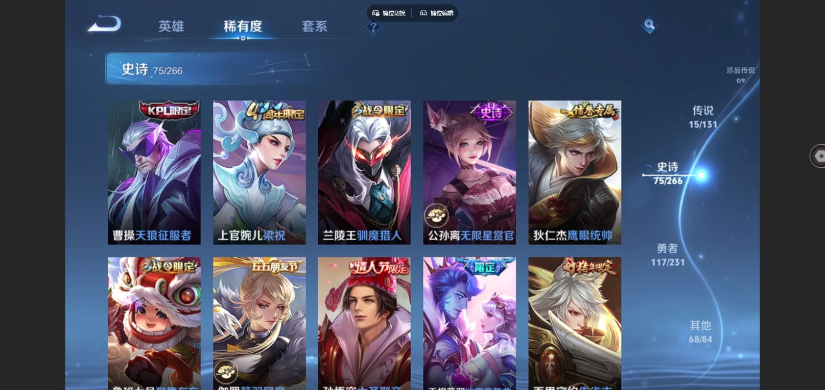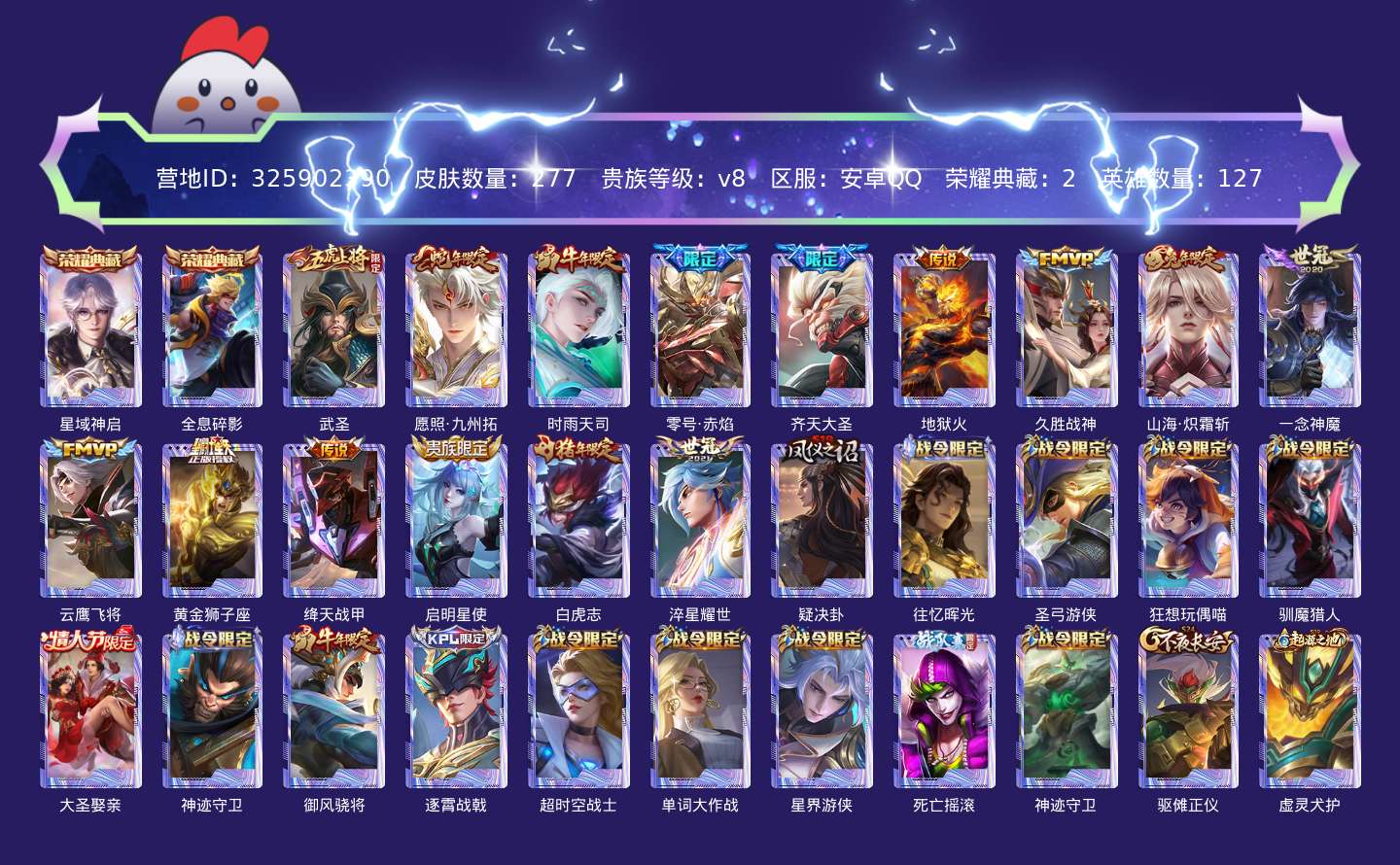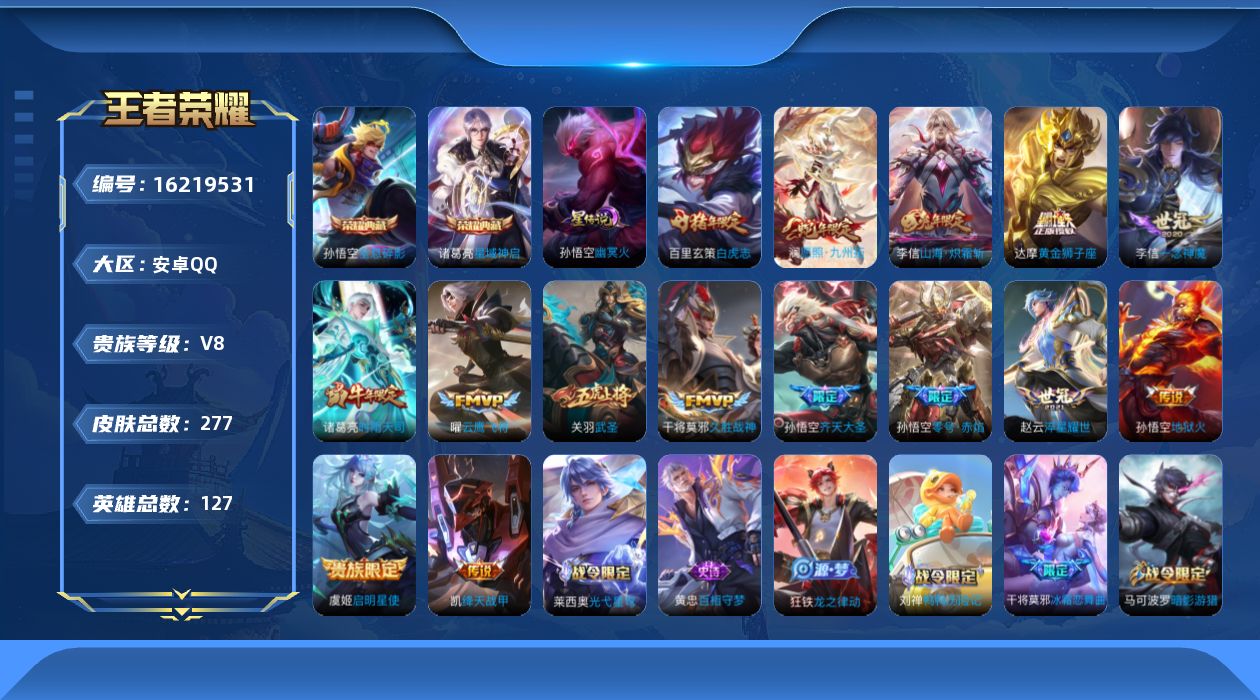 贵族等级:v8皮肤数:277传说品质15 生肖限定7 荣耀典藏2 情人节限定2 英雄数:127