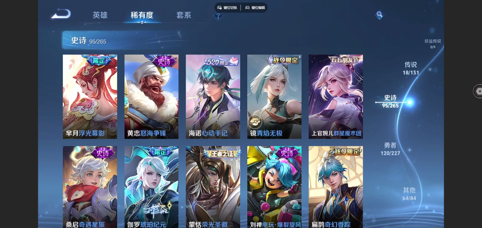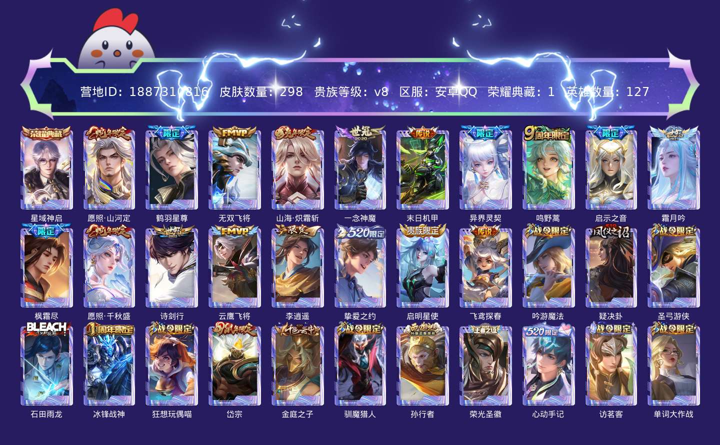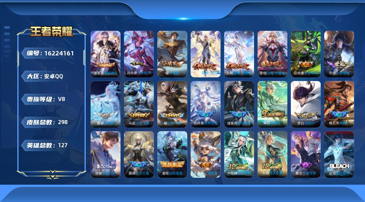 贵族等级:v8皮肤数:298传说品质18 生肖限定6 荣耀典藏1 情人节限定2 英雄数:127