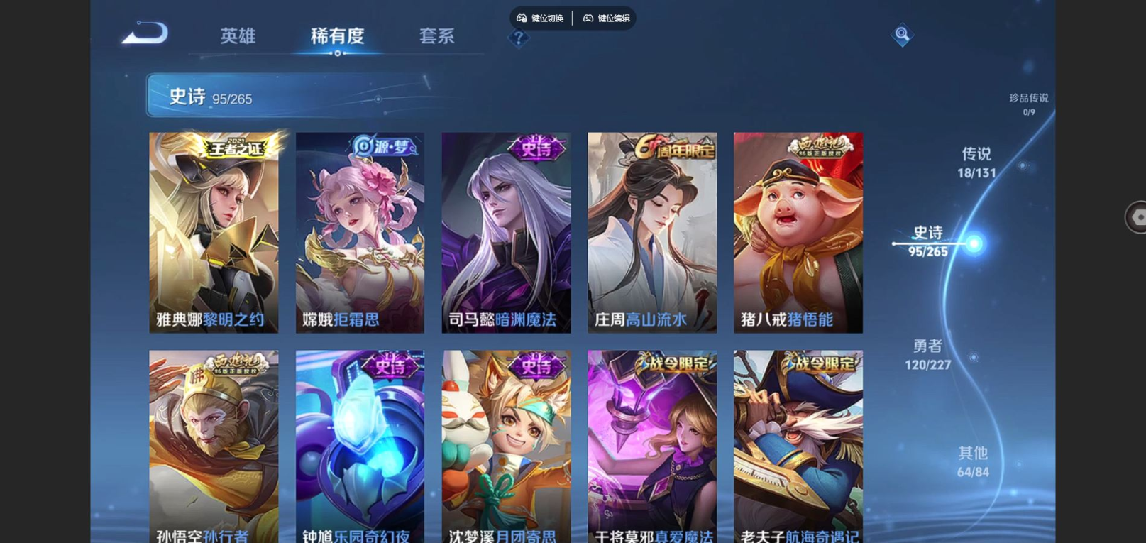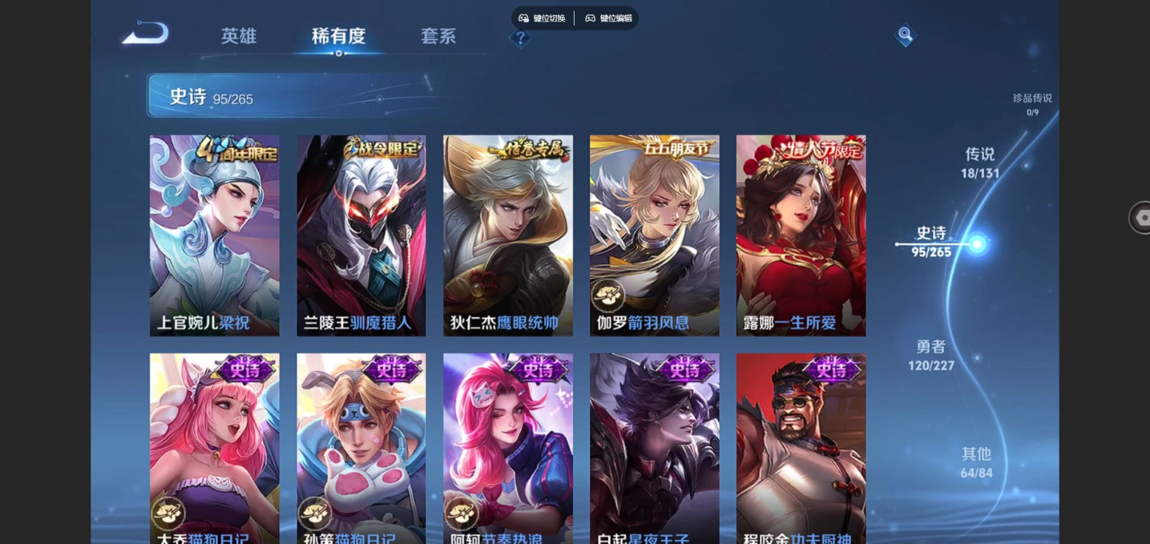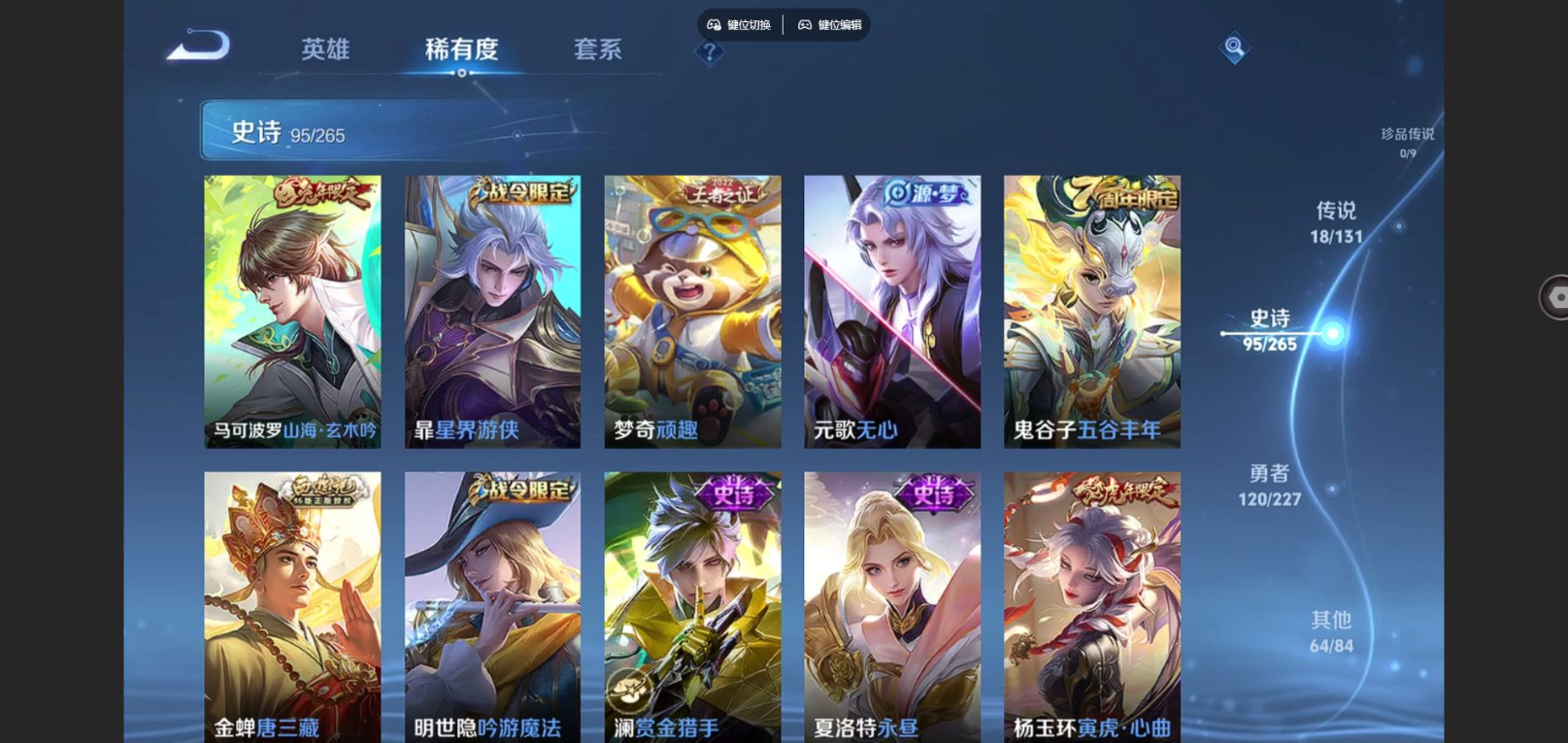 贵族等级:v8皮肤数:298传说品质18 生肖限定6 荣耀典藏1 情人节限定2 英雄数:127