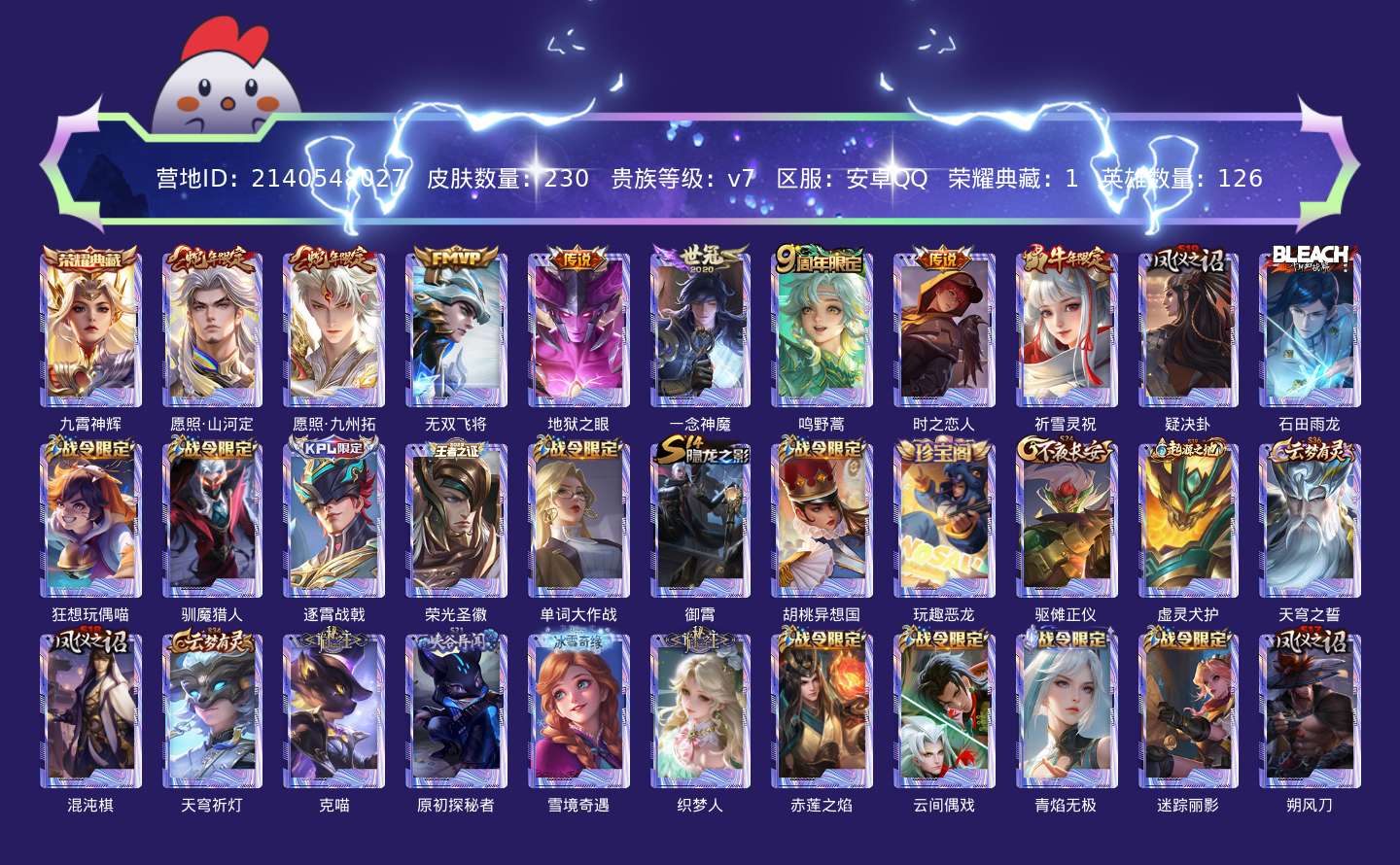 贵族等级:v7皮肤数:230传说品质8 生肖限定3 荣耀典藏1 英雄数:126