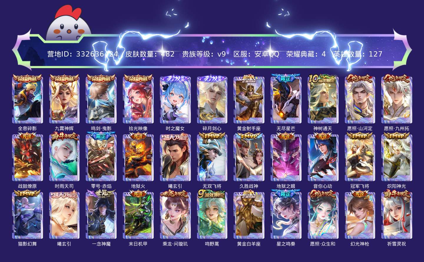 贵族等级:v9皮肤数:482传说品质39 生肖限定17 情人节限定5 荣耀典藏4 无双2 英雄数:127