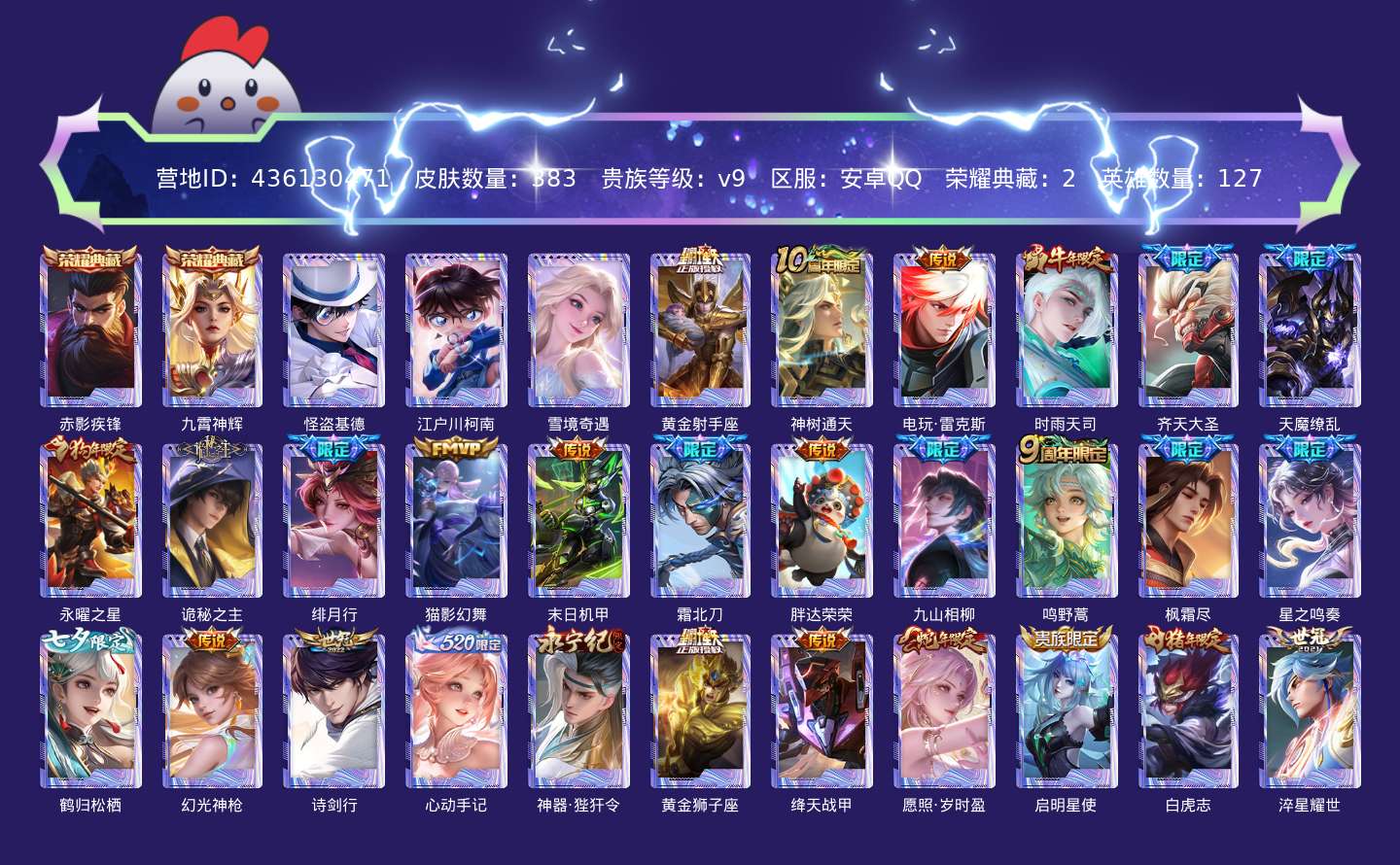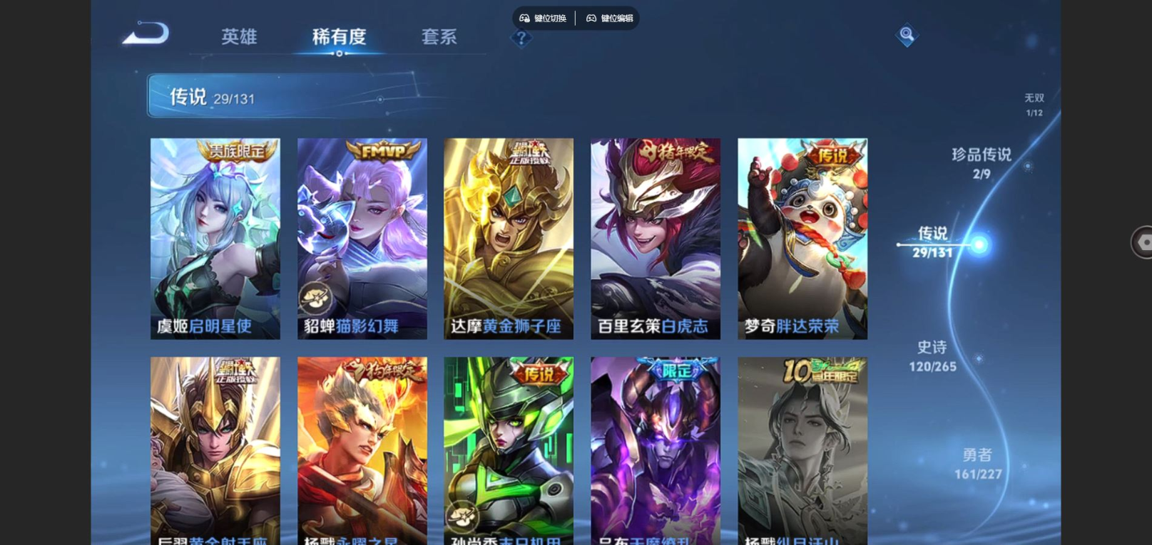 传说品质_后羿_黄金射手座传说品质_后羿_神树通天传说品质_澜_电玩·雷克斯传说品质_诸葛亮_时雨天司传说品质_孙悟空_齐天大圣传说品质_吕布_天魔缭乱传说品质_杨戬_永曜之星传说品质_元歌_诡秘之主传说品质_不知火舞_绯月行传说品质_貂蝉_猫影幻舞传说品质_孙尚香_末日机甲传说品质_夏侯惇_霜北刀传说品质_梦奇_胖达荣荣传说品质_司马懿_九山相柳传说品质_桑启_鸣野蒿传说品质_橘右京_枫霜尽传说品质_杨玉环_星之鸣奏传说品质_云缨_鹤归松栖传说品质_云缨_幻光神枪传说品质_李白_诗剑行传说品质_朵莉亚_心动手记传说品质_狄仁杰_神器·狴犴令传说品质_达摩_黄金狮子座传说品质_铠_绛天战甲传说品质_虞姬_愿照·岁时盈传说品质_虞姬_启明星使传说品质_百里玄策_白虎志传说品质_赵云_淬星耀世传说品质_裴擒虎_寅虎·赤拳